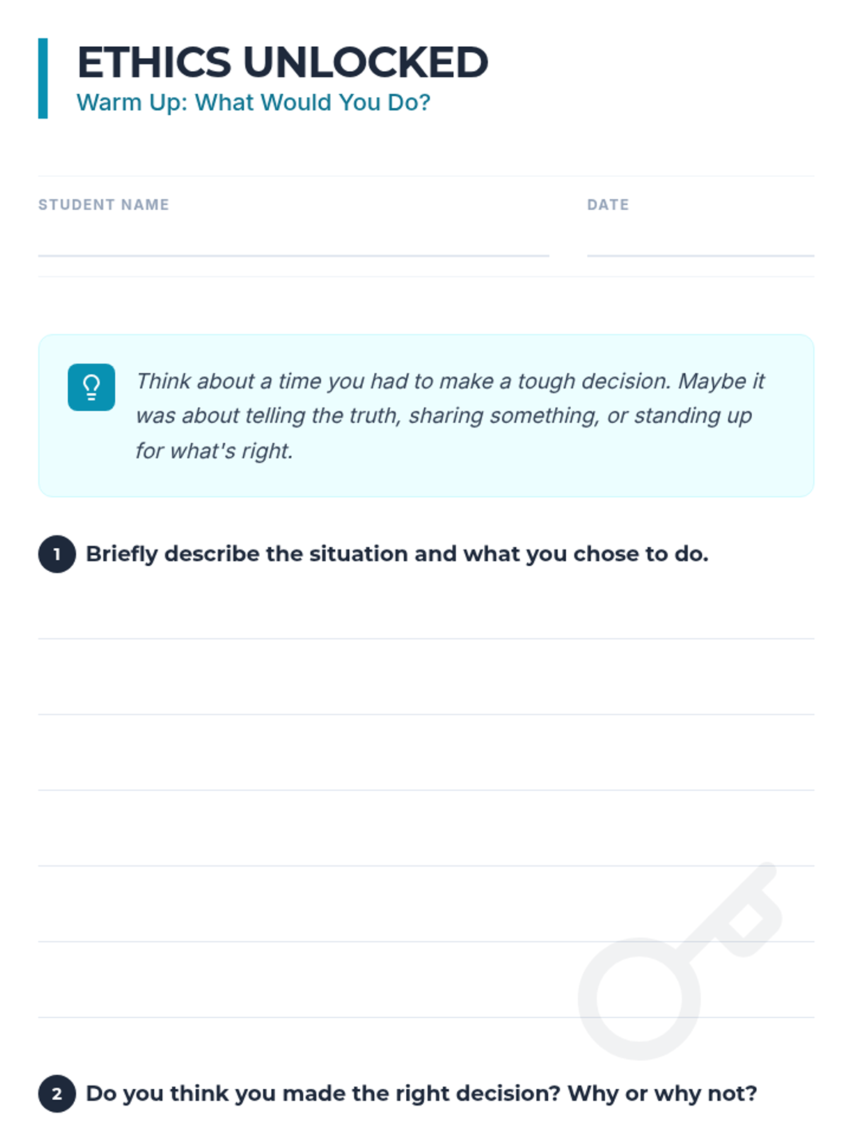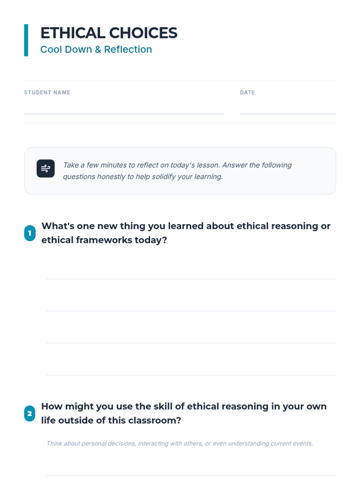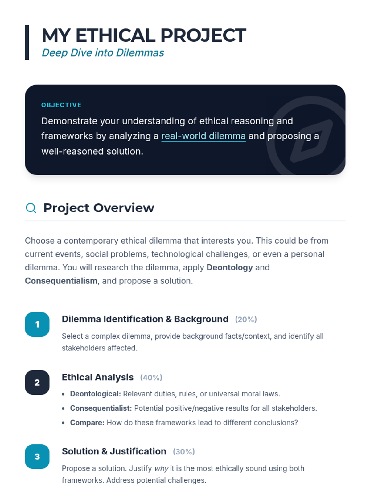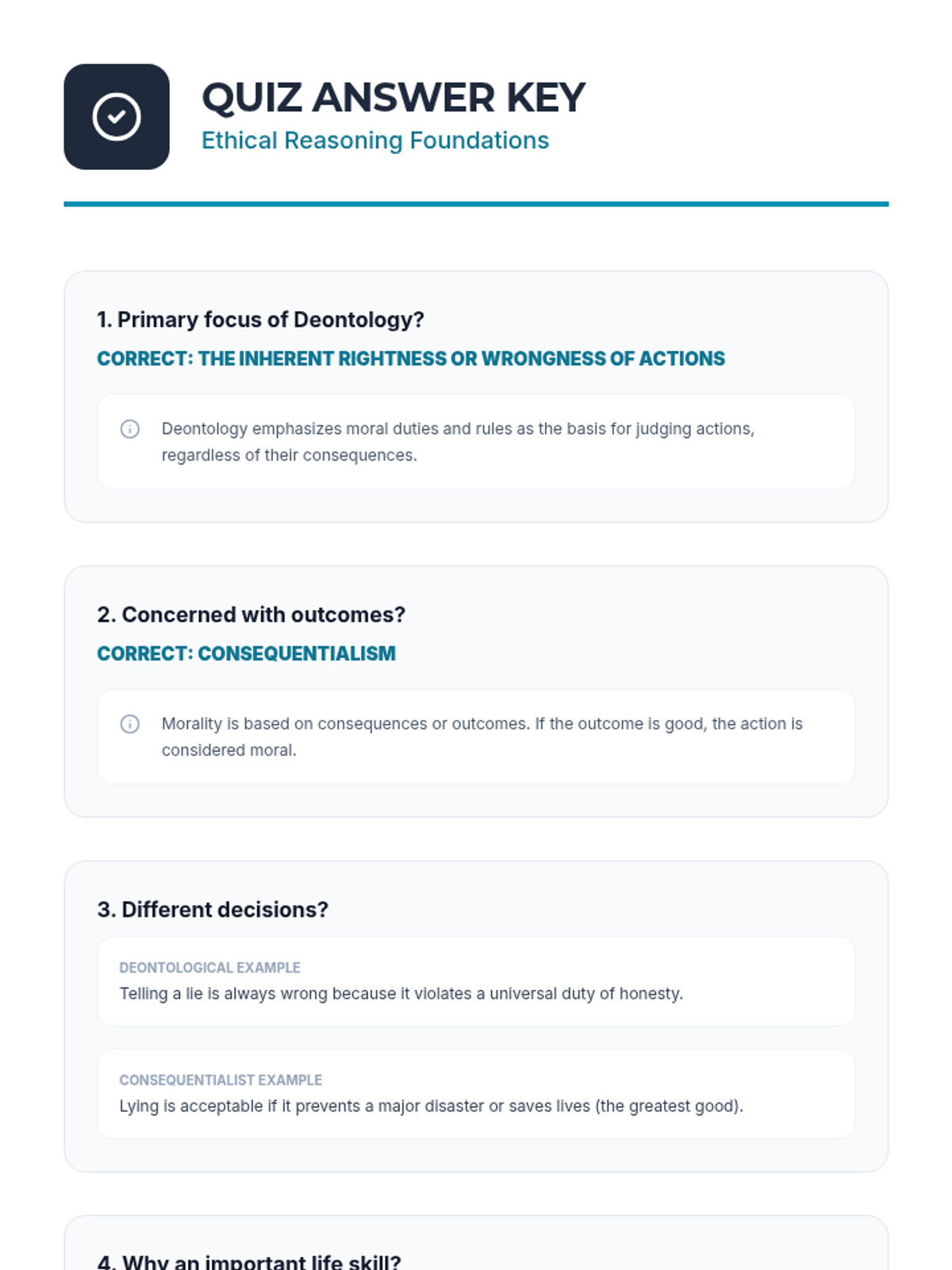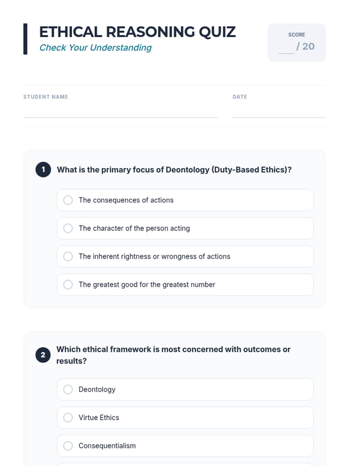 A comprehensive 1-hour lesson for IGCSE students exploring ethical reasoning, deontology, and consequentialism through interactive dilemmas.