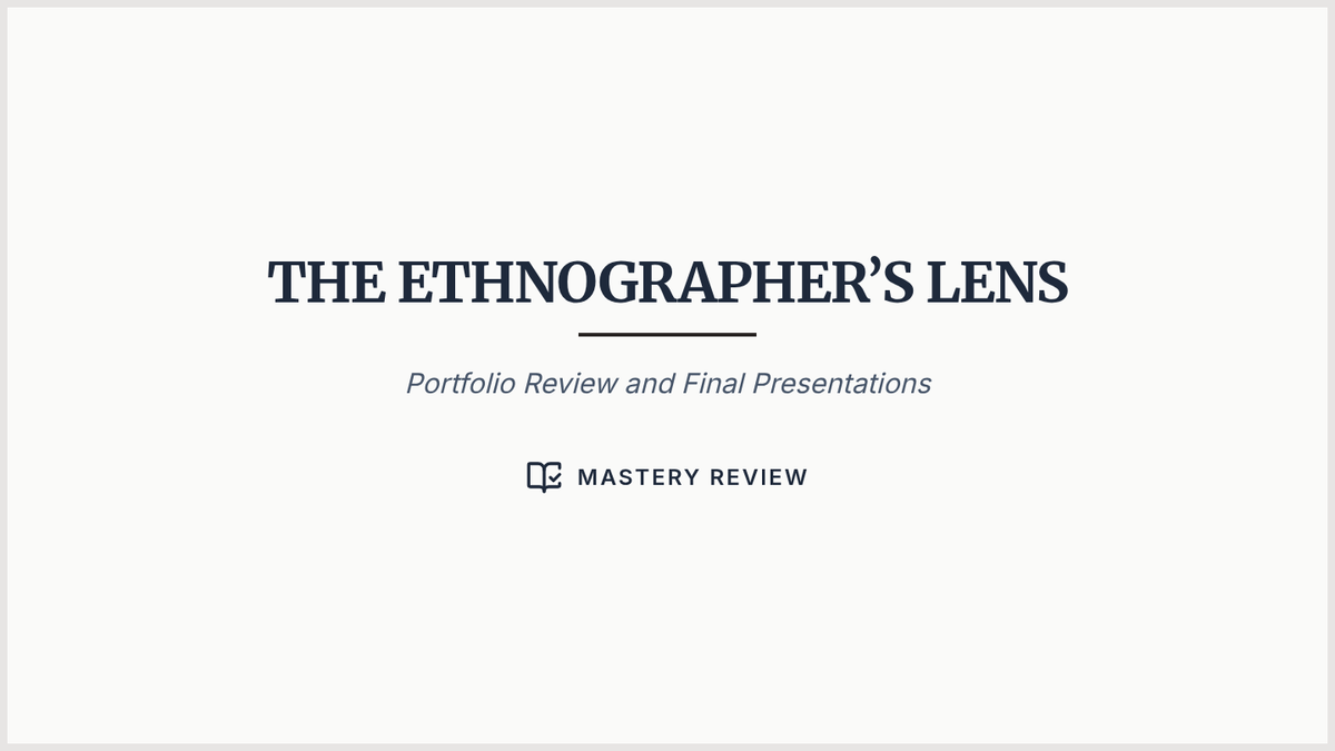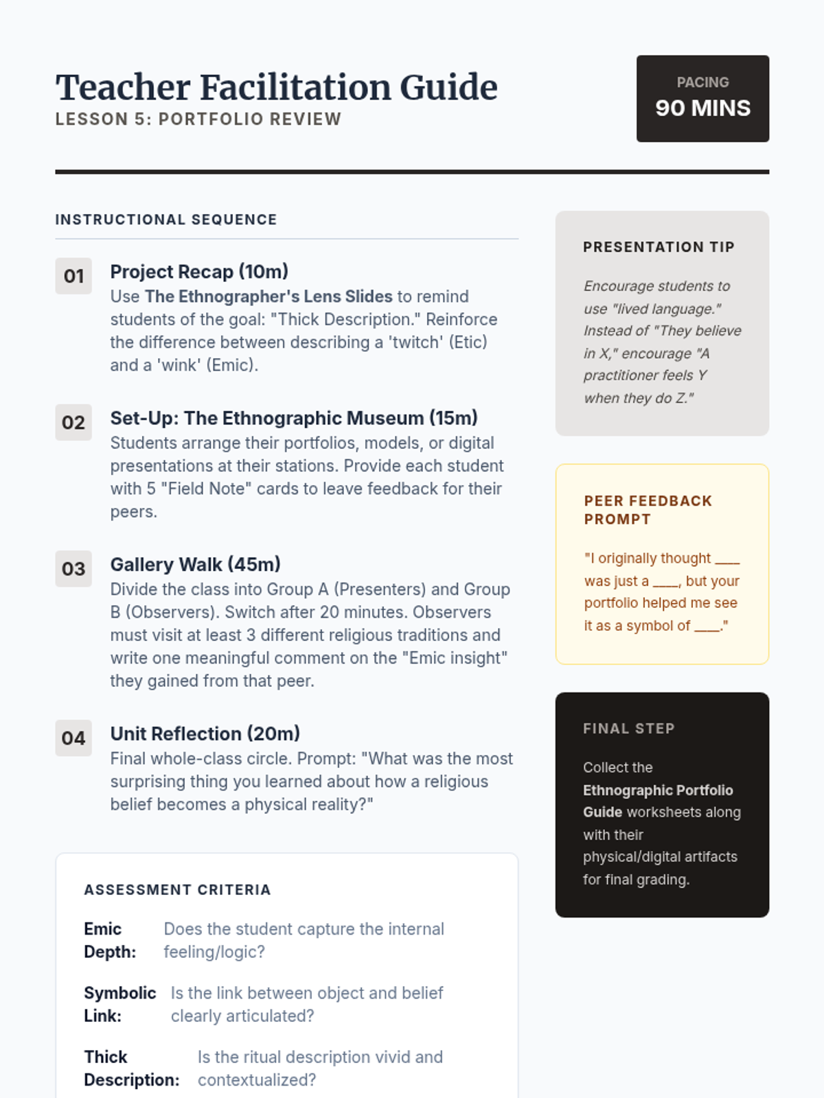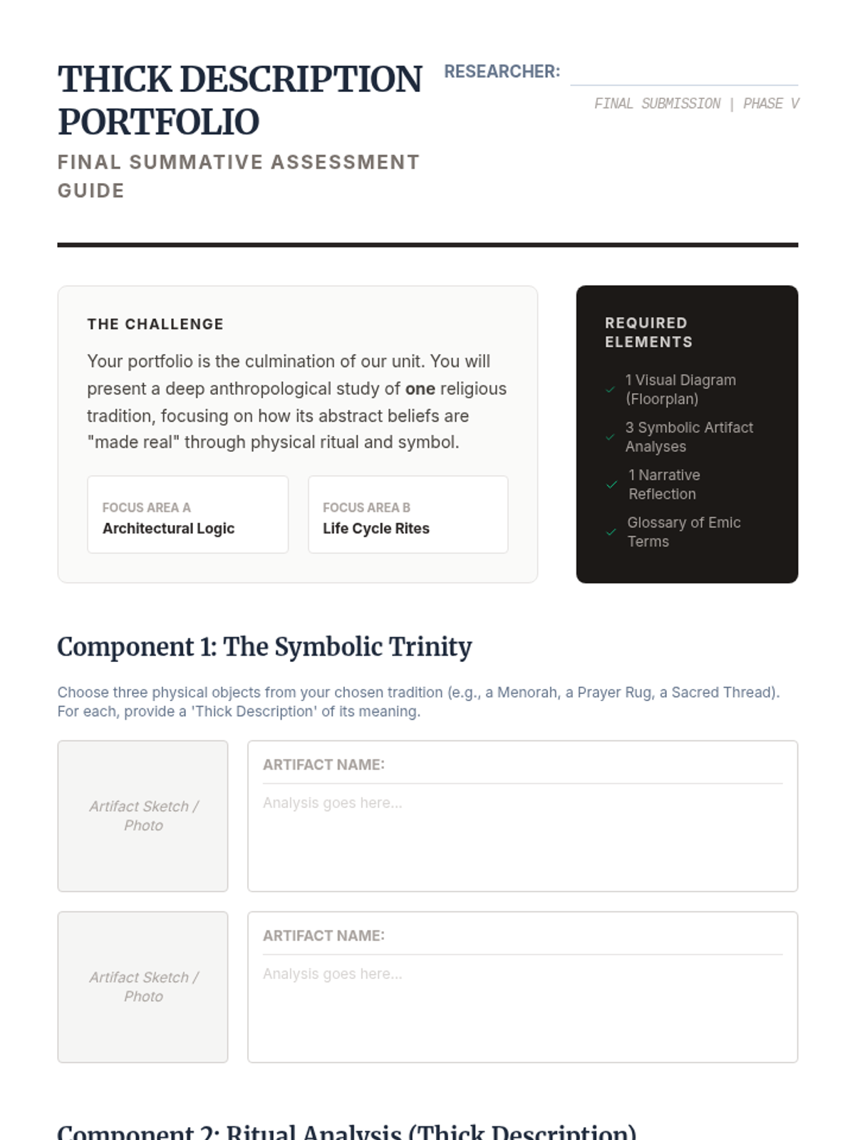 A cumulative review and presentation of student ethnographic portfolios documenting the lived practices of a specific religion.