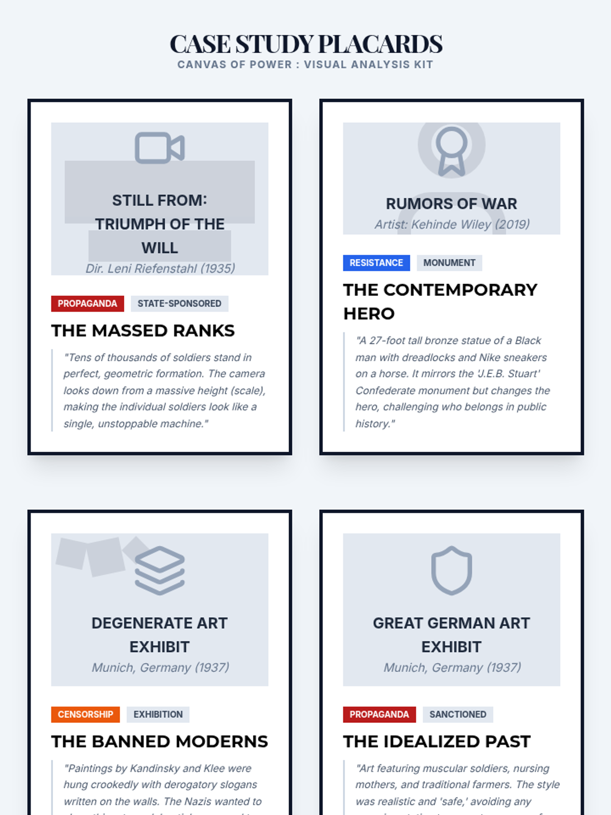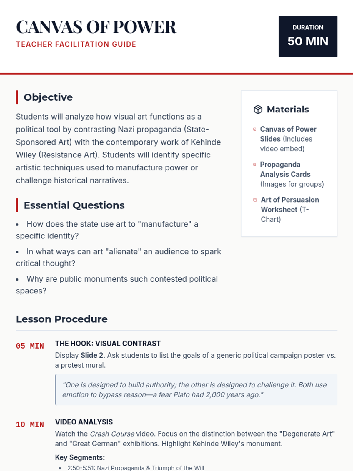 Students will explore the tension between art used for state propaganda (Nazi Germany) and art used for social resistance (Kehinde Wiley). This lesson uses the Crash Course Political Theory video 'Should Art Be Political?' to ground a comparative analysis of visual techniques and the power of public monuments.