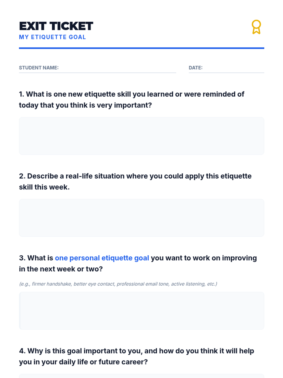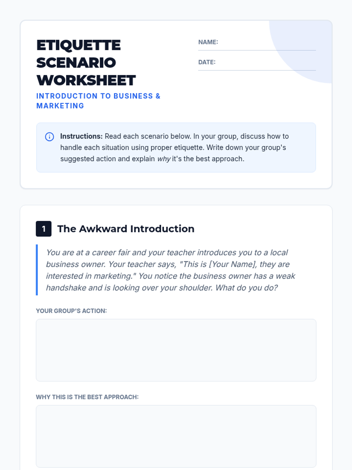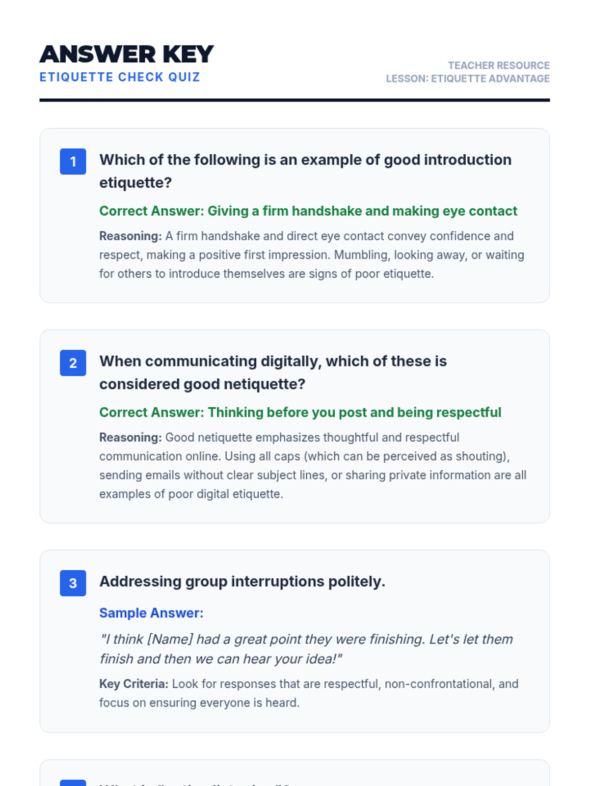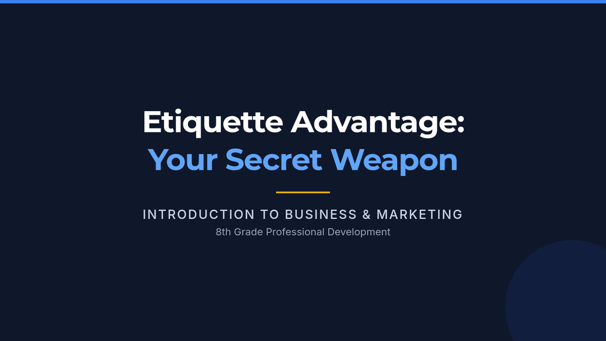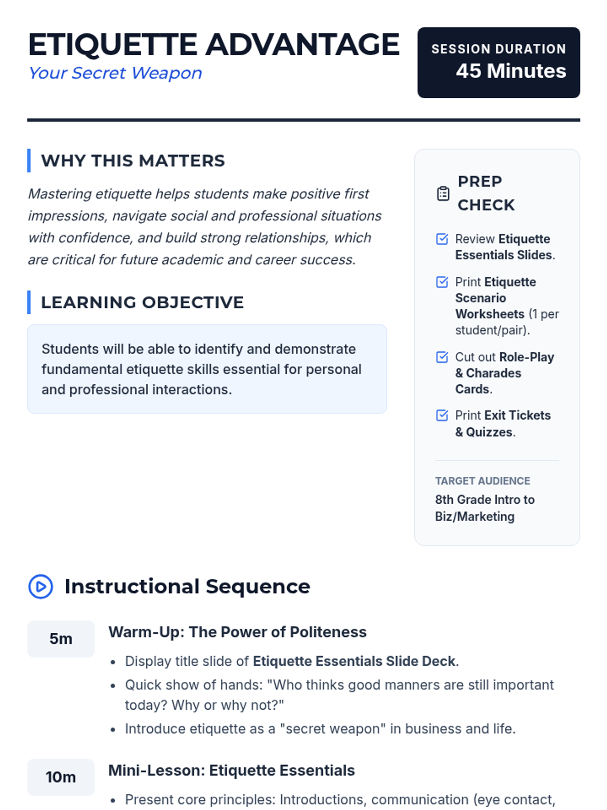 This lesson introduces 8th-grade Introduction to Business and Marketing students to fundamental etiquette skills crucial for personal and professional success. It will equip students with practical knowledge and confidence to navigate various social and business situations effectively in one 45-minute session.
