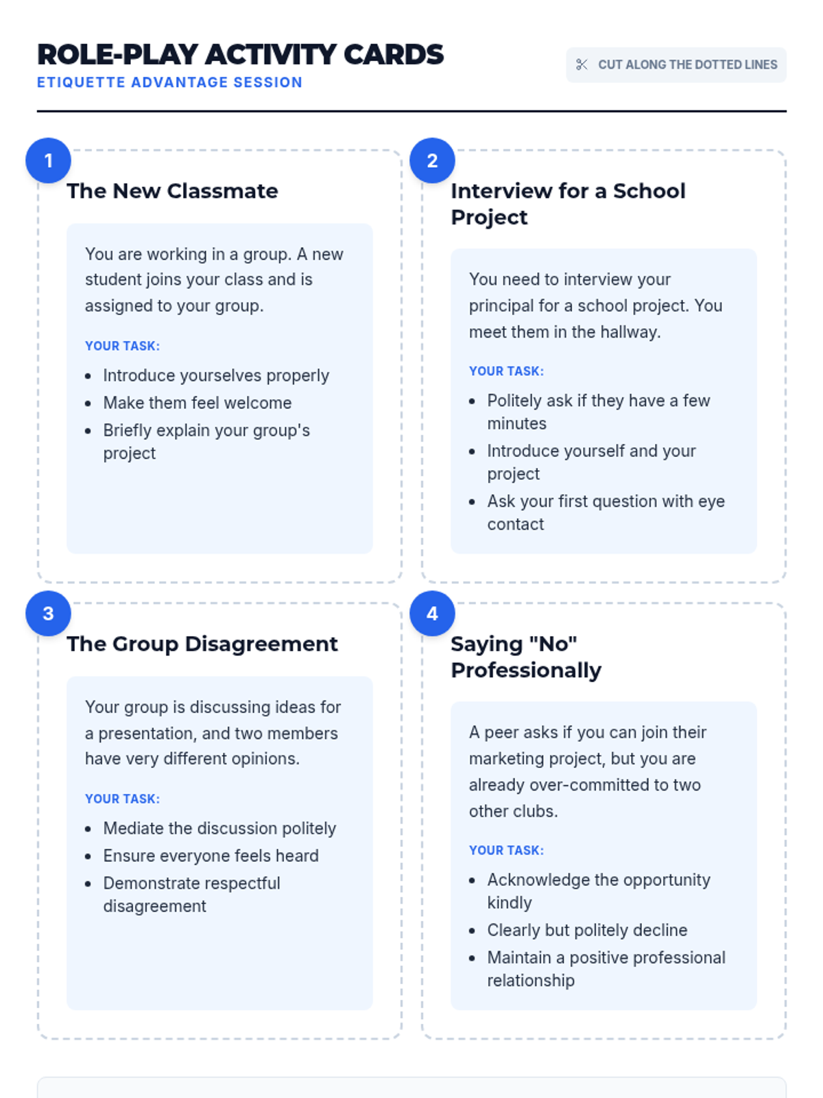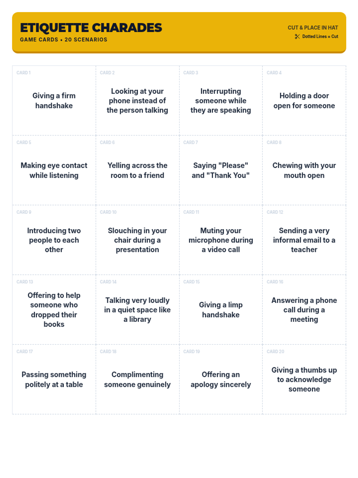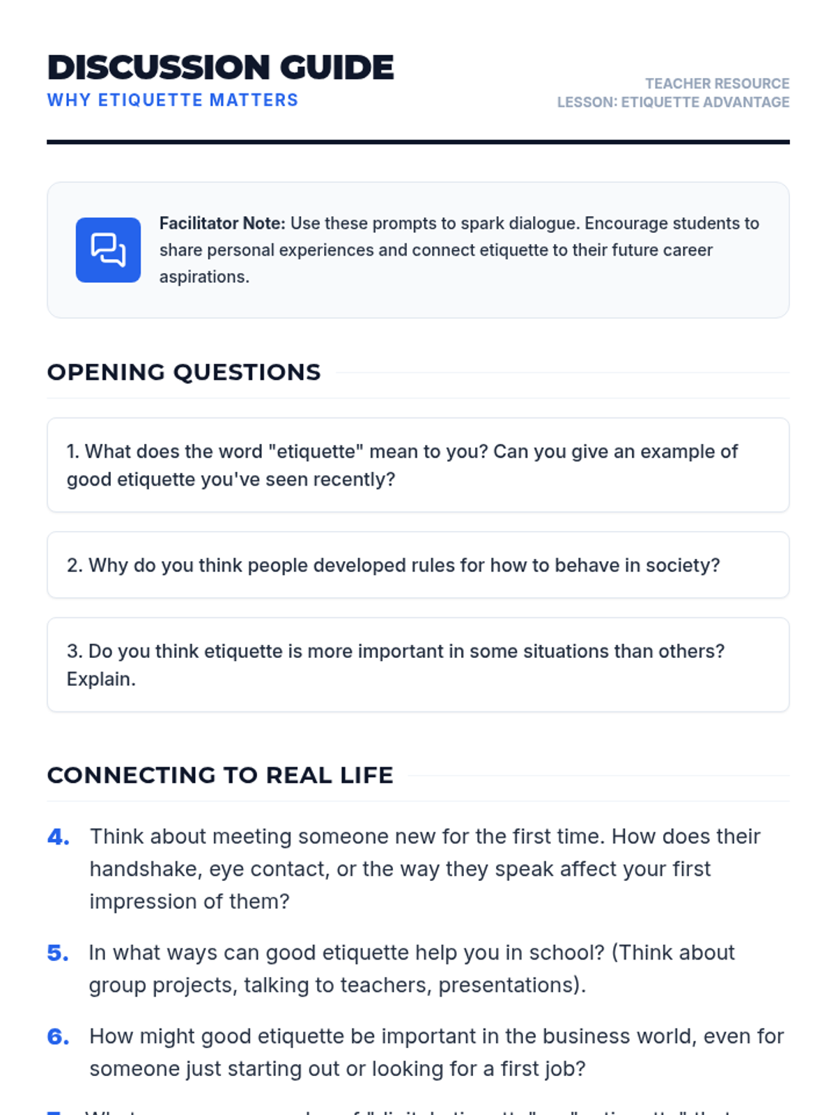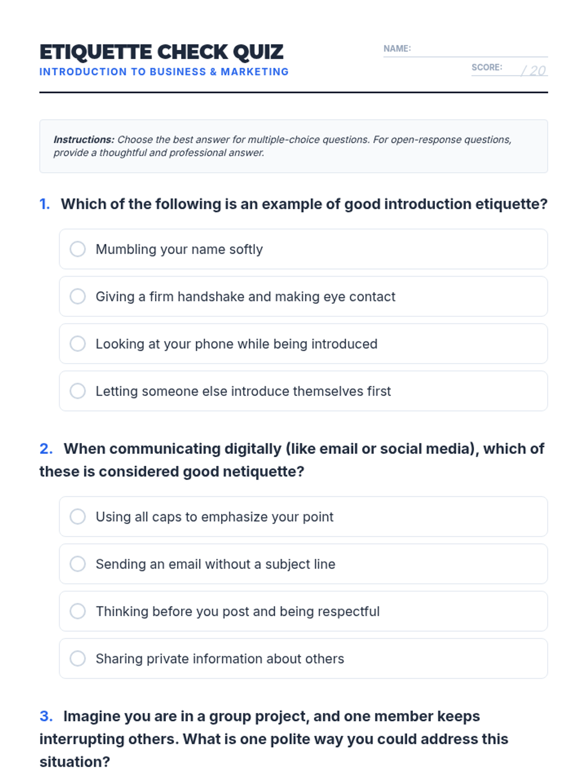 This lesson introduces 8th-grade Introduction to Business and Marketing students to fundamental etiquette skills crucial for personal and professional success. It will equip students with practical knowledge and confidence to navigate various social and business situations effectively in one 45-minute session.