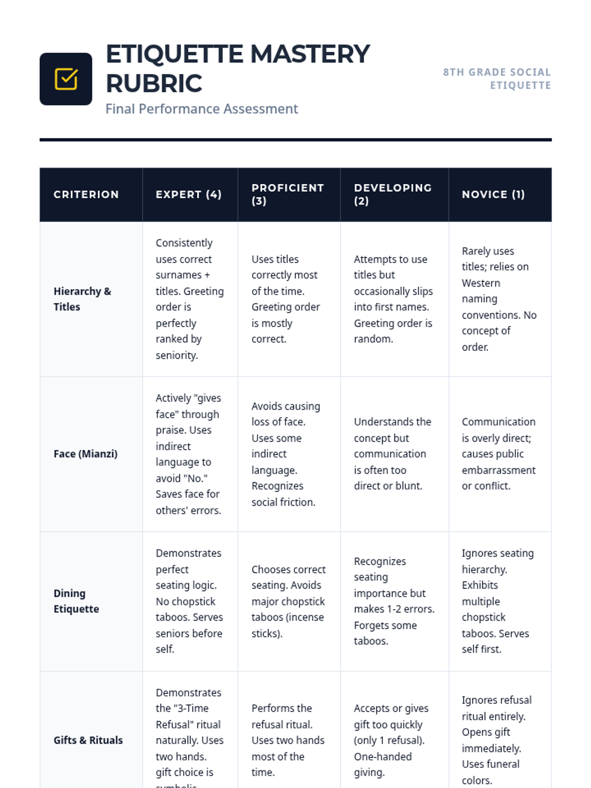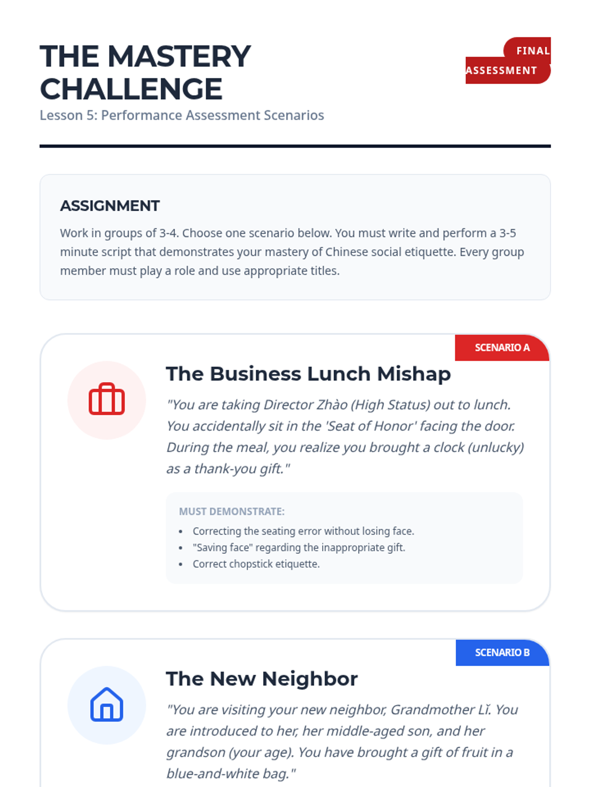 A culminating simulation where students apply their knowledge to navigate complex cultural scenarios and restore harmony in social mishaps.