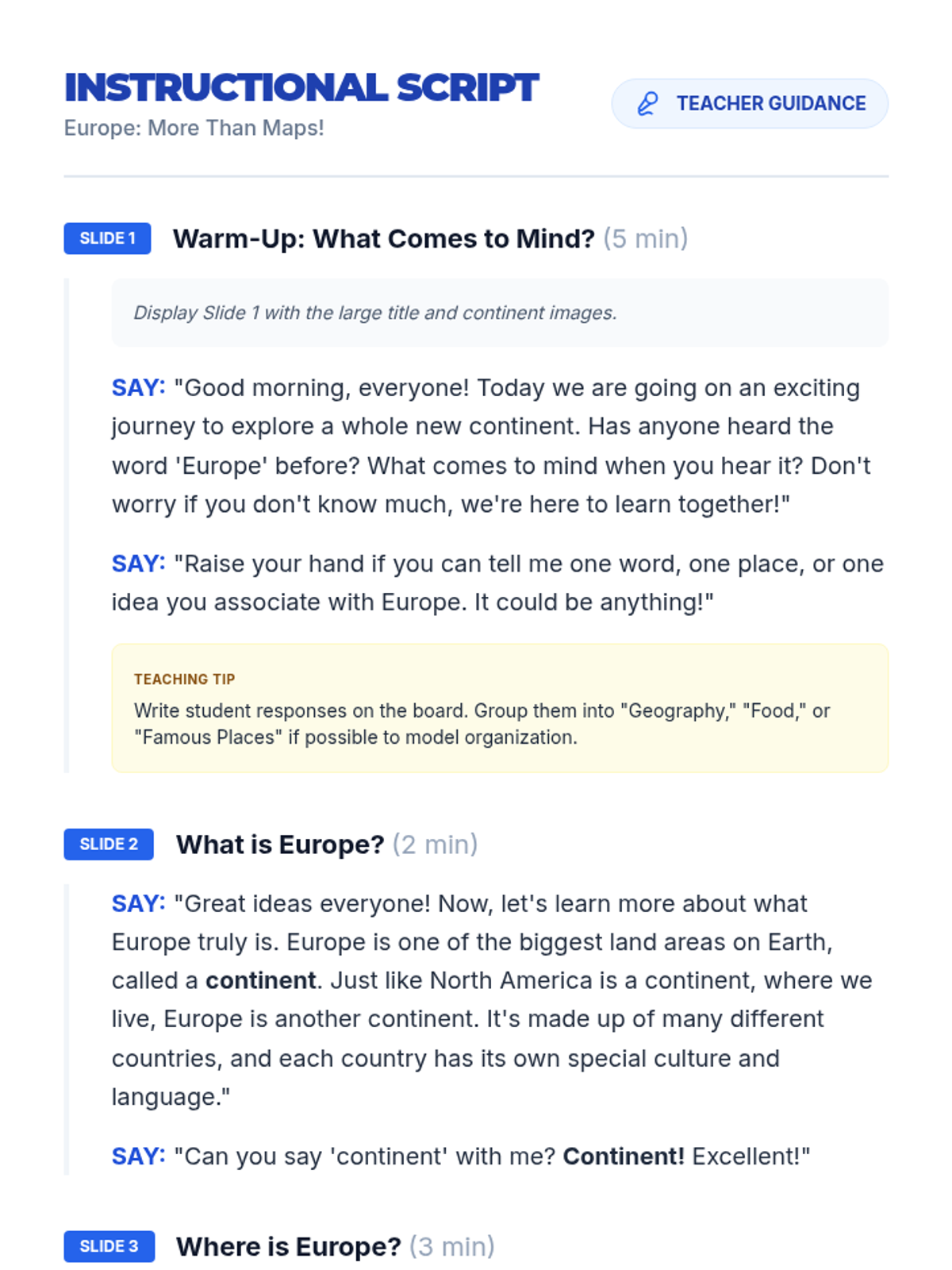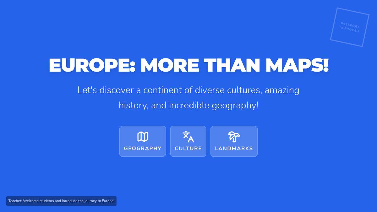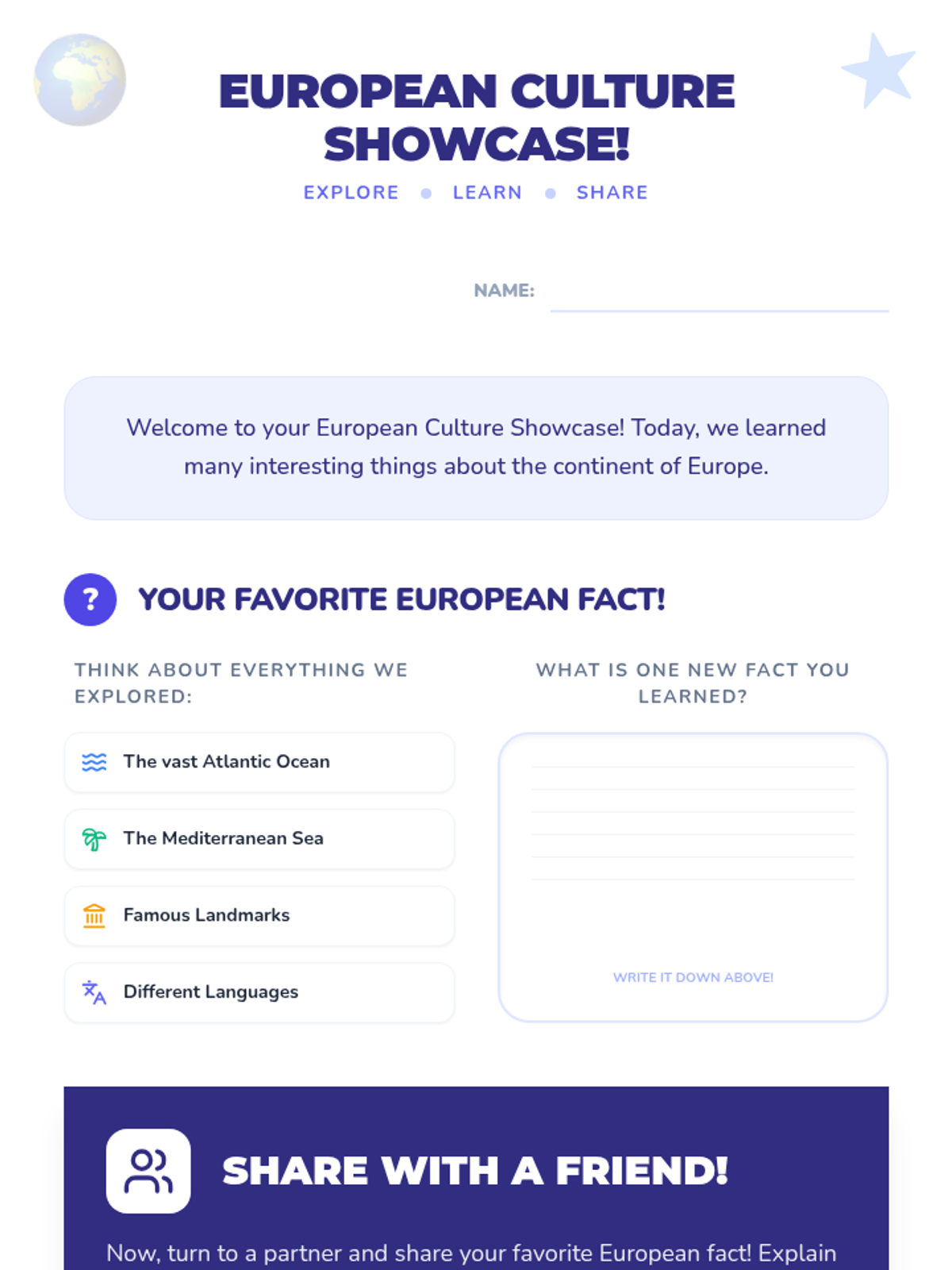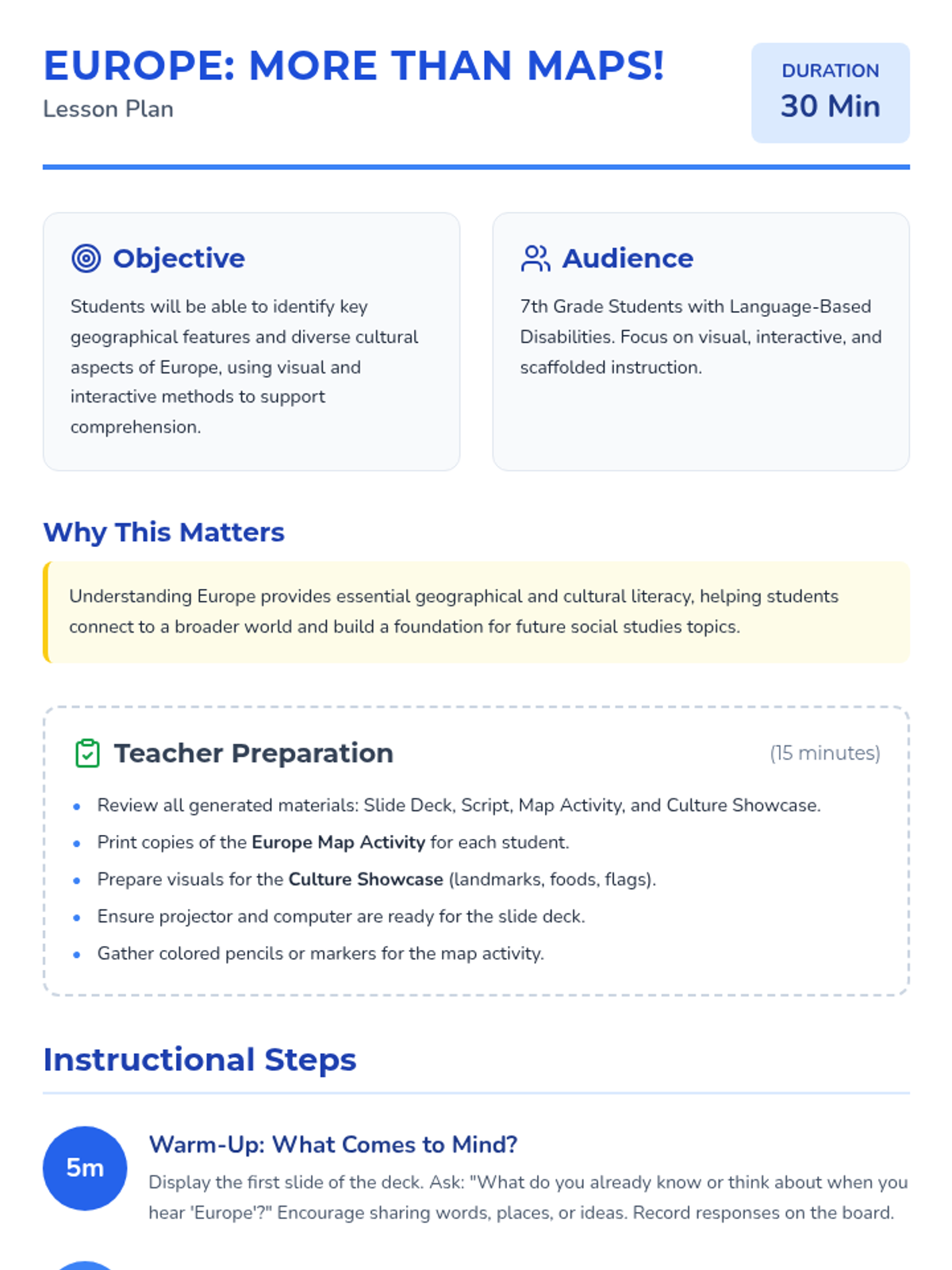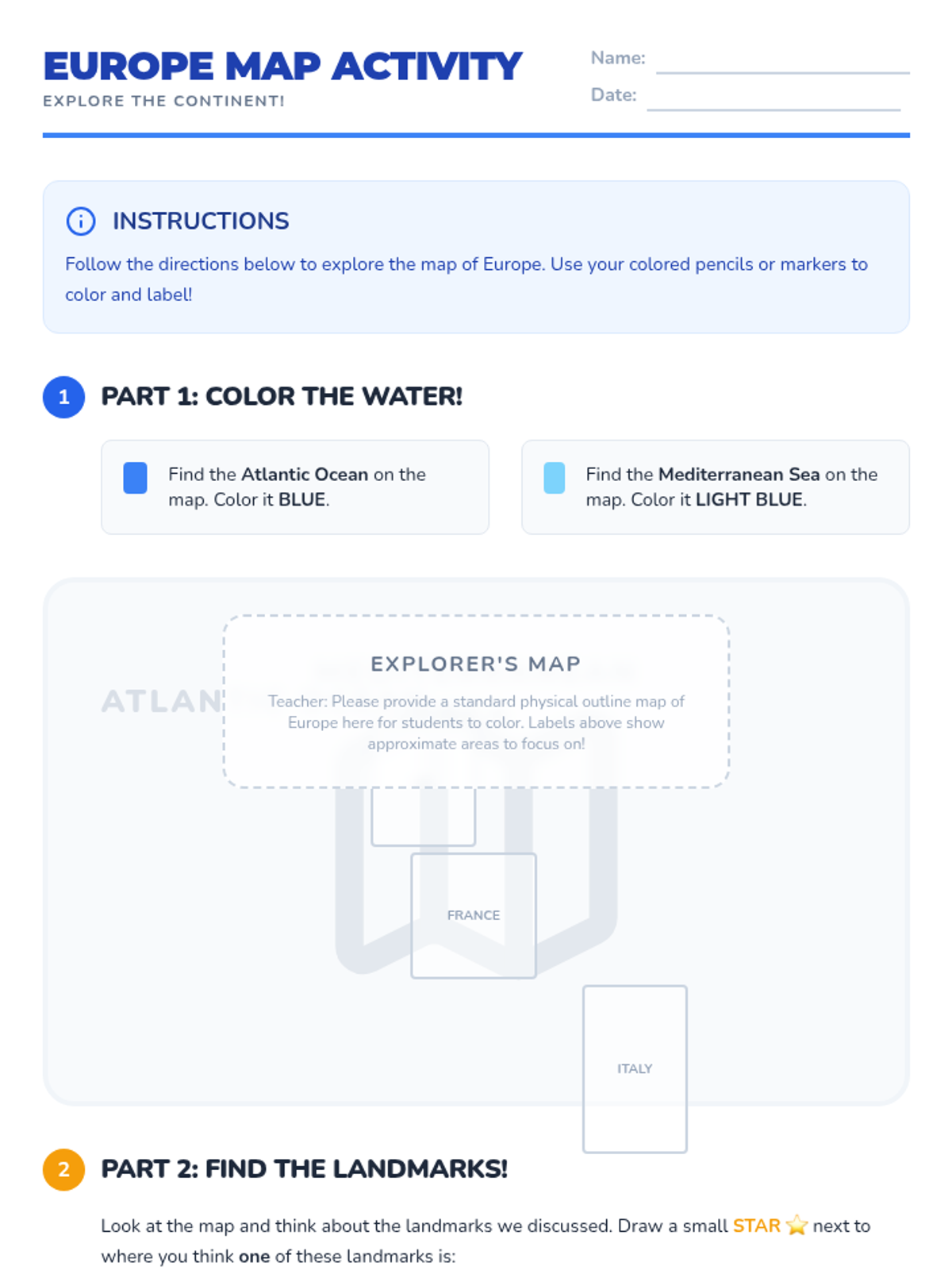 This lesson introduces 7th-grade students with language-based disabilities to the diverse geography and cultures of Europe through visual aids and interactive activities. Students will build foundational knowledge about the continent's major landmarks, bodies of water, and cultural diversity.