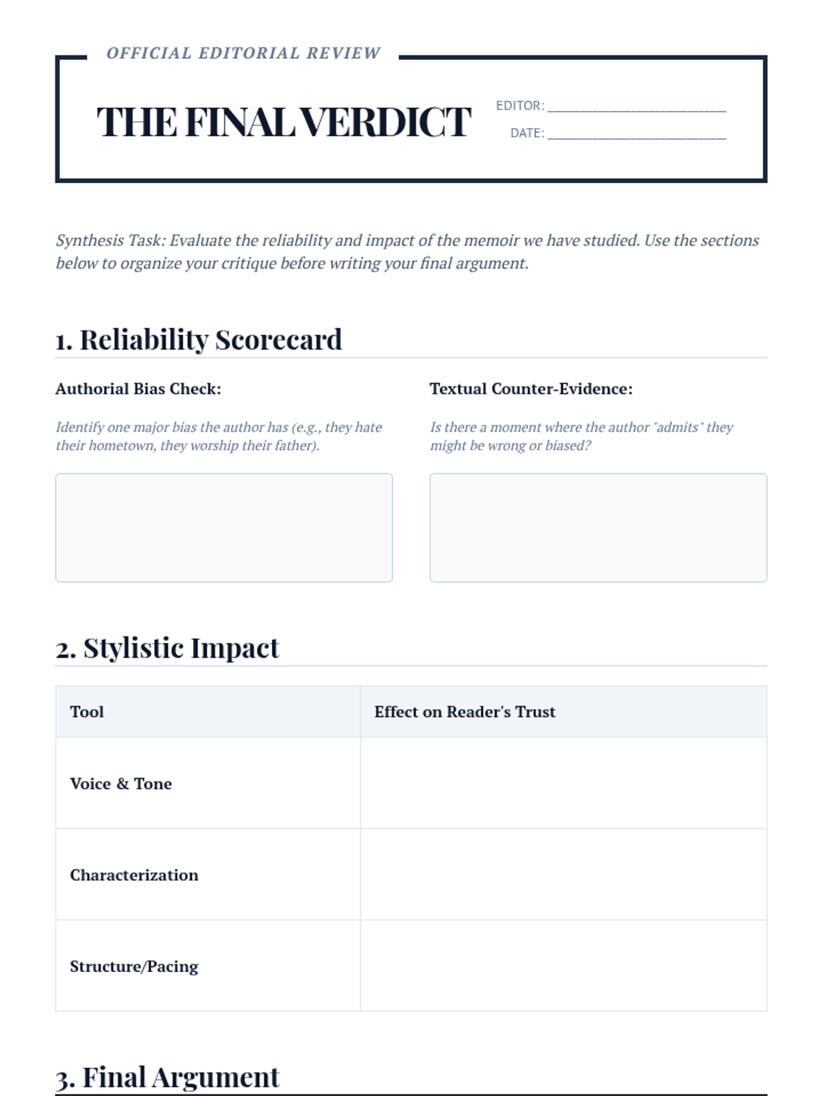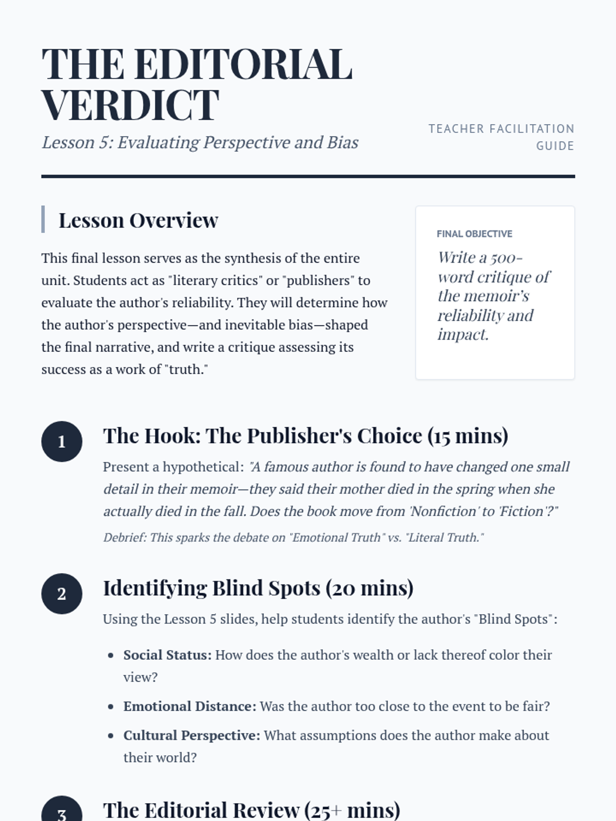 A culminating lesson where students assess an author's reliability and evaluate how their personal bias shapes the narrative.