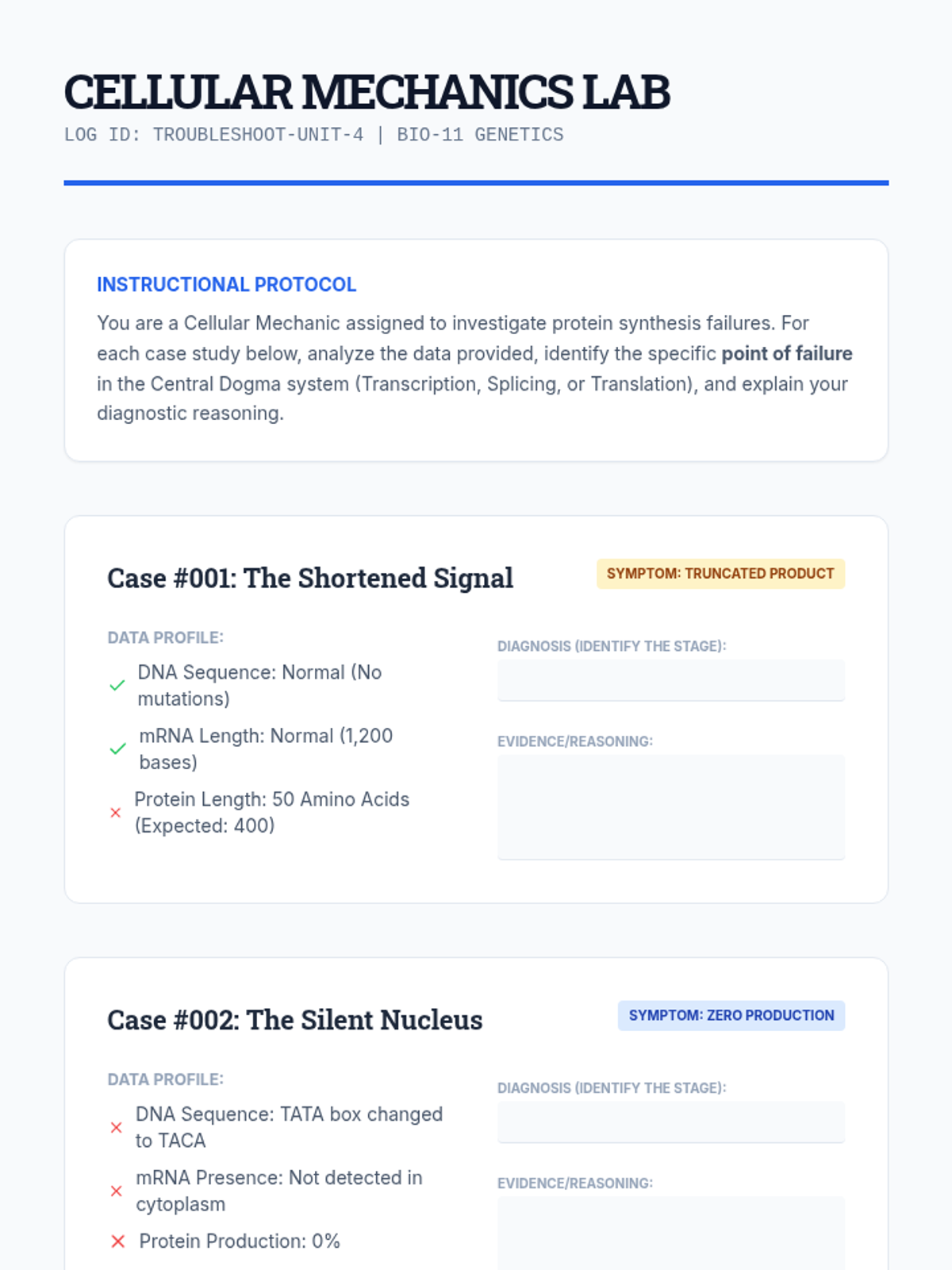 Students synthesize their knowledge by tracing a gene from nucleus to cytoplasm to final product. They create a detailed flowchart or infographic explaining the information flow and identifying potential points of failure.