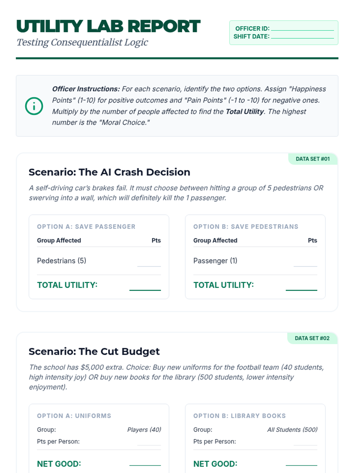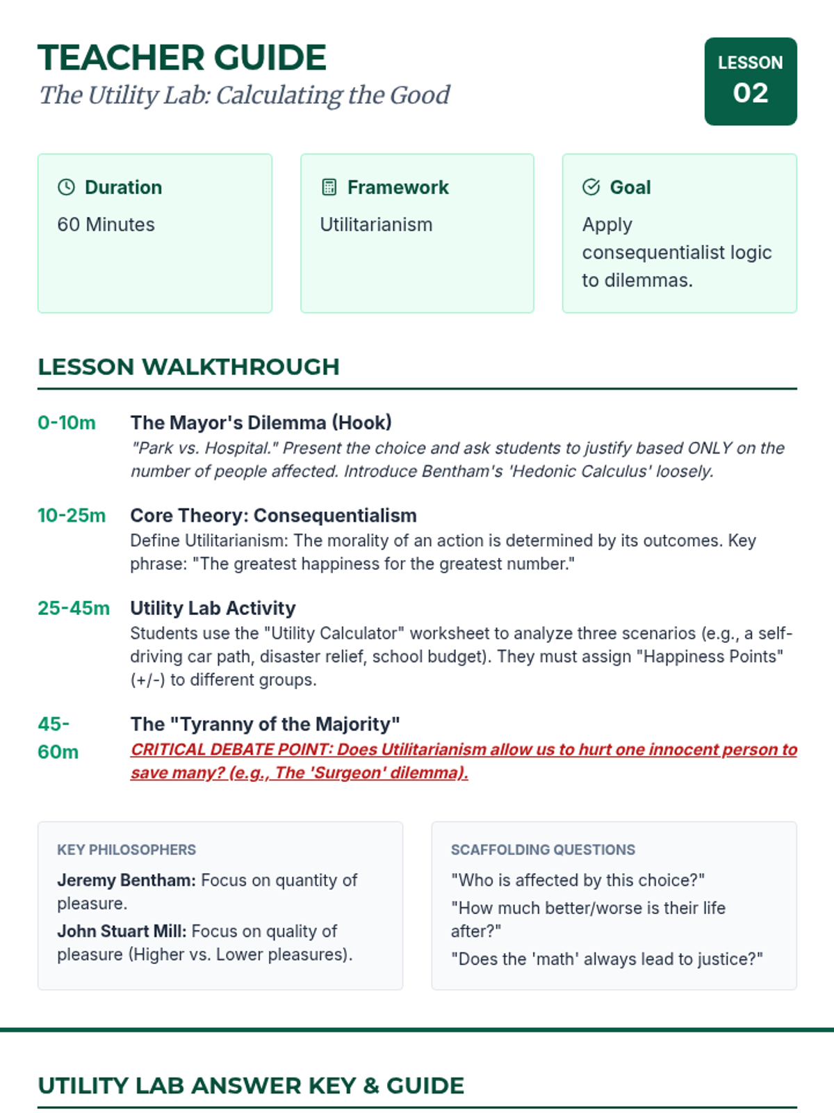 Focusing on Jeremy Bentham and John Stuart Mill's theories, students analyze scenarios where the 'greatest good for the greatest number' is the guiding principle. They practice calculating 'utility' in complex scenarios to understand the strengths and limitations of consequentialism.