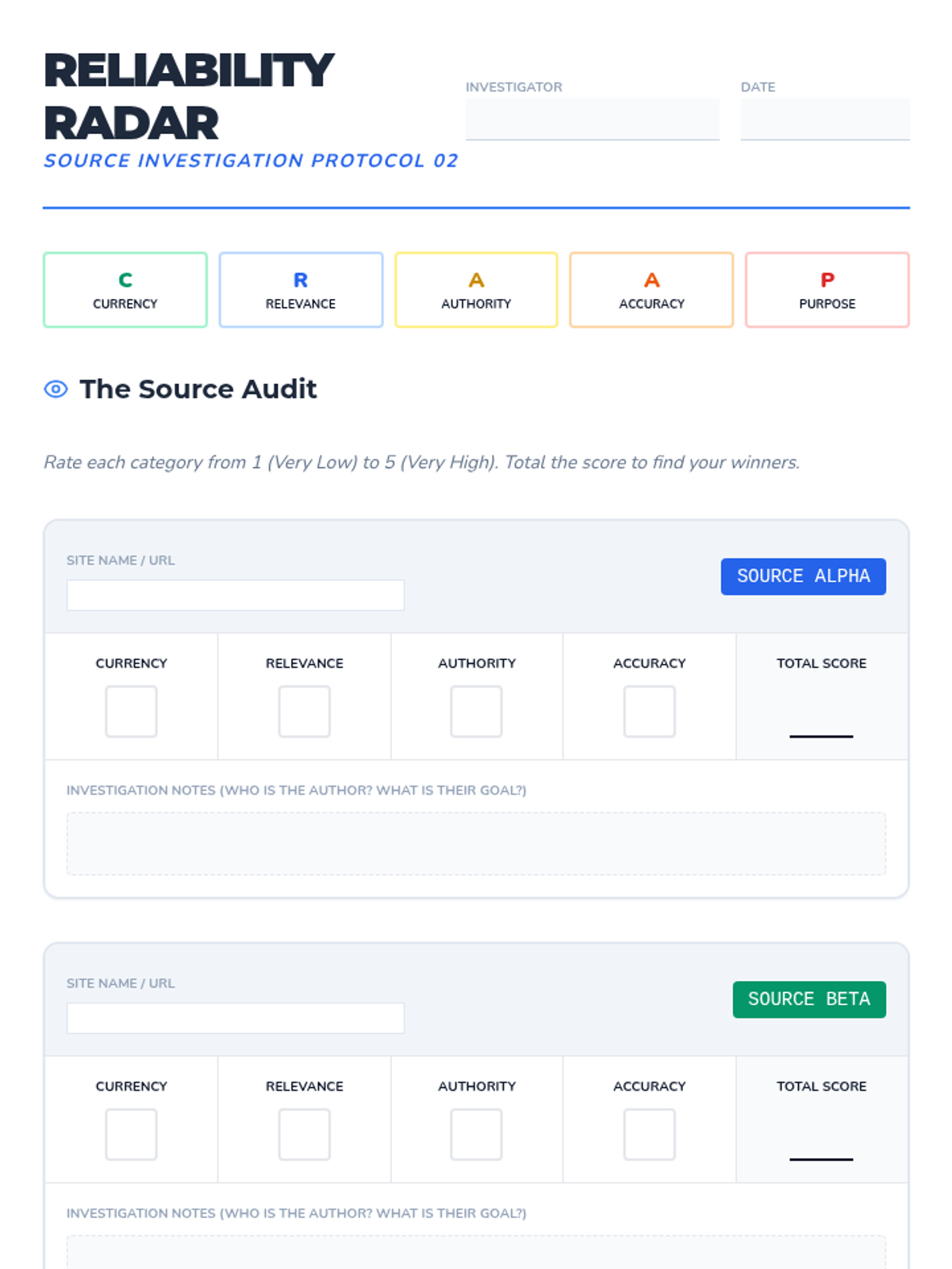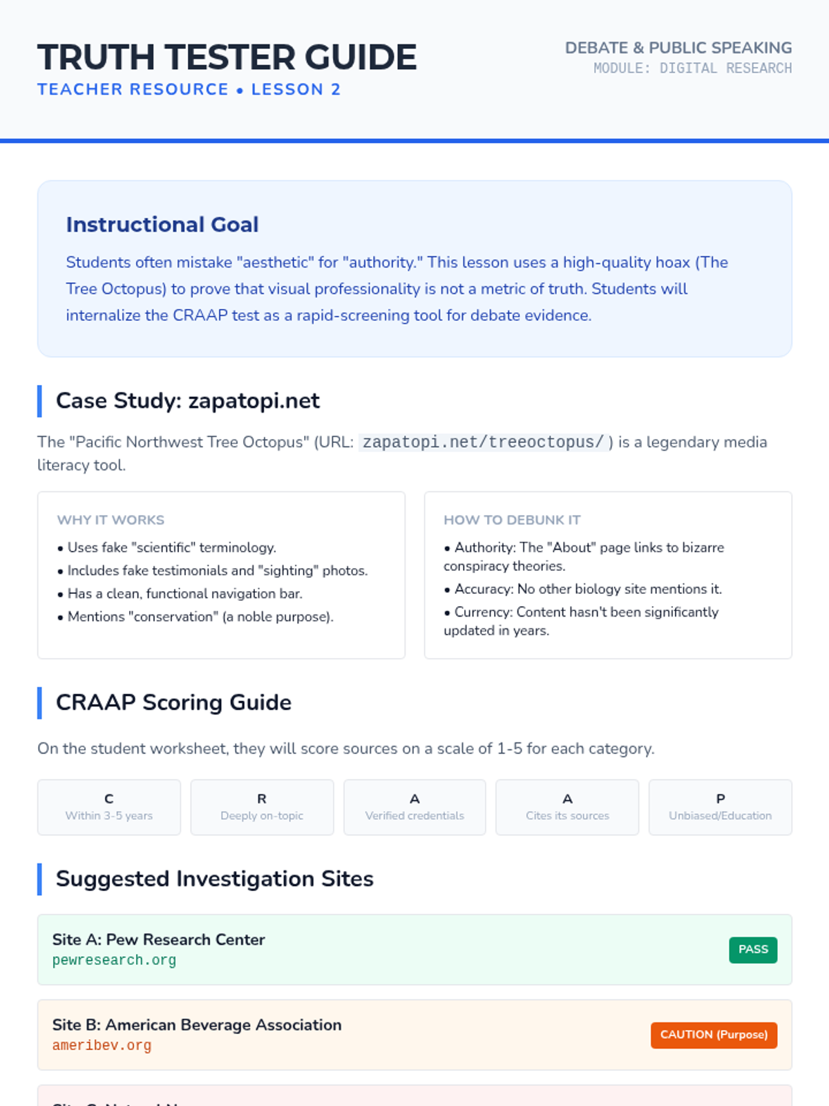Focuses on the initial screening of digital information. Students learn to analyze web domains and apply the CRAAP test (Currency, Relevance, Authority, Accuracy, Purpose) to identify markers of credible information versus low-quality or biased content.
