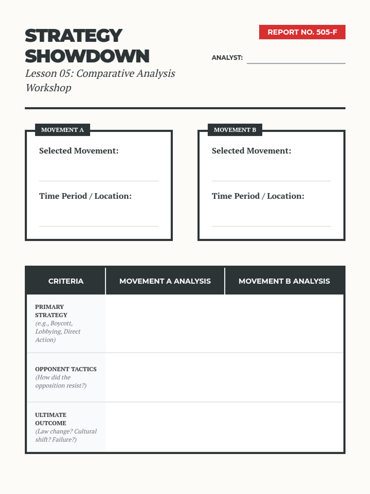 Students synthesize their learning by comparing the outcomes of two different movements and arguing which strategies were more effective for their specific context.