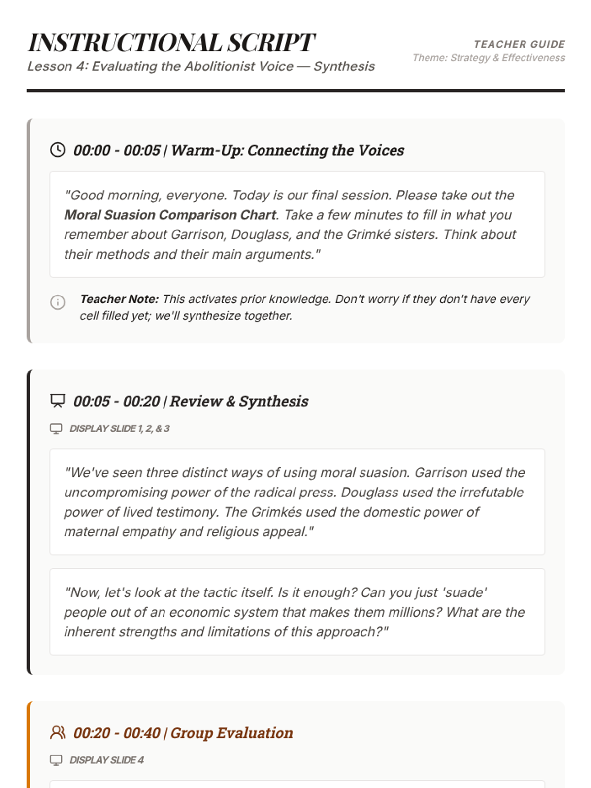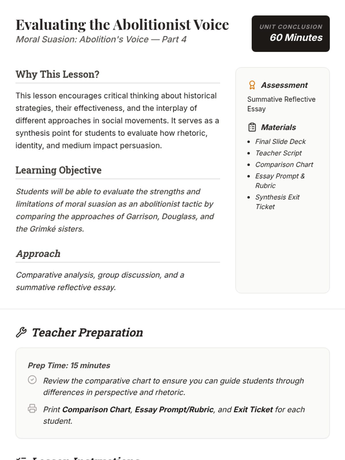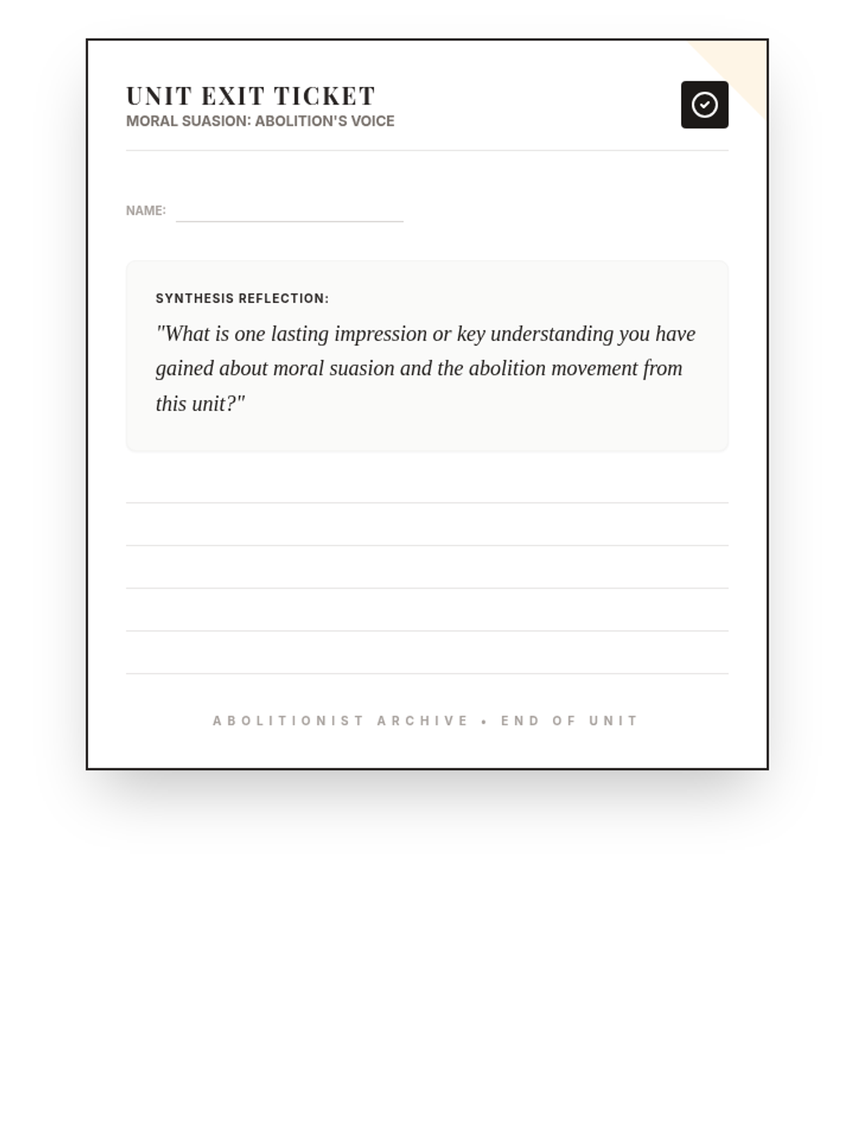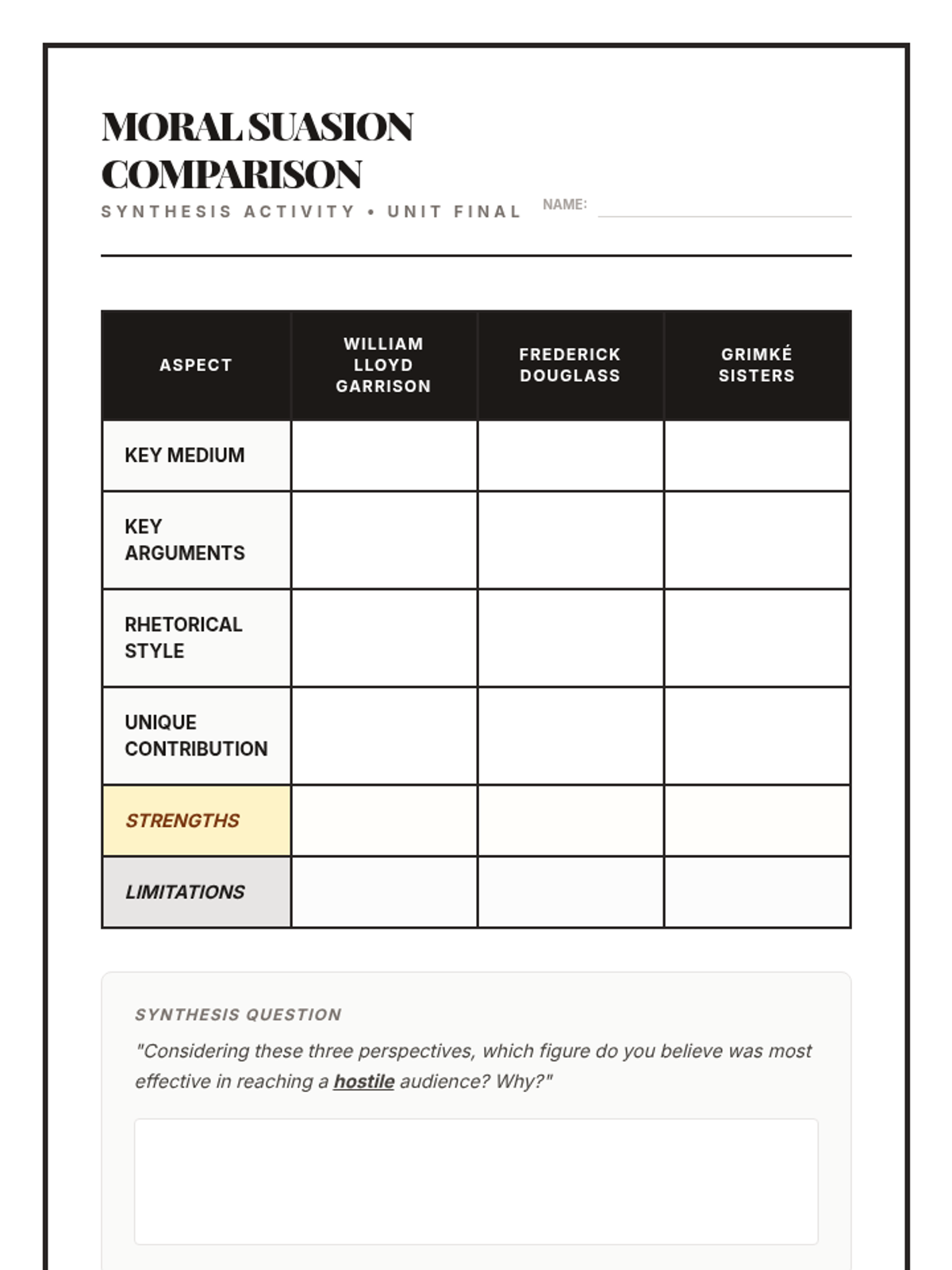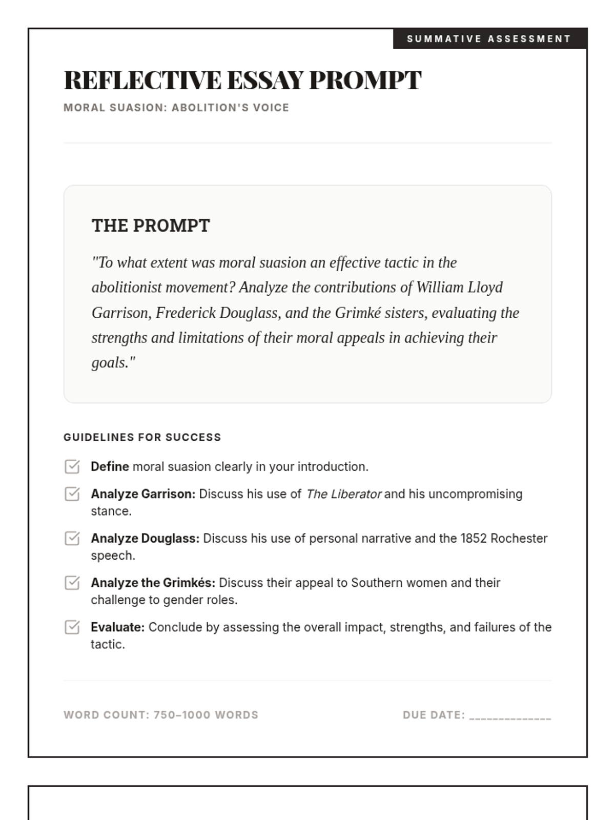 Synthesizes the unit's learning through a comparative analysis and a summative reflective essay on the effectiveness of moral suasion.