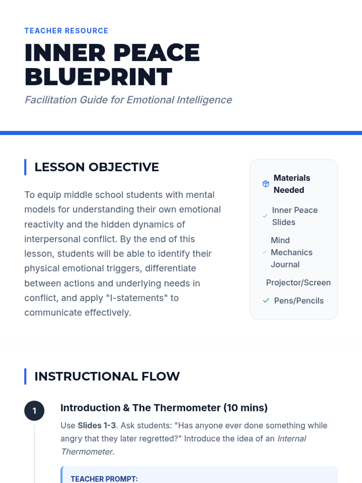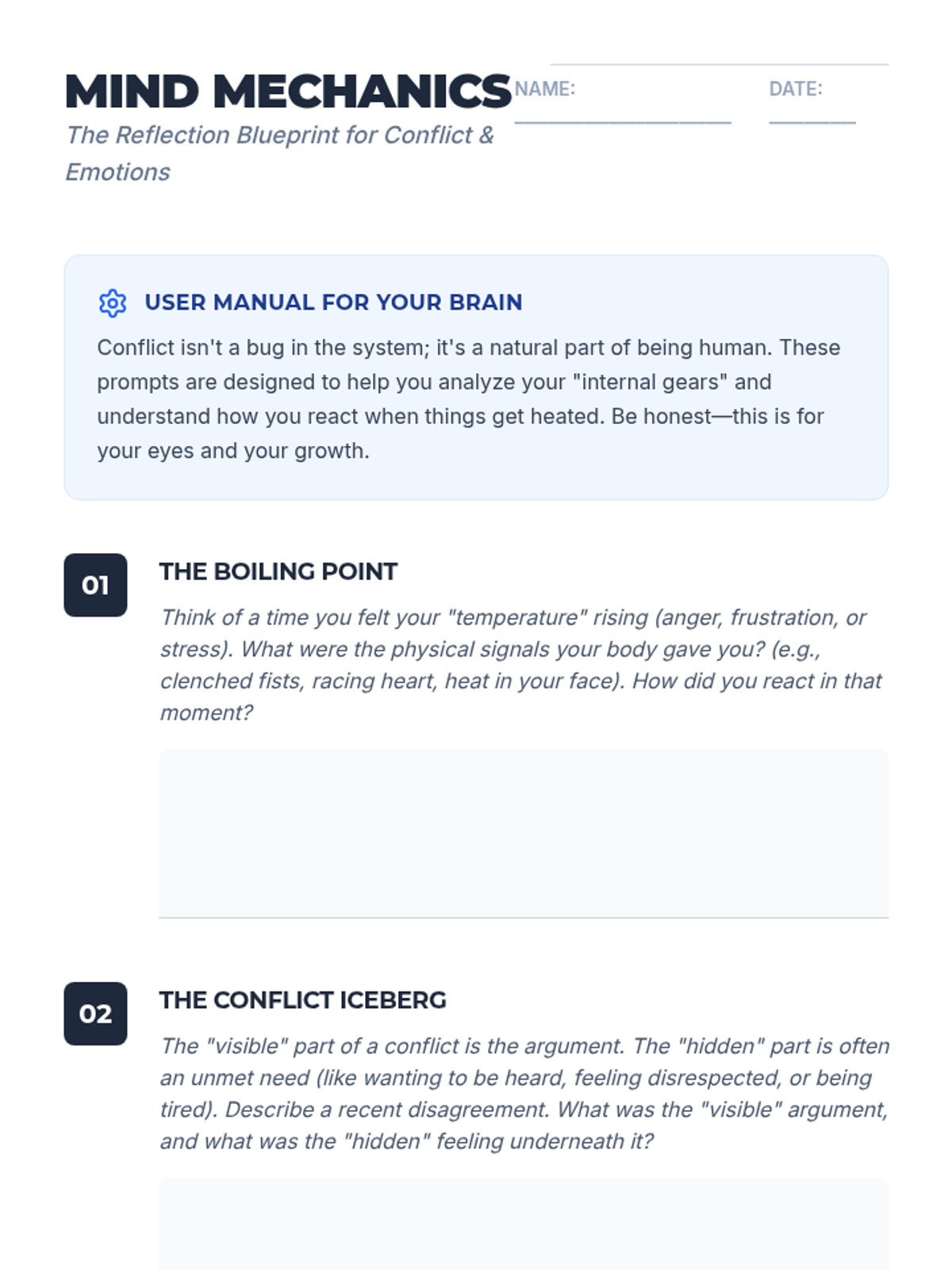 This lesson introduces middle school students to the concepts of emotional regulation and constructive conflict resolution through guided reflection and visual models. Students will explore their own triggers, learn the 'Iceberg' theory of conflict, and practice perspective-shifting.