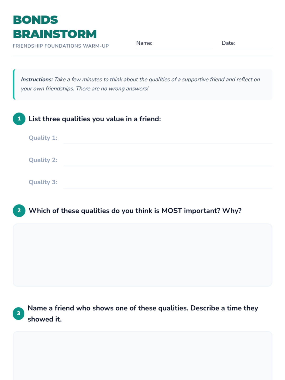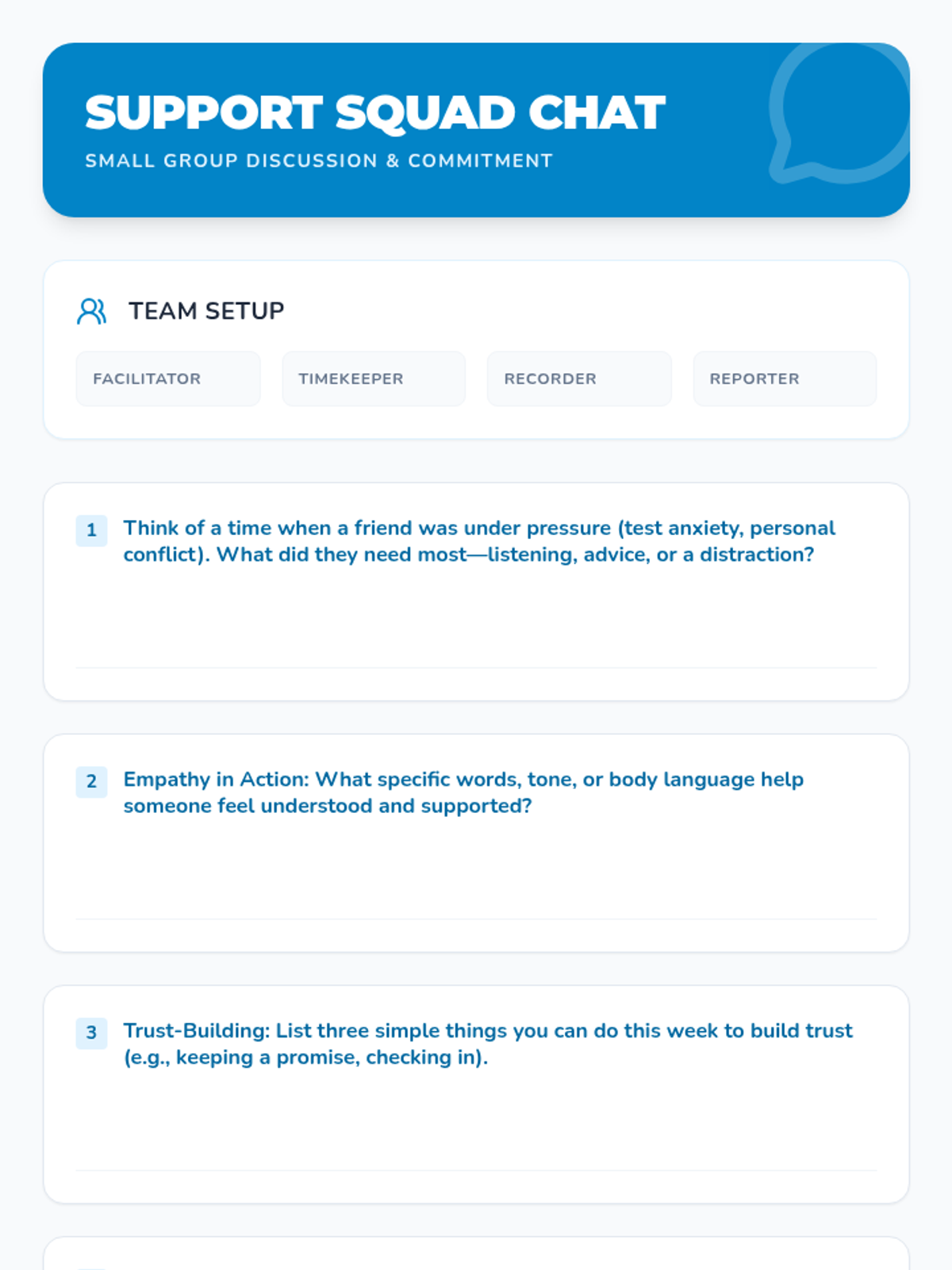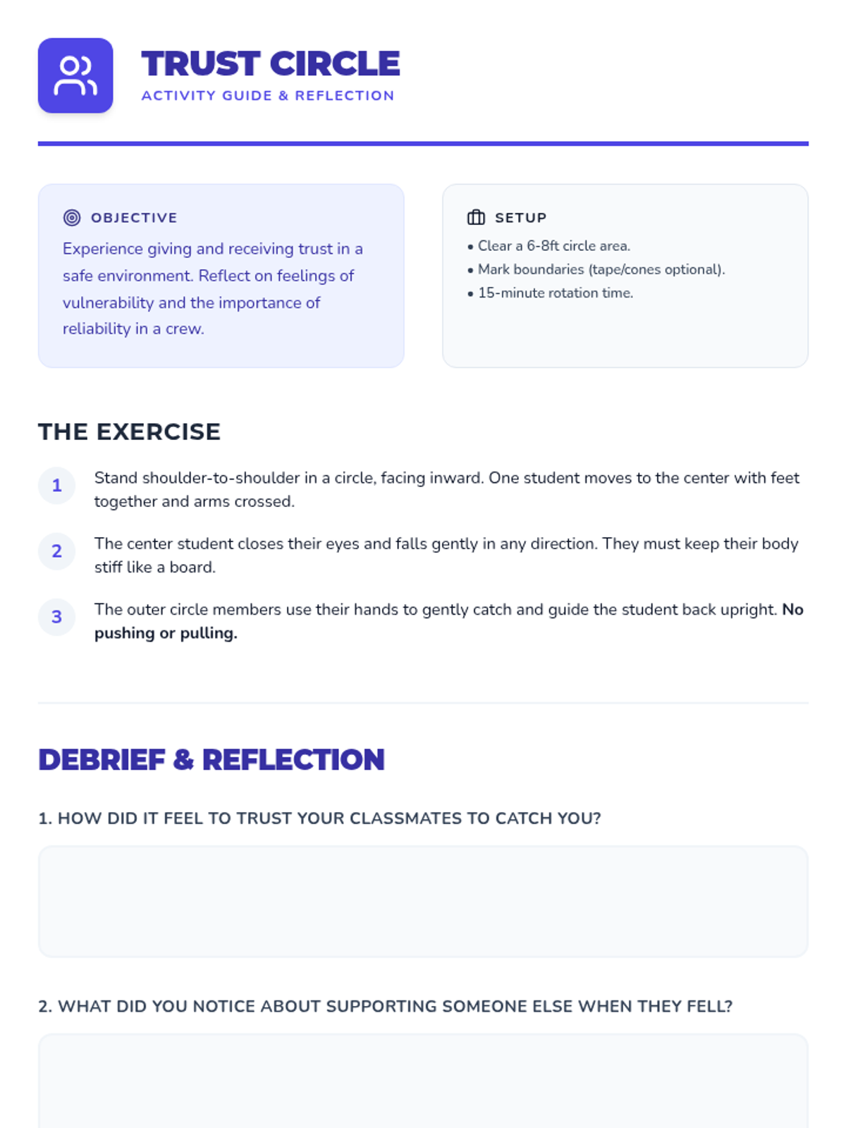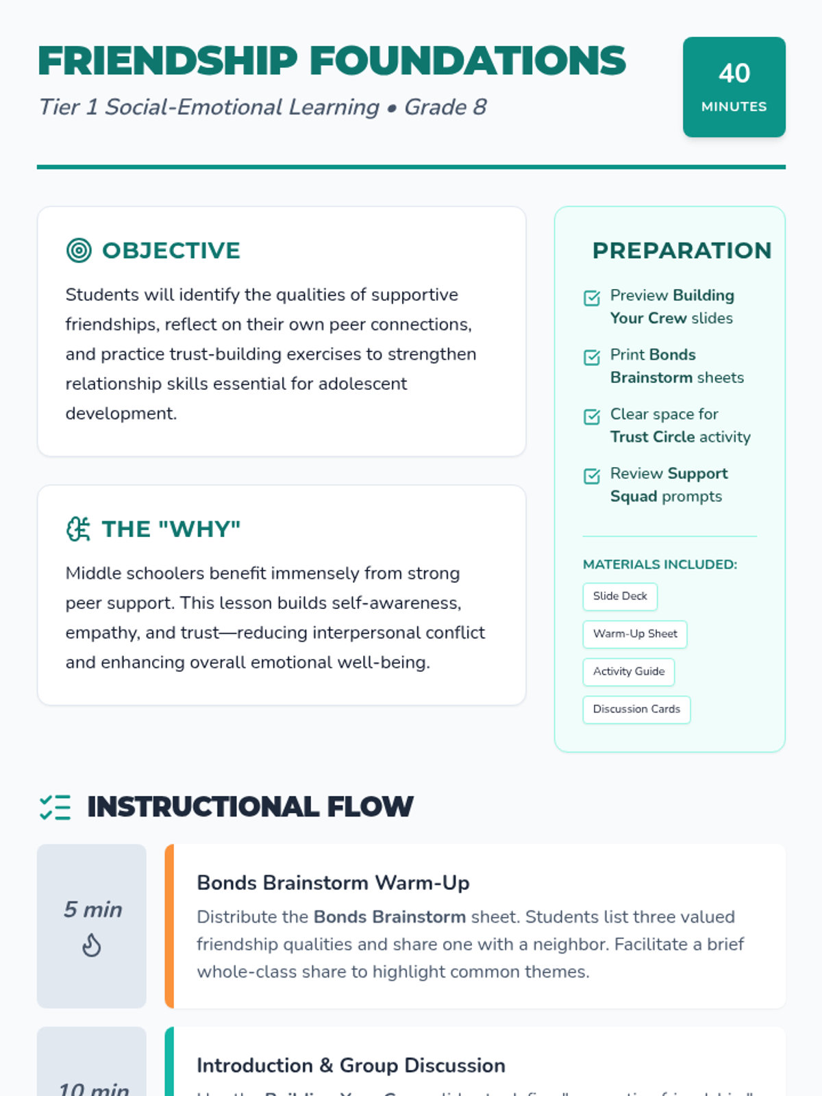 An interactive 8th-grade lesson focused on identifying the qualities of supportive friends, building trust through physical exercises, and practicing empathy in peer relationships.