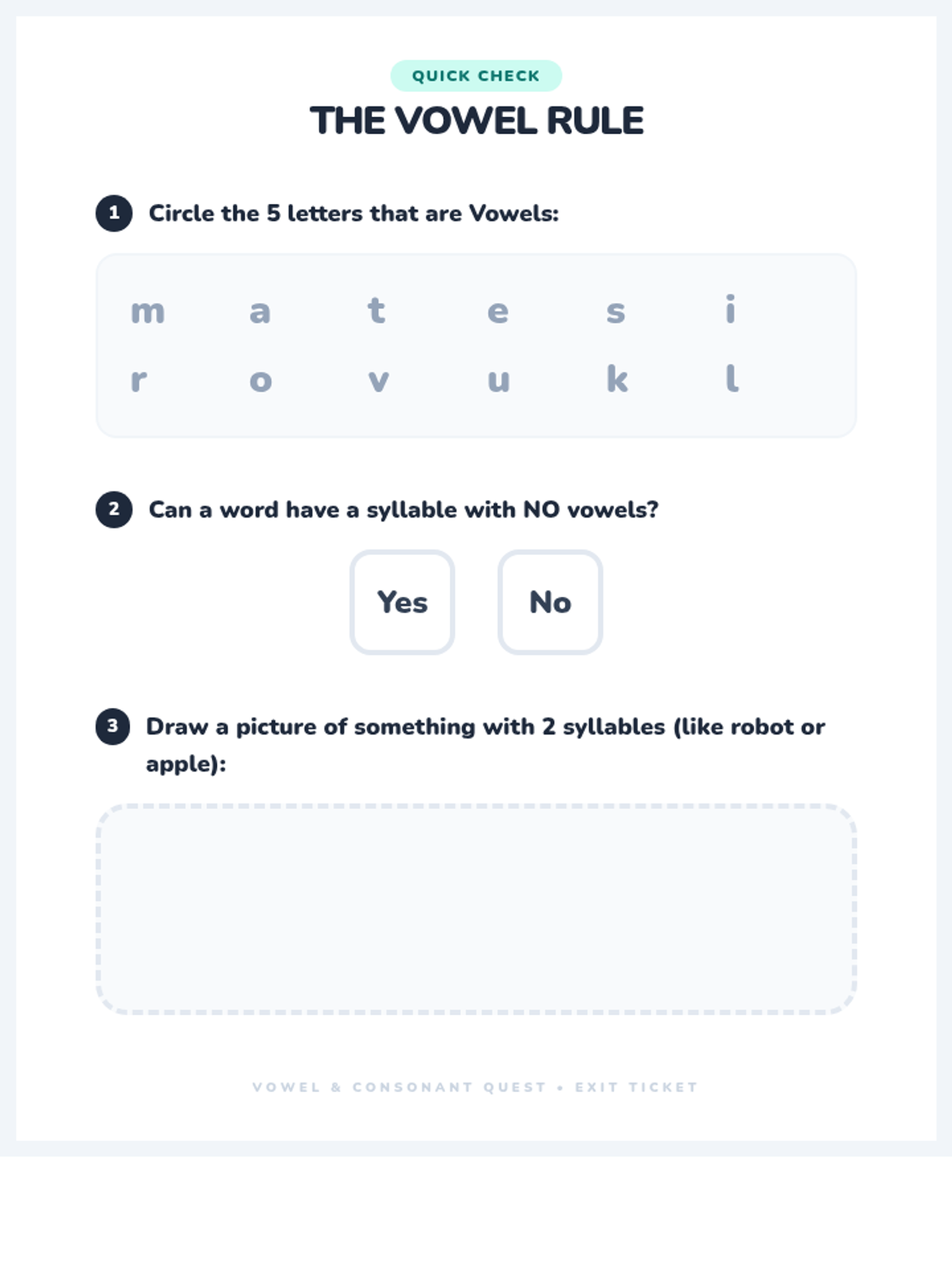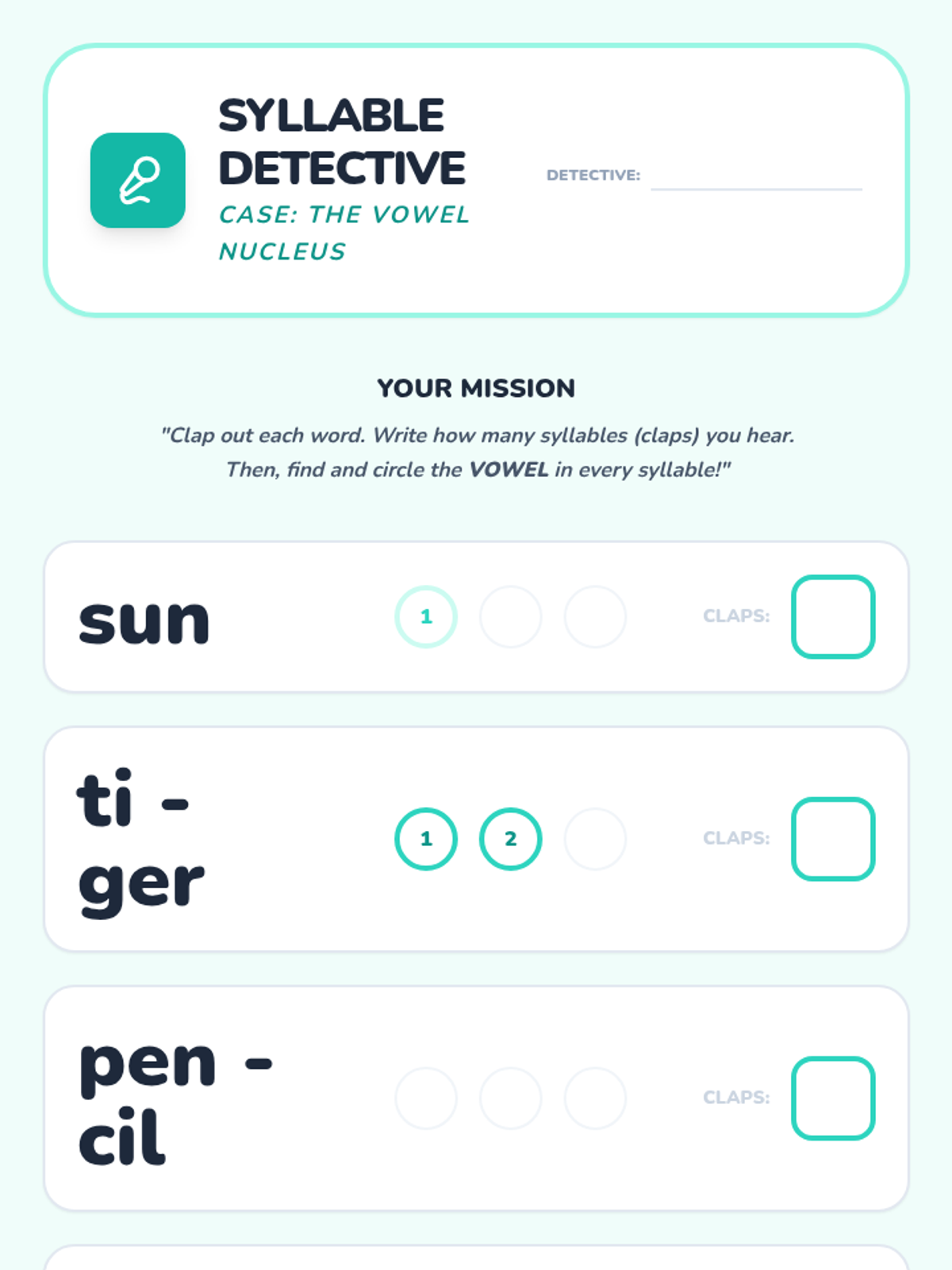 Students clap out names and simple words to identify syllables, then check written versions to verify that every clap (syllable) contains a vowel. This cements the rule of vowel necessity in written English.