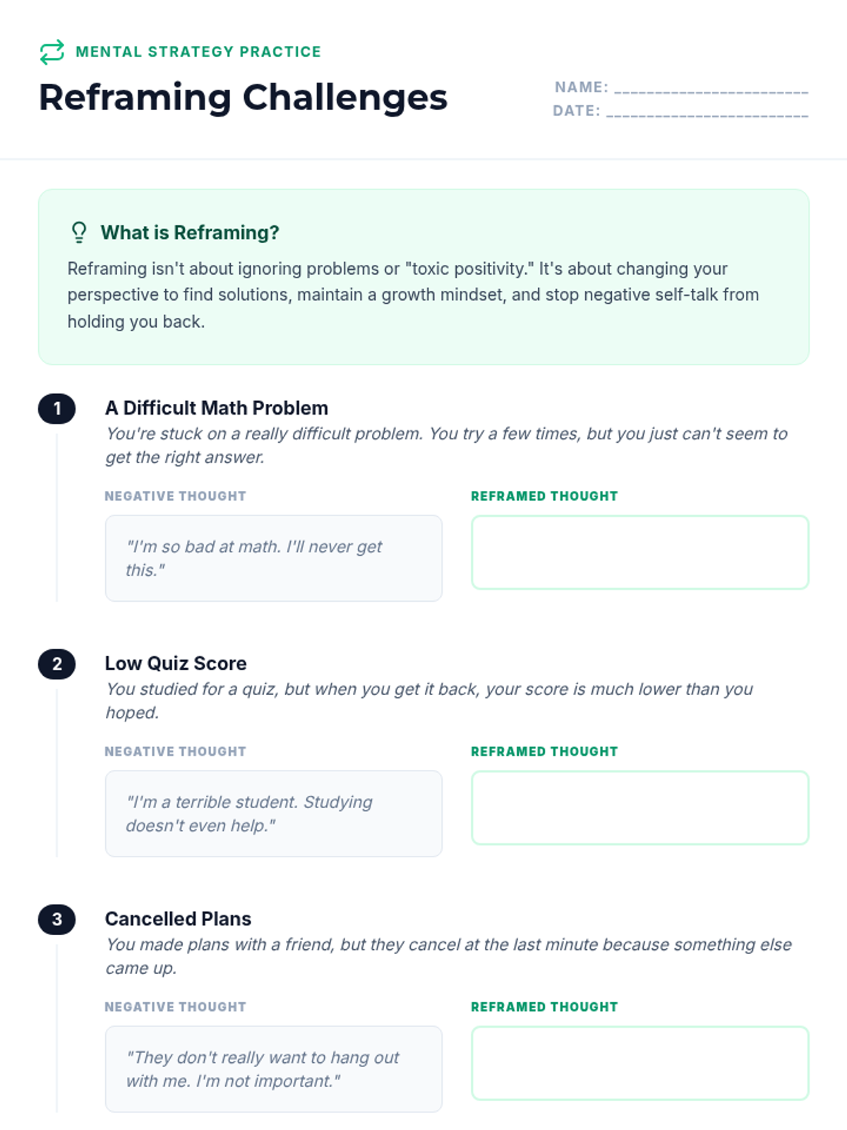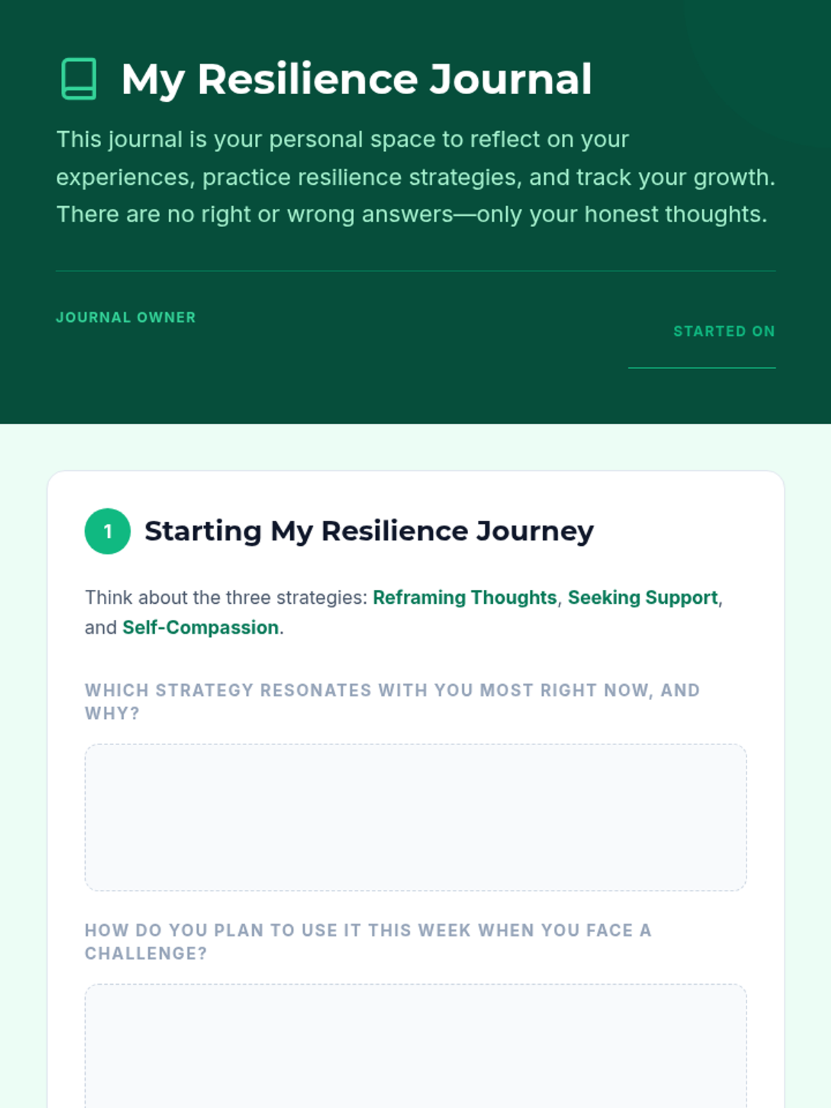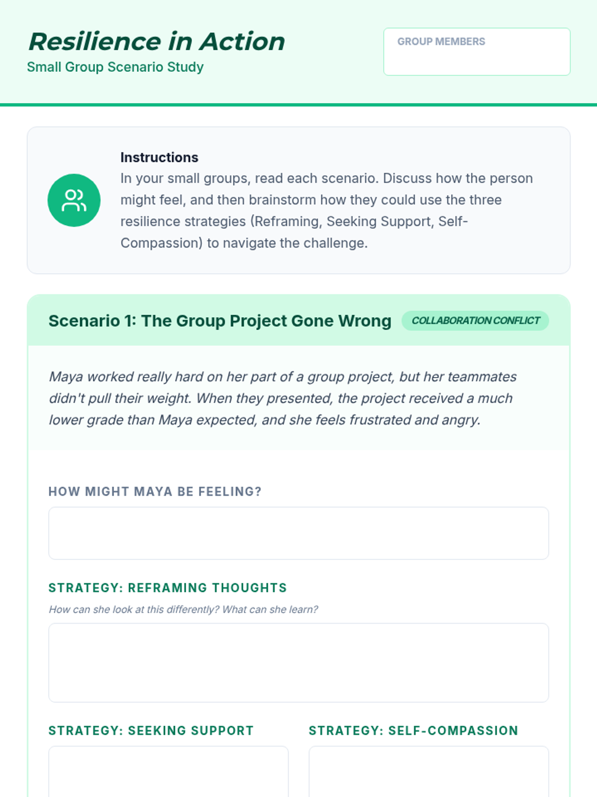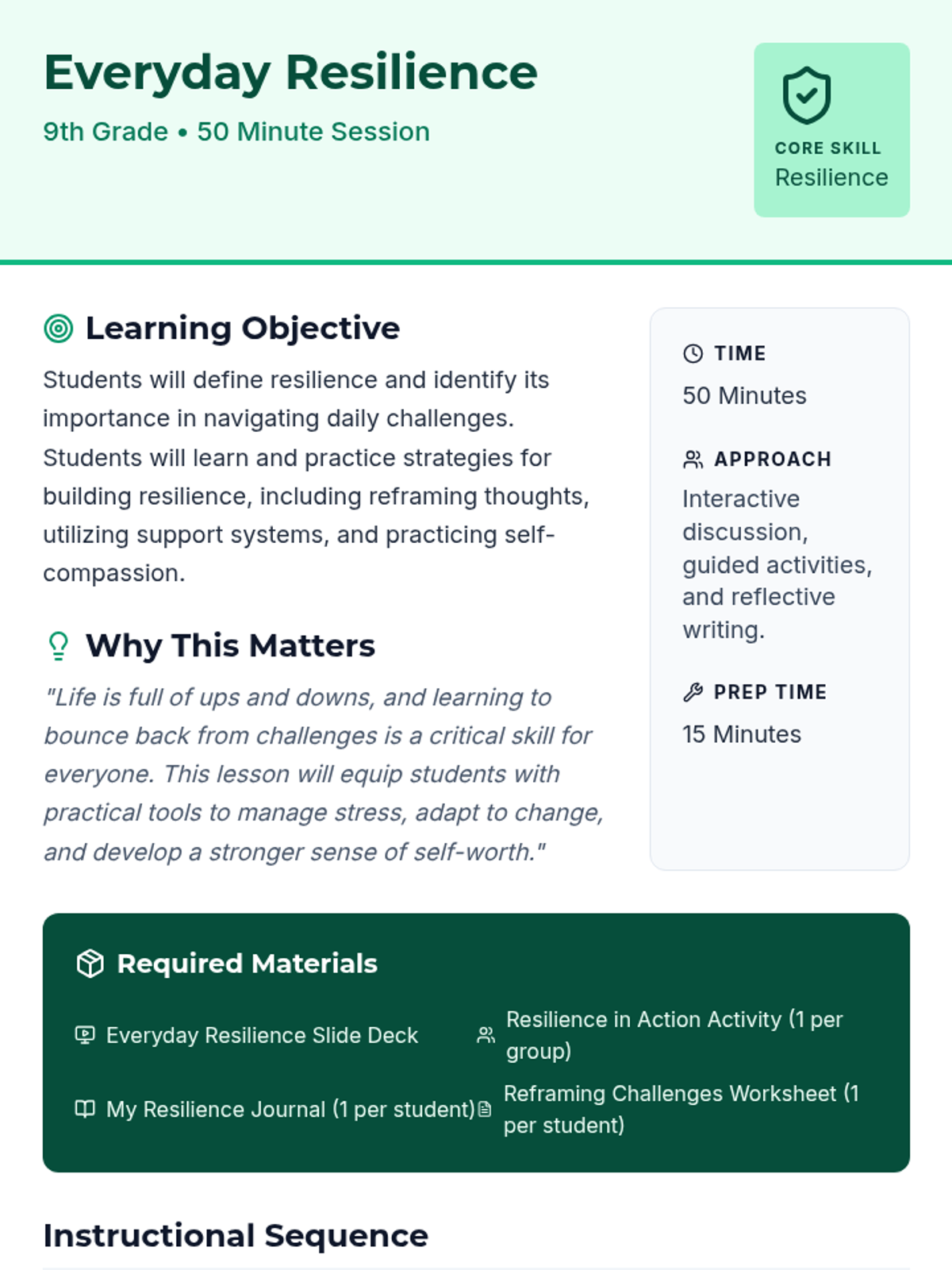 This lesson introduces 9th graders to resilience, providing actionable strategies like reframing, seeking support, and self-compassion to navigate daily challenges. Students will practice these skills through group activities, individual worksheets, and personal journaling to foster a growth mindset.