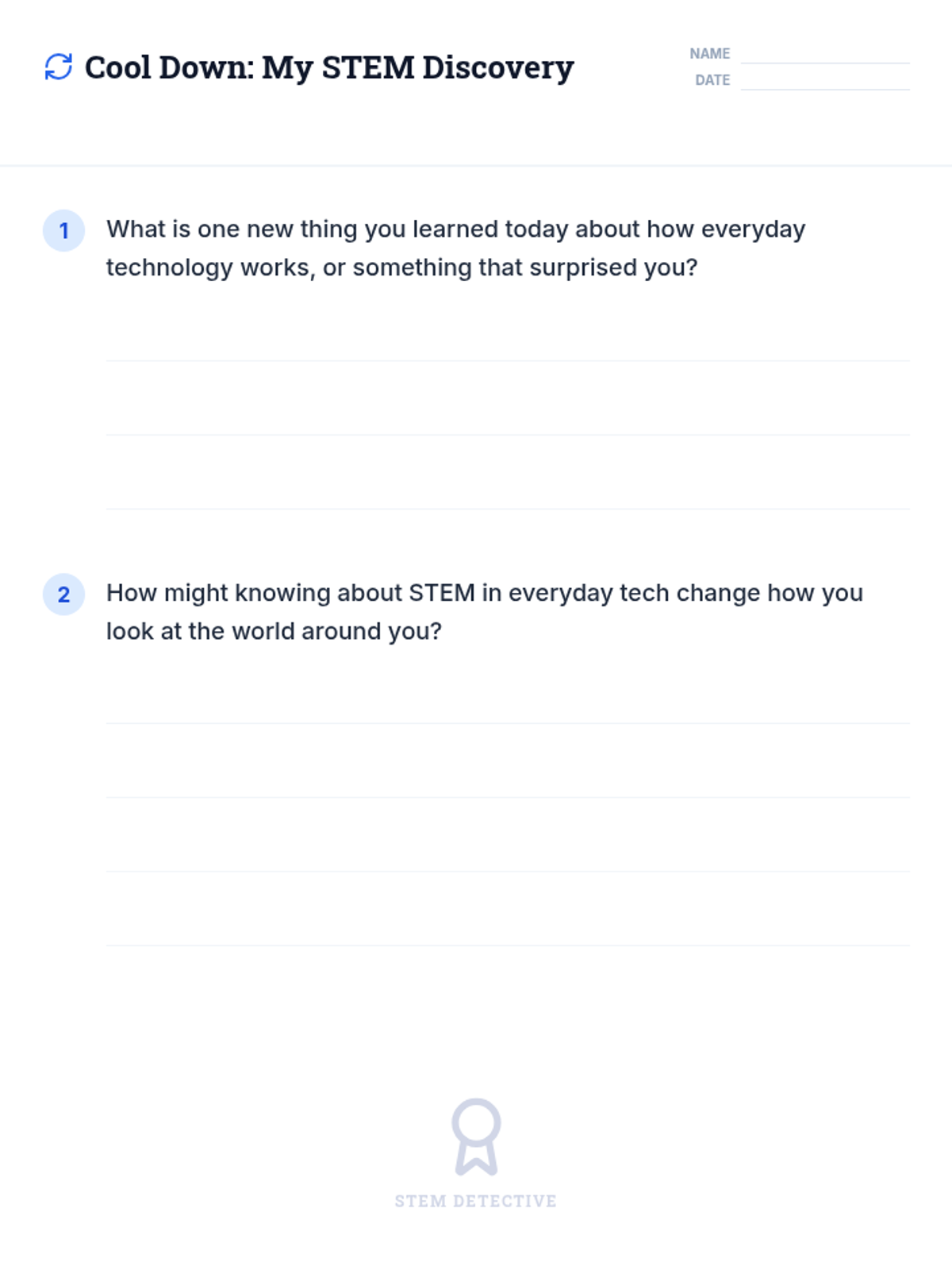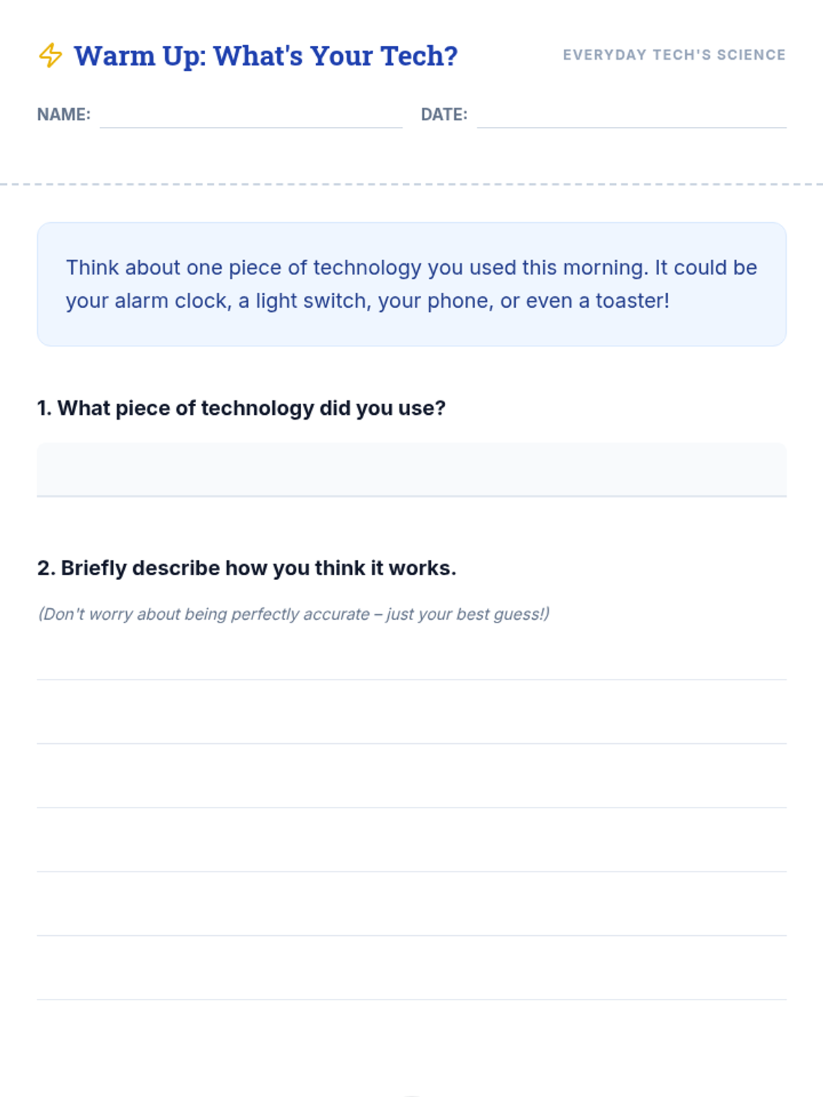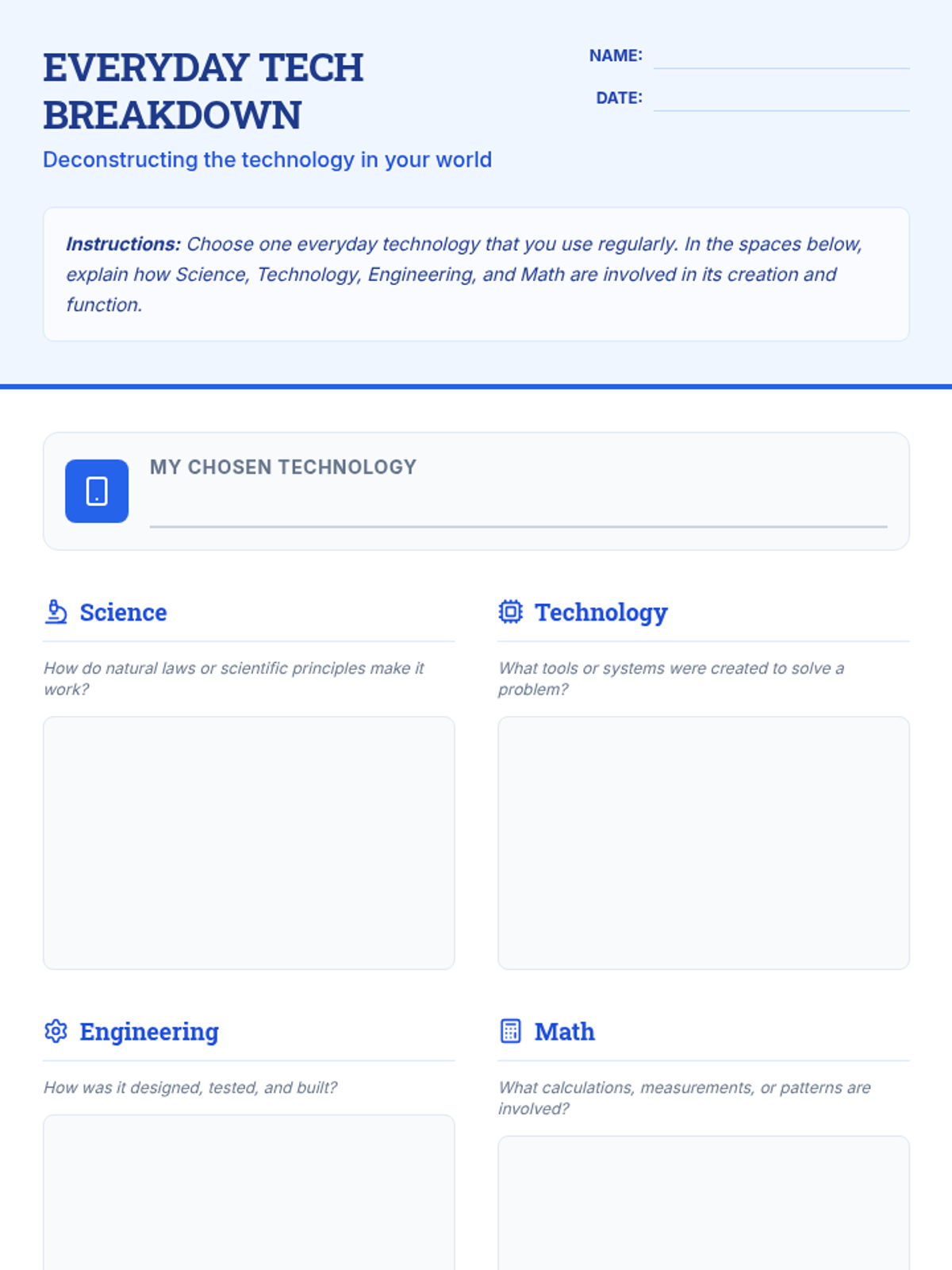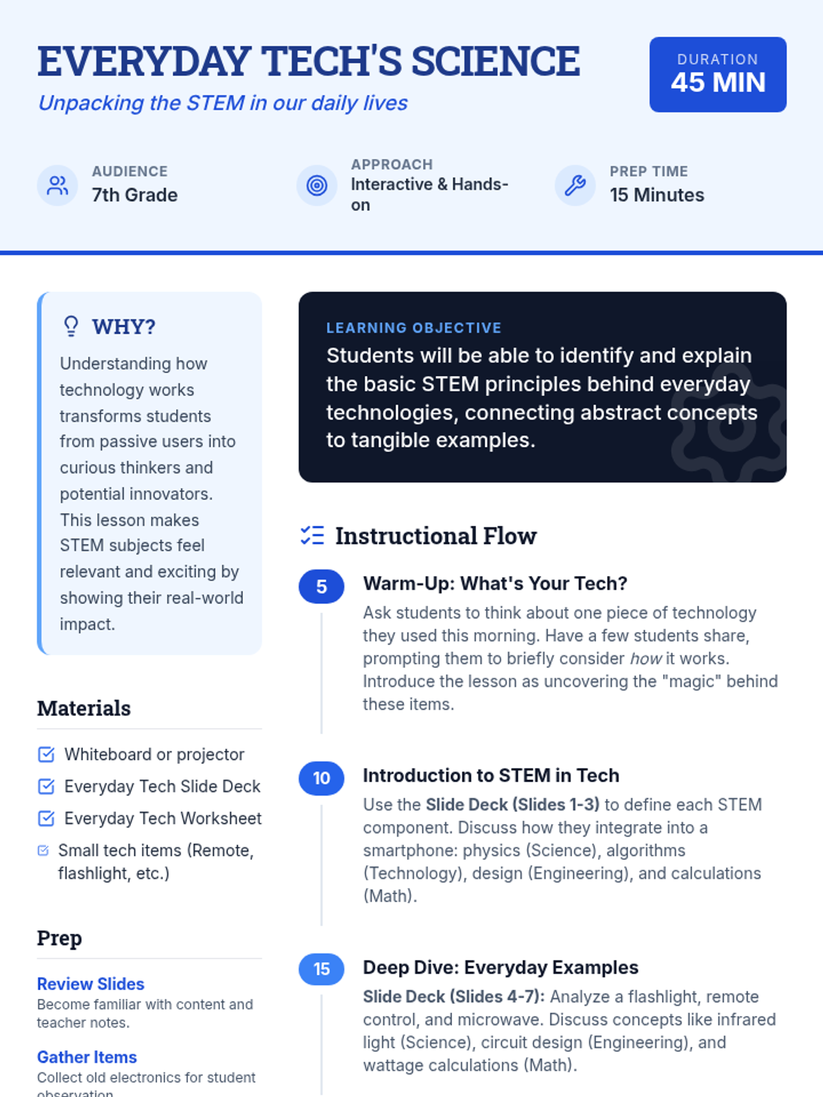 This lesson explores the STEM principles behind common technologies, sparking curiosity and demonstrating real-world applications. Designed for 7th-grade students over one 45-minute session, it connects science, technology, engineering, and math to their daily lives.