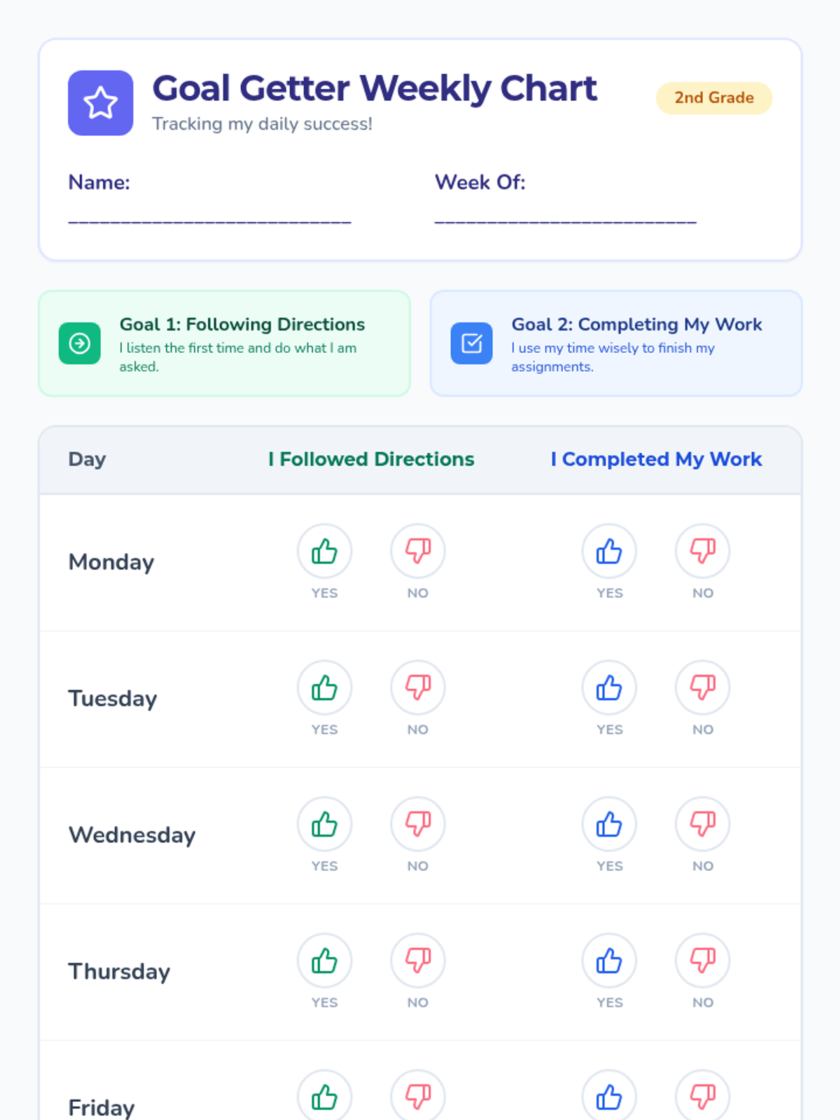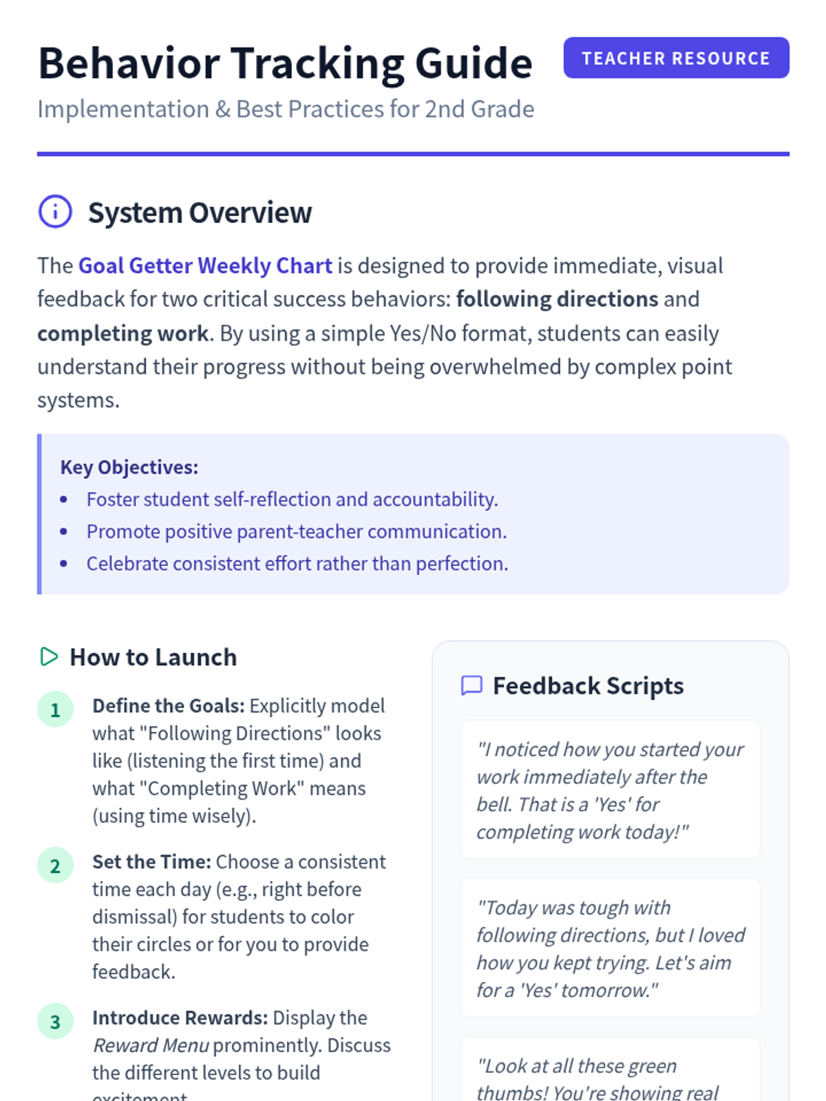A set of tools designed to help 2nd grade students track their daily behavior goals and foster a positive classroom environment through consistent feedback.