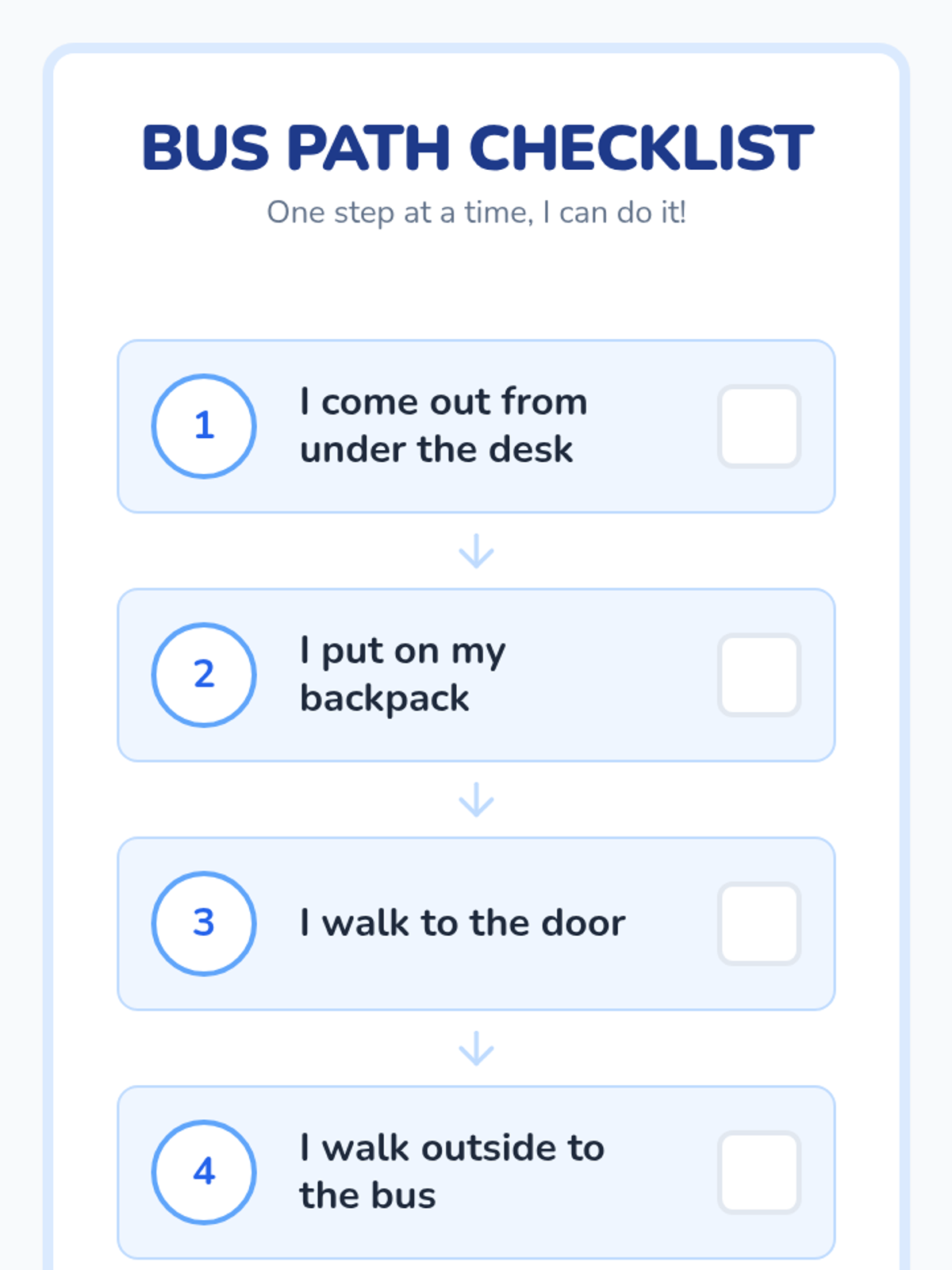 A collection of resources designed to help students transition from the classroom to the school bus, specifically addressing the behavior of hiding under a desk. It uses a social story and visual supports to build predictability and reduce anxiety during transitions.