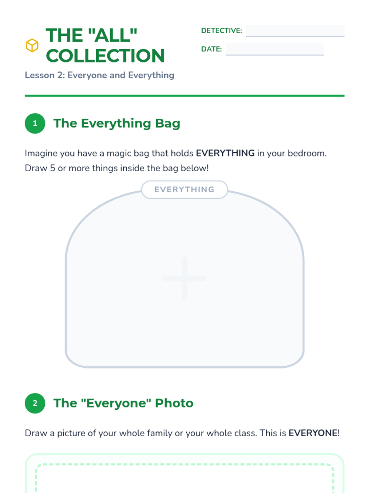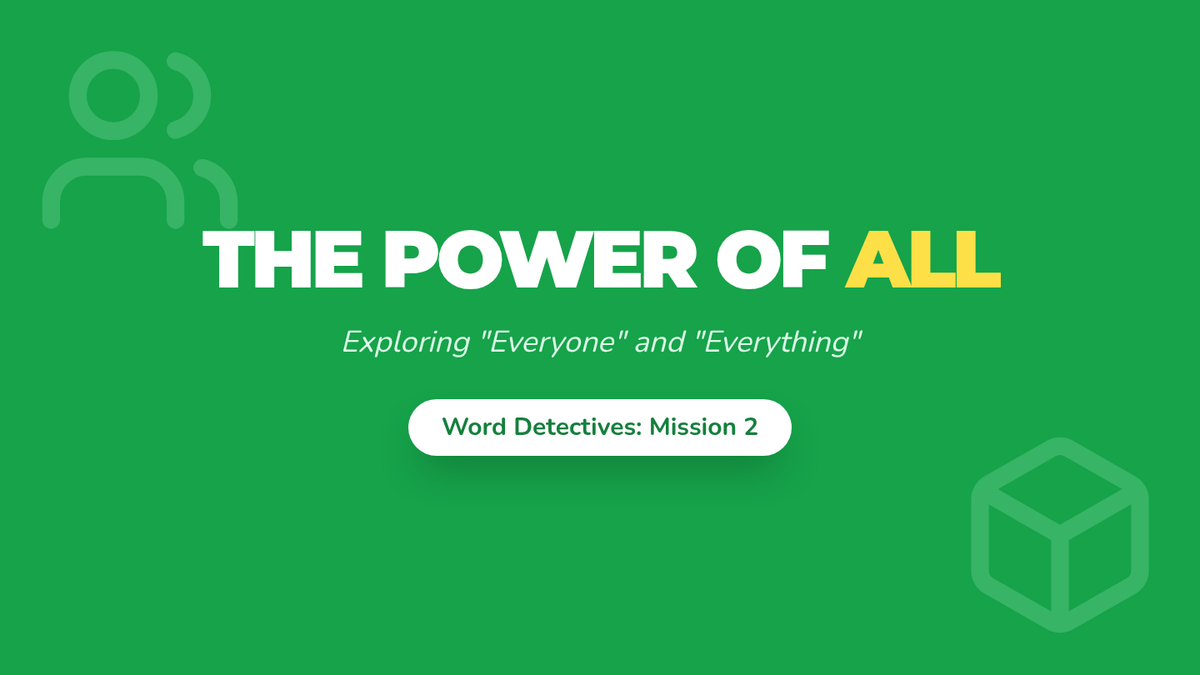 Students explore the pronouns 'everyone' and 'everything' to describe whole groups and collections, creating visual representations of 'all'.