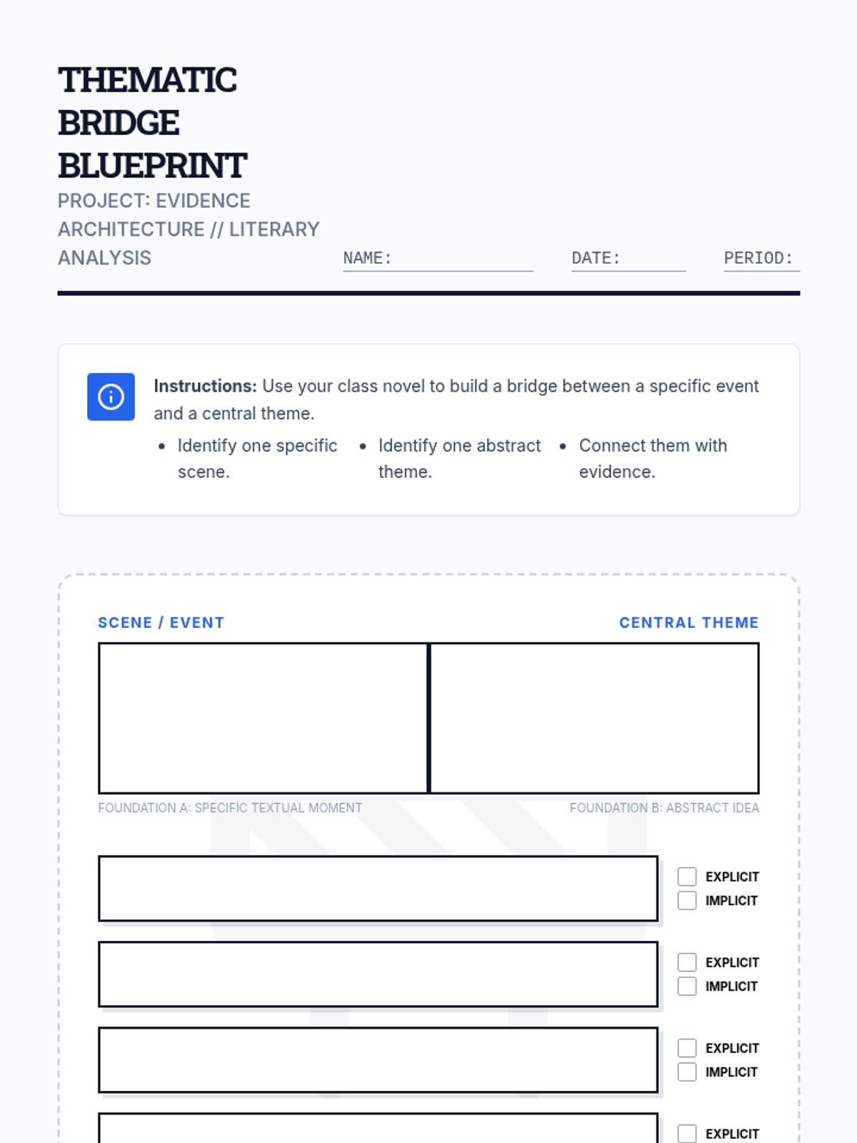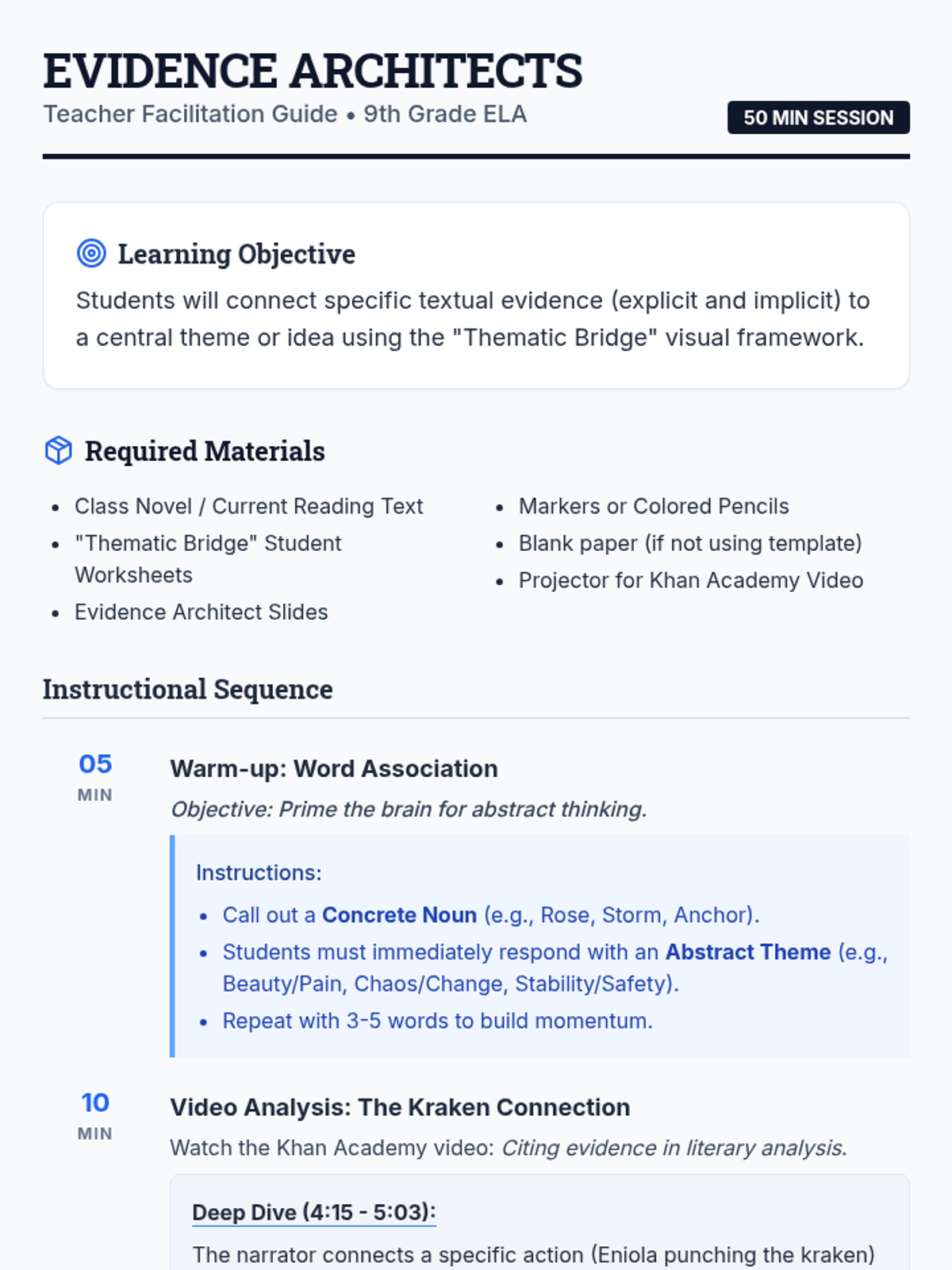 A 9th-grade ELA lesson focused on bridging the gap between specific textual evidence and abstract themes through the visual metaphor of a bridge. Students analyze a Khan Academy video and apply the concepts to their current class novel.