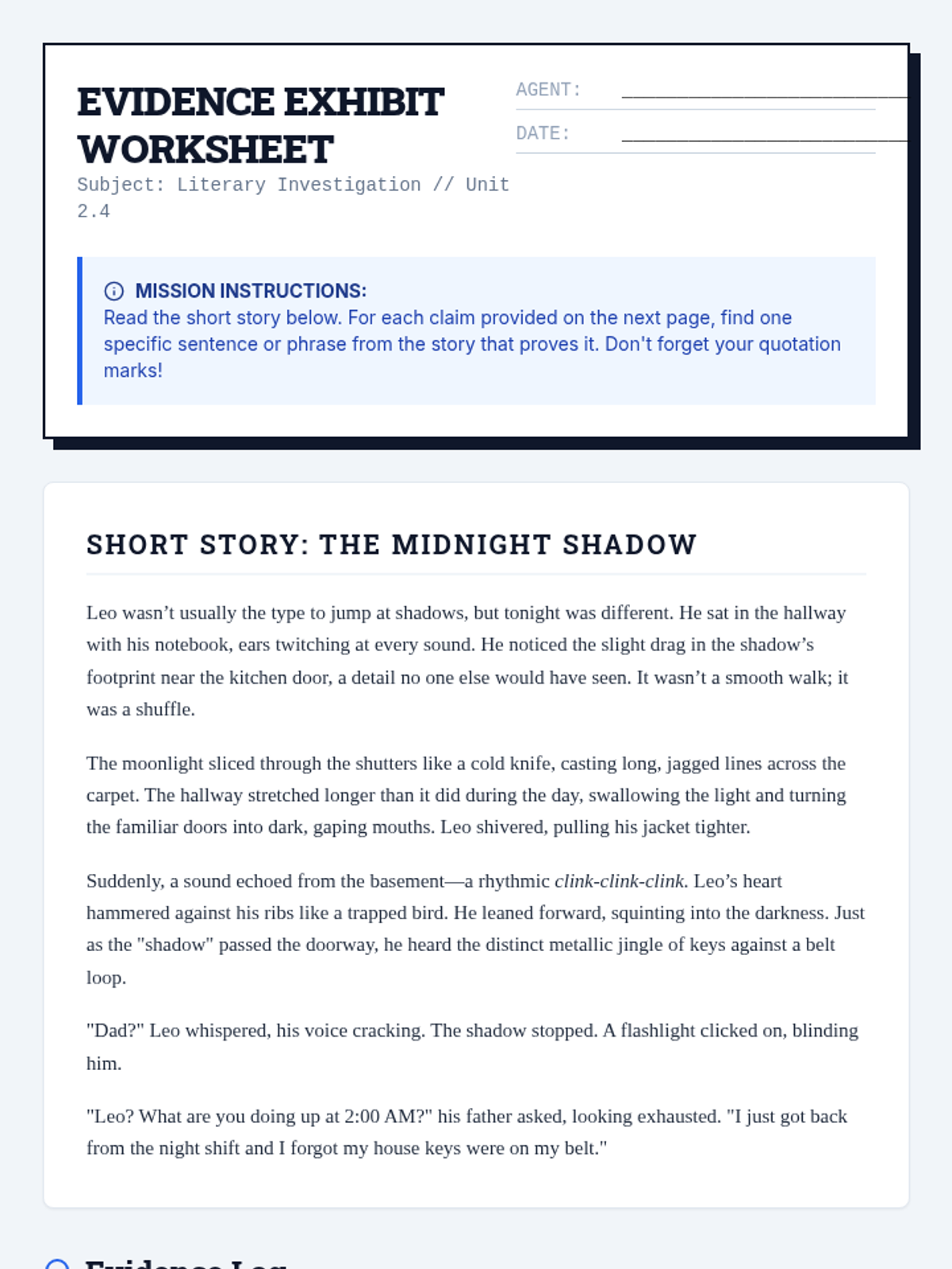 A fast-paced, 30-minute lesson where students become literary detectives, learning to identify and use specific textual evidence to support claims about short fiction.