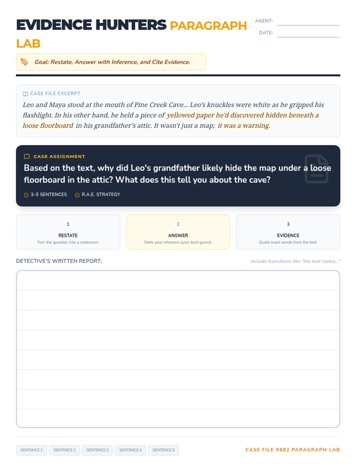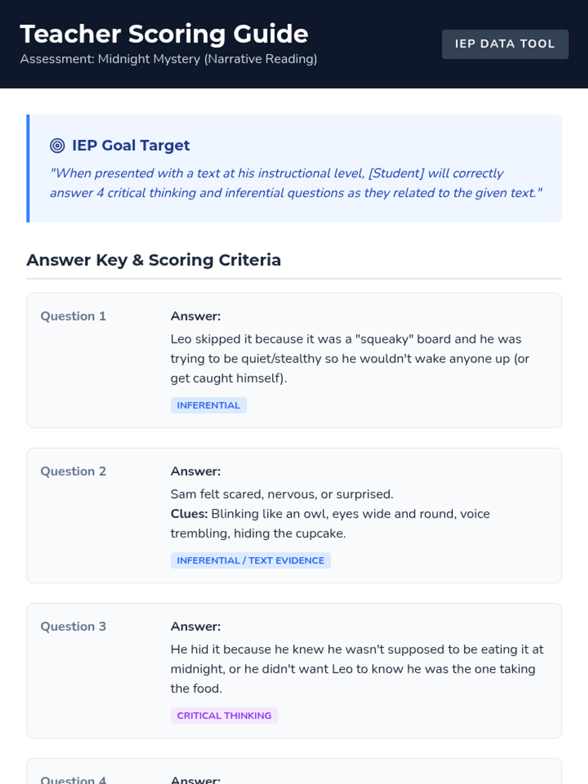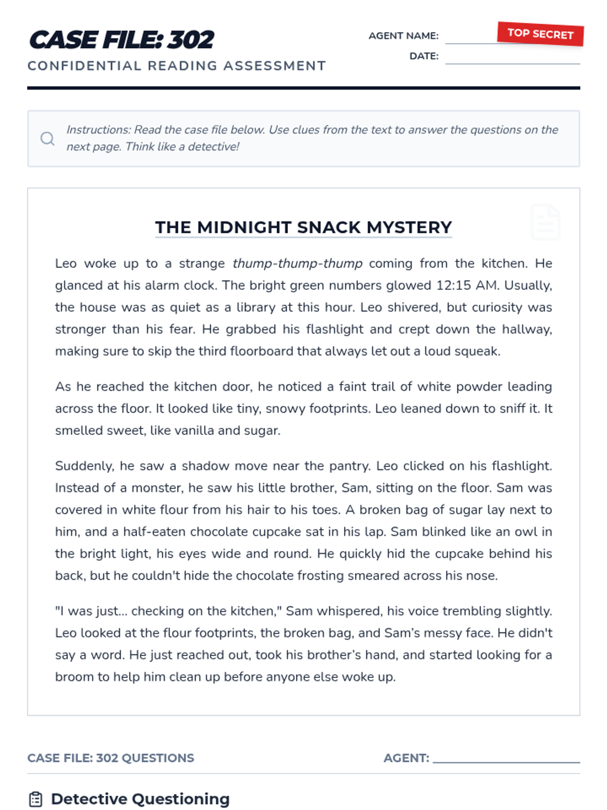 A 3rd-grade reading assessment focused on critical thinking and inferential comprehension through a mystery narrative. Students act as detectives to uncover meaning beyond the literal text.