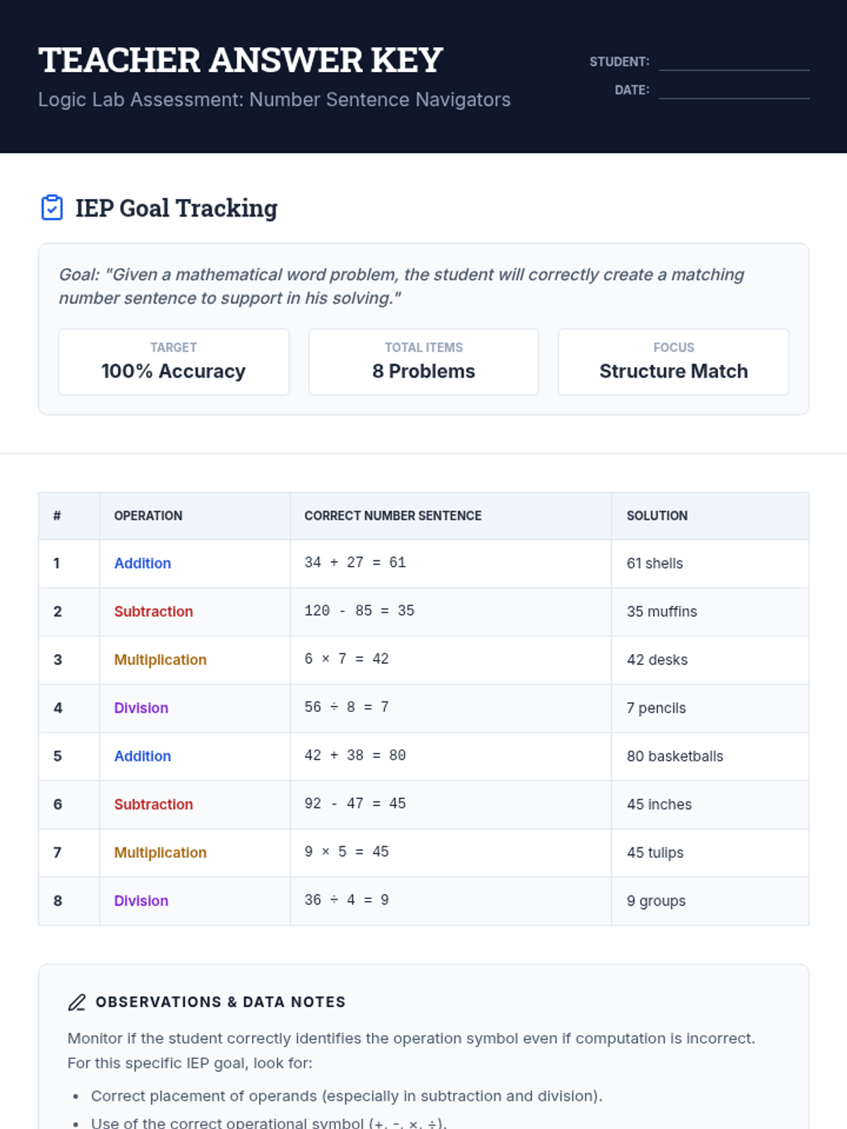 A lesson focused on translating word problems into mathematical number sentences across all four operations to meet specific IEP goals.