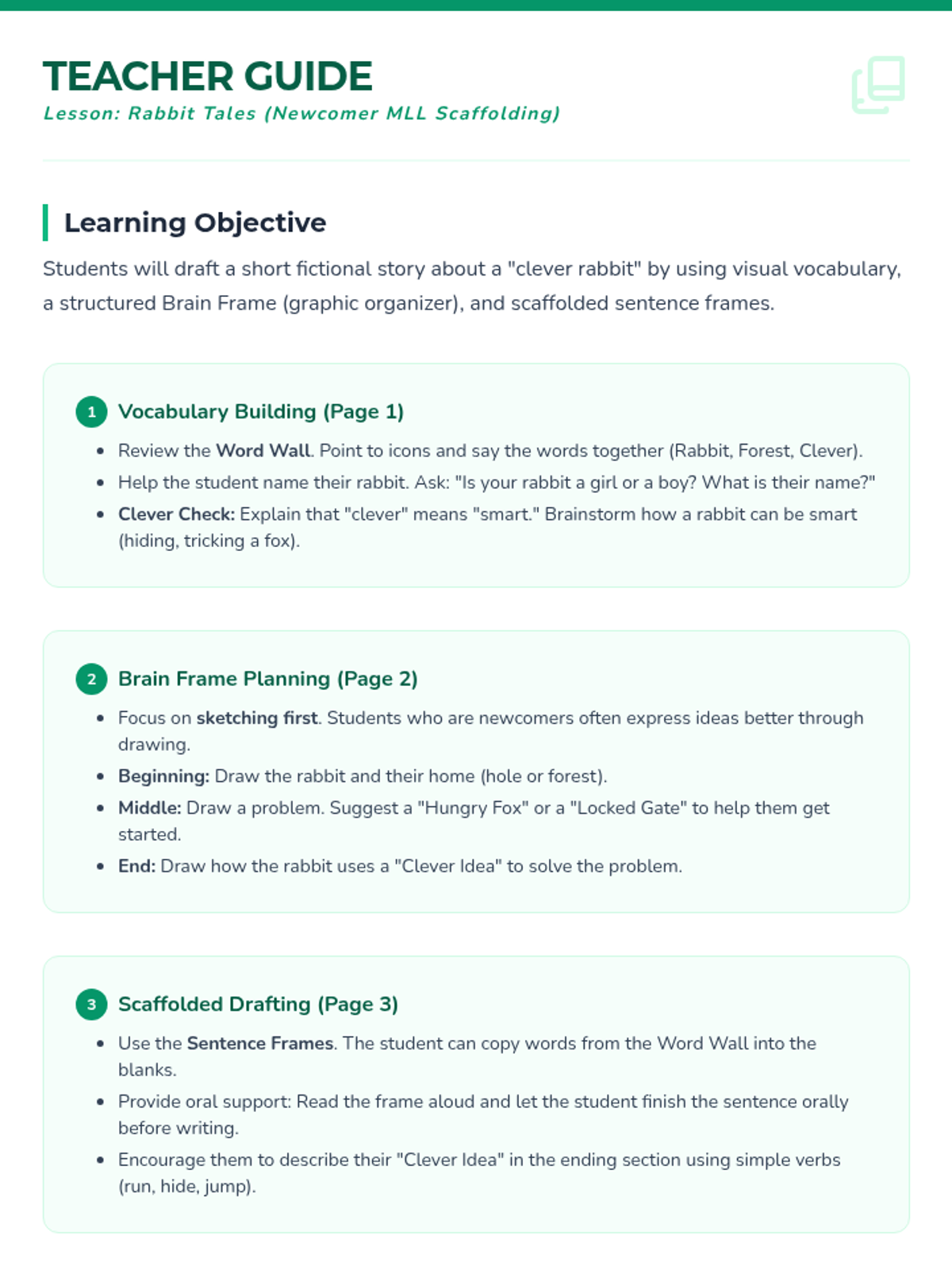 A comprehensive writing unit designed for newcomer multilingual learners to draft a fictional story about a clever rabbit. This lesson includes vocabulary building, structured planning with a brain frame, and scaffolded drafting.