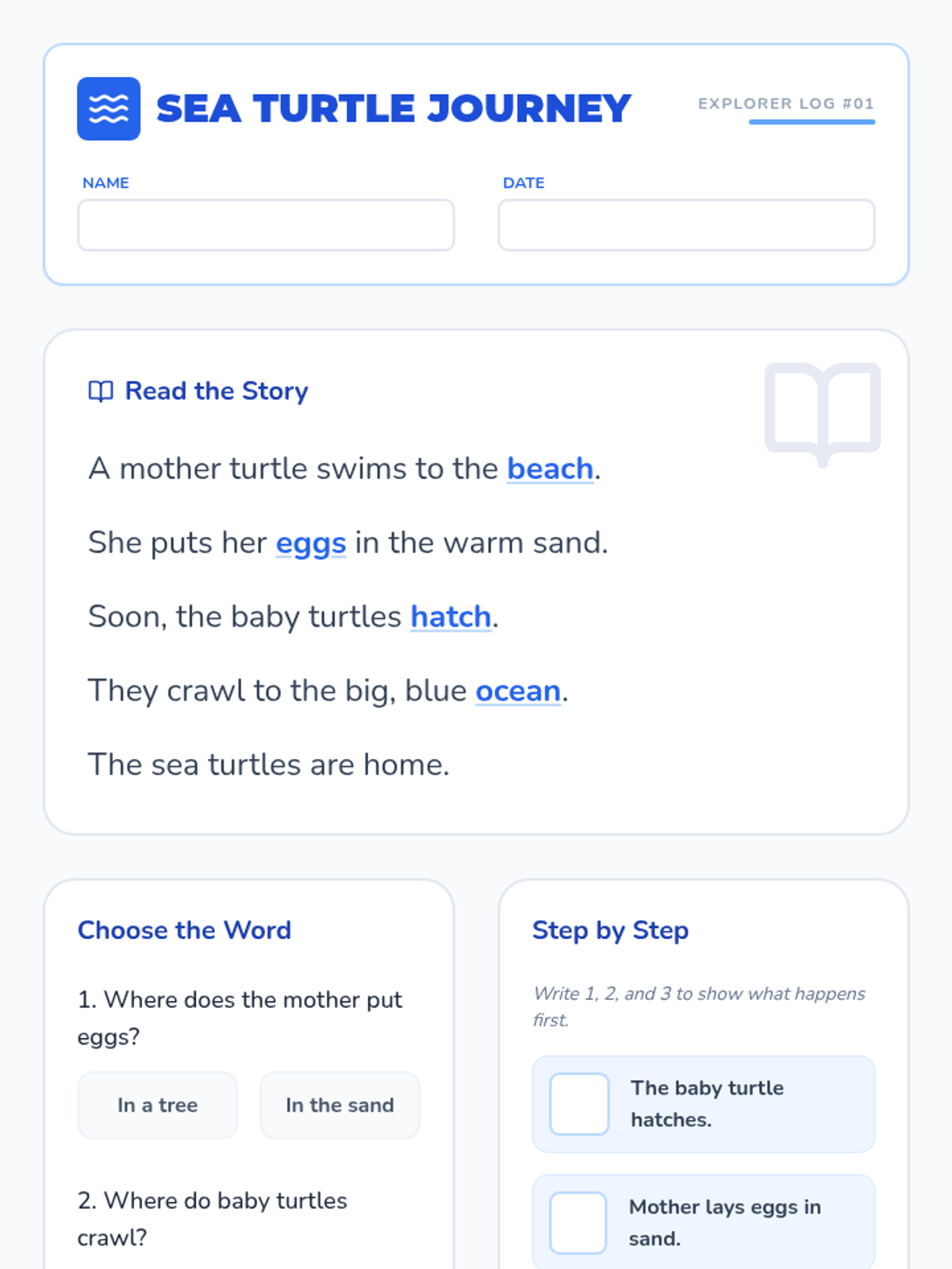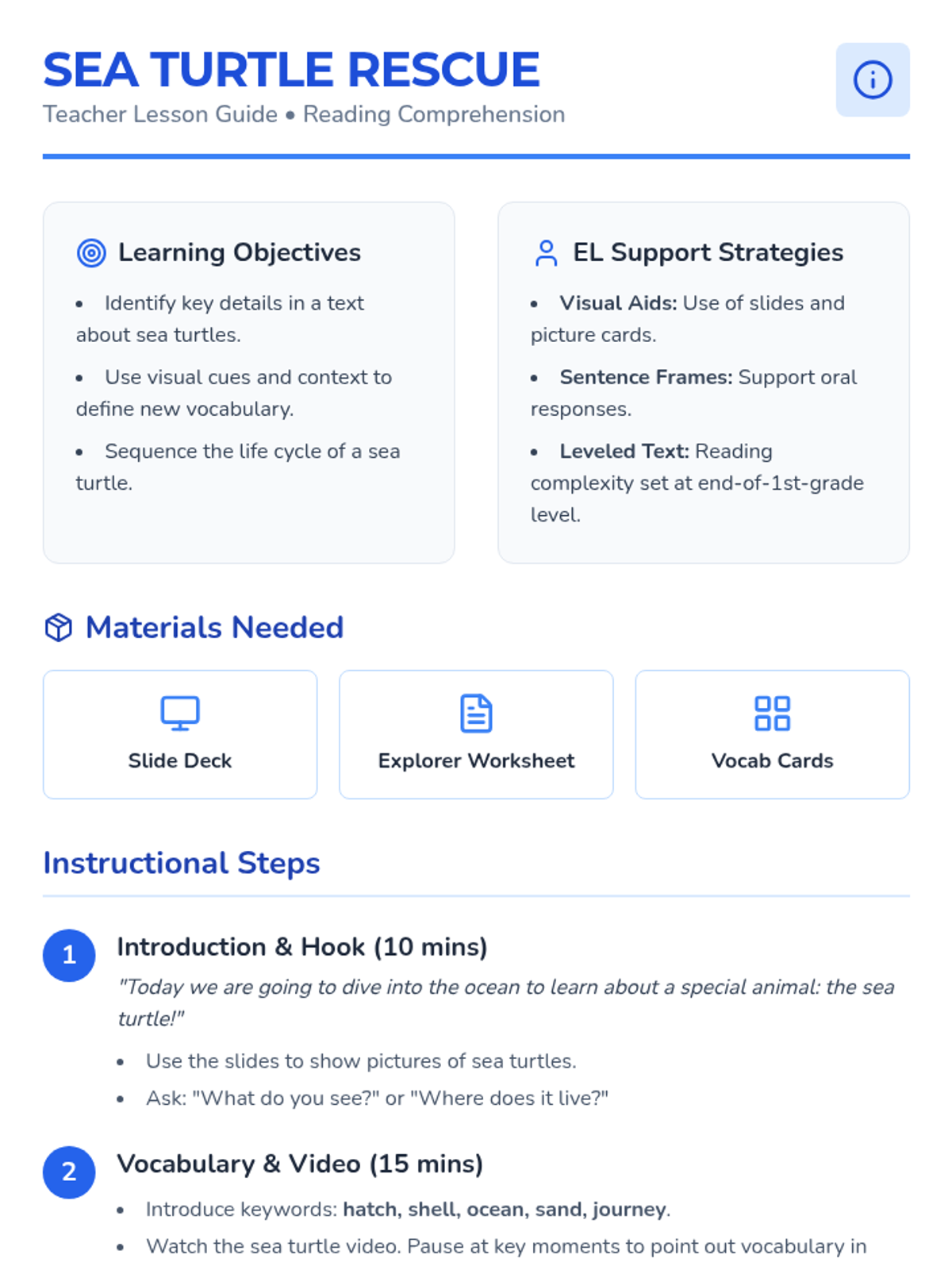 A reading comprehension lesson for 4th-grade EL students focusing on sea turtles, using visual supports and leveled text to build vocabulary and understanding of life cycles.