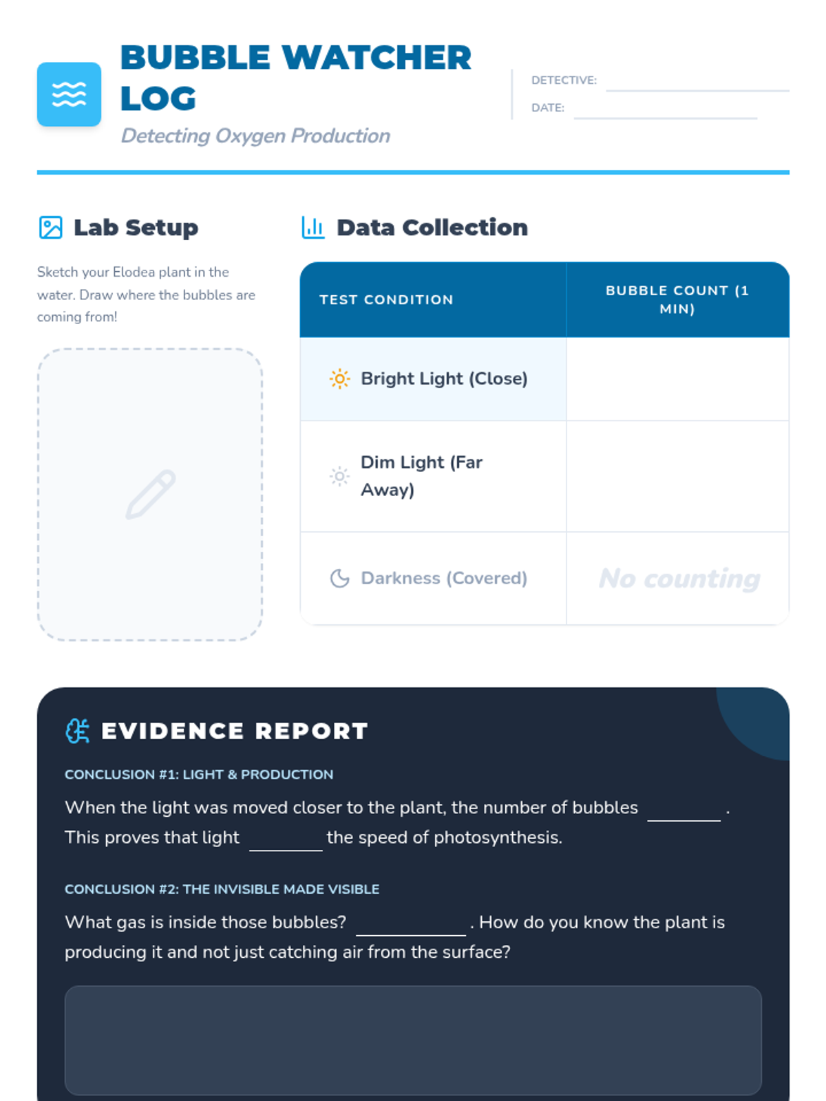 Students observe aquatic plants to find physical evidence of oxygen production, confirming the chemical output of photosynthesis.