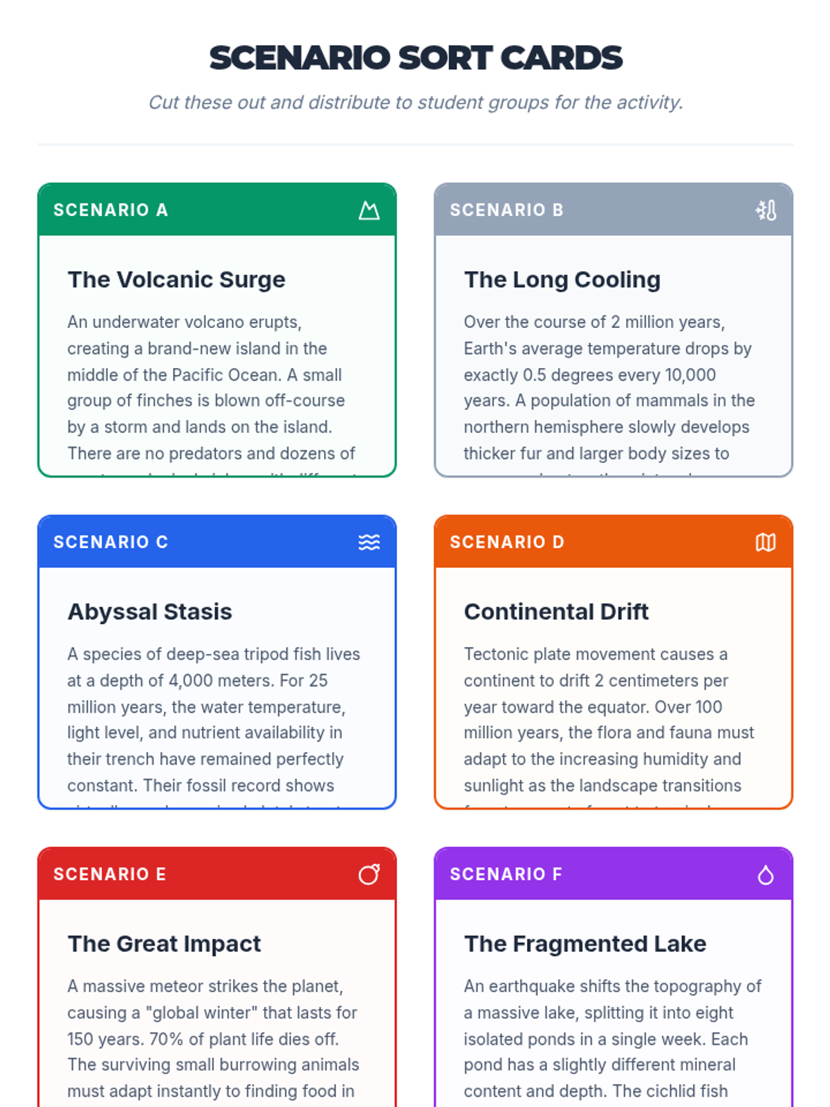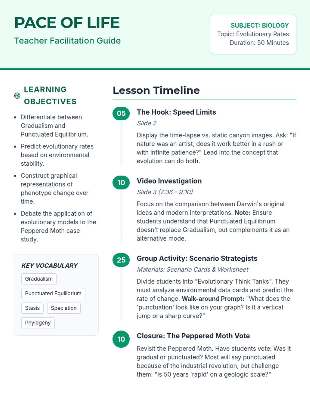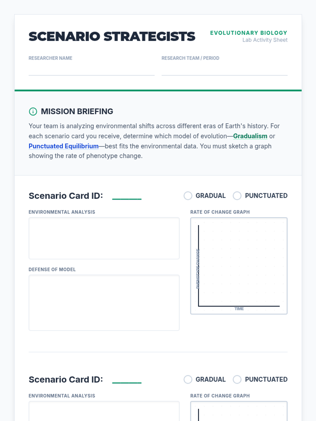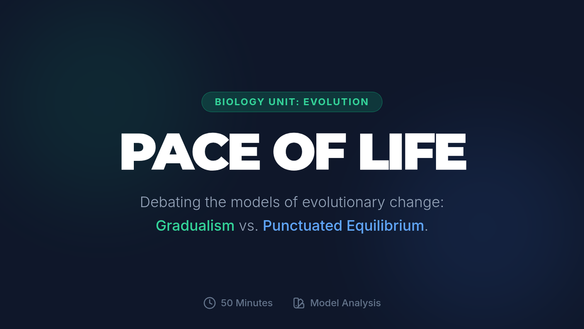 A high school biology lesson comparing Darwinian Gradualism and Punctuated Equilibrium. Students analyze real-world scenarios, graph evolutionary rates, and debate which model best fits specific environmental pressures.