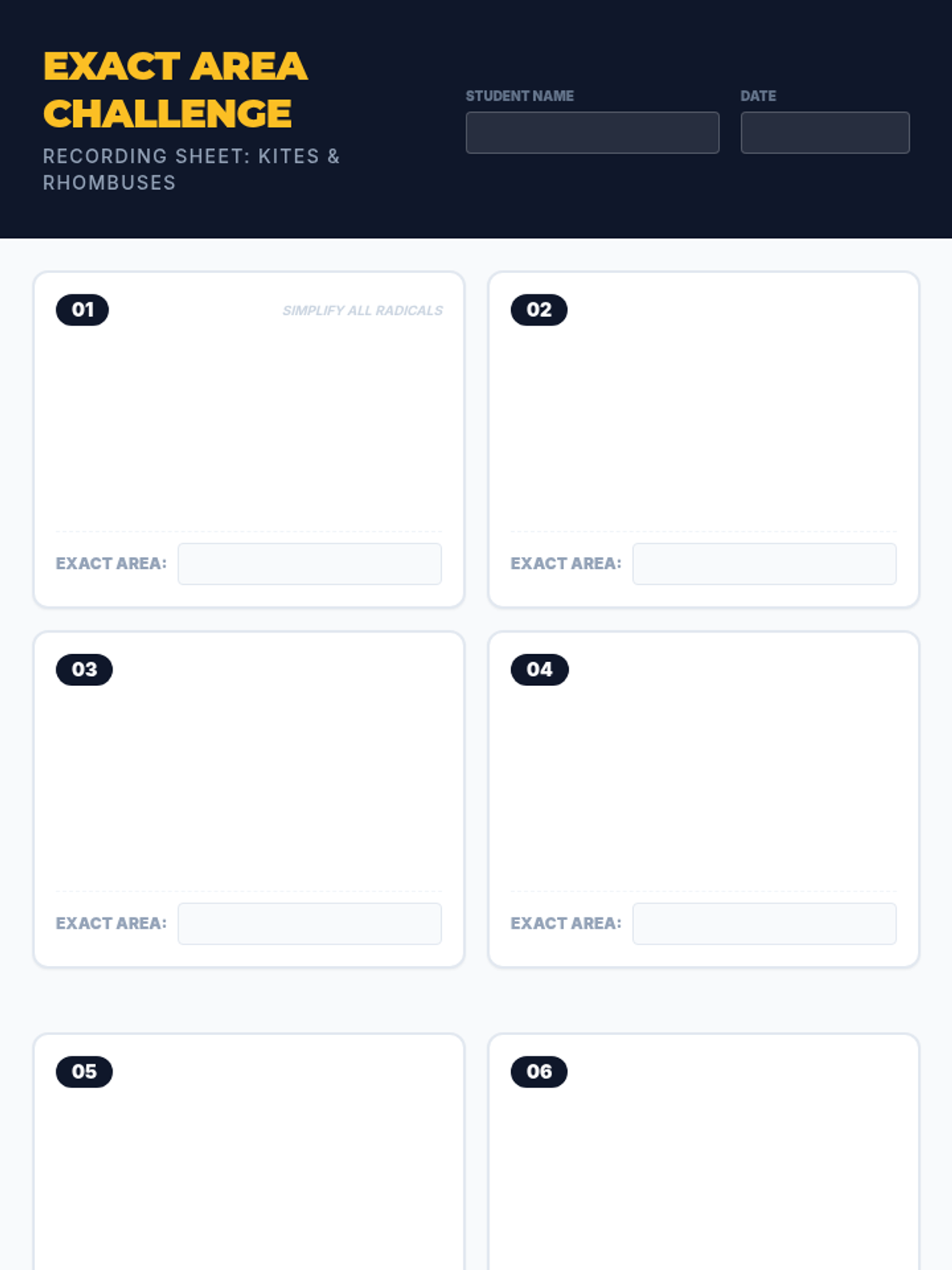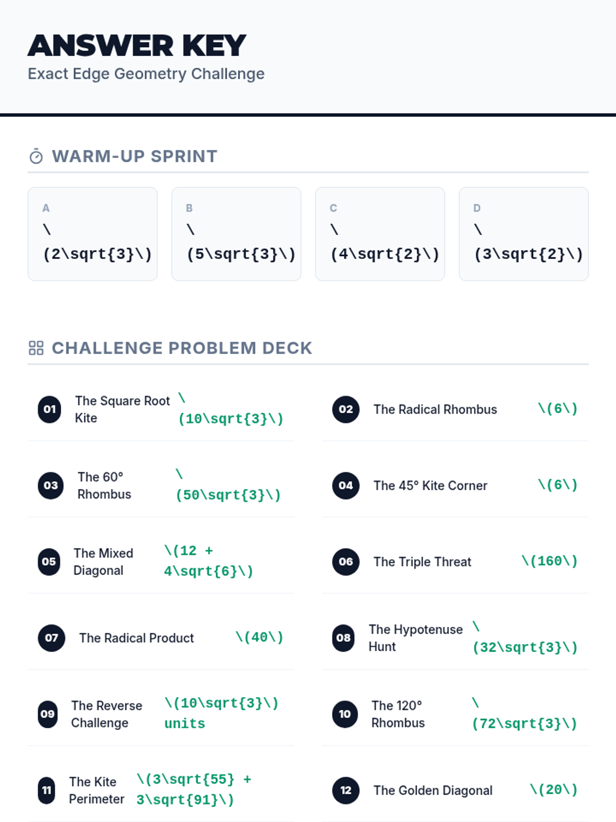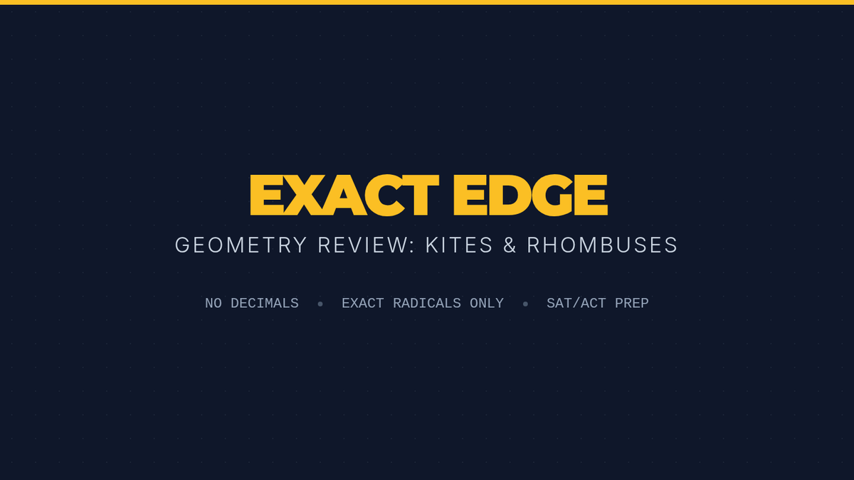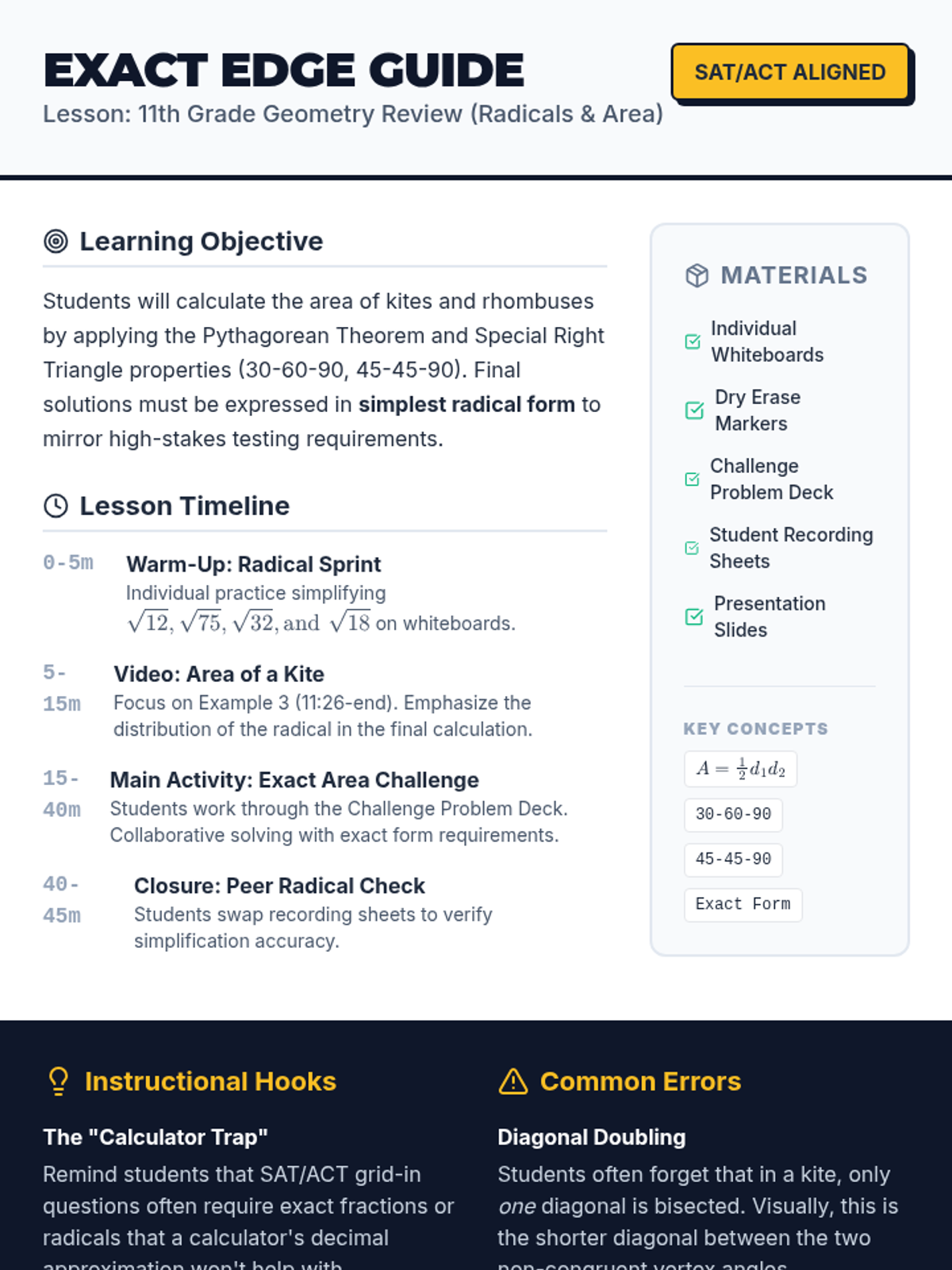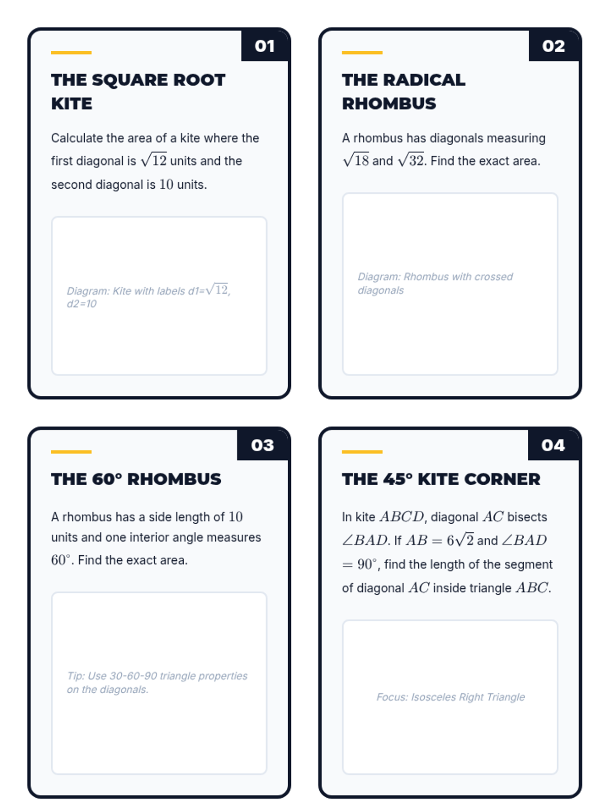 An intensive 11th-grade math review focusing on geometric properties of kites and rhombuses, utilizing special right triangles and requiring answers in exact radical form. Students practice simplifying radicals and applying the area formula A = 1/2 * d1 * d2.