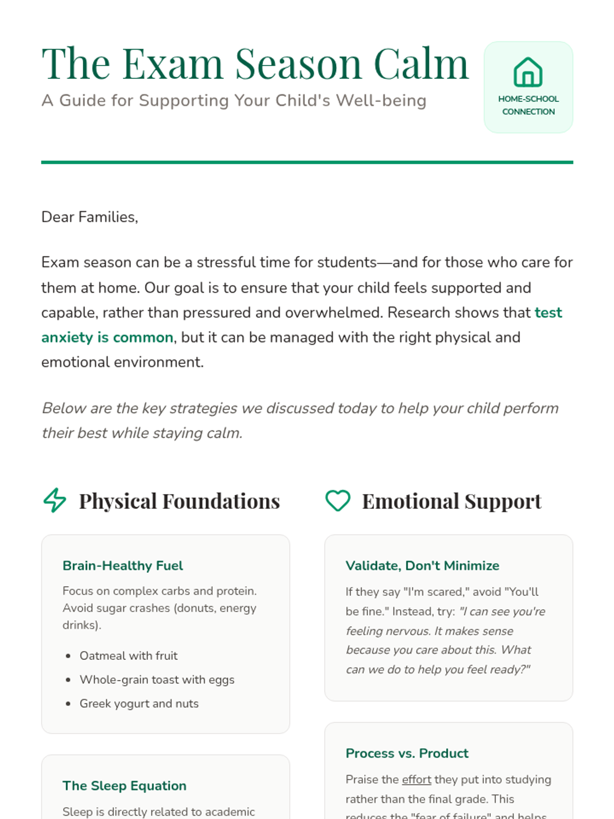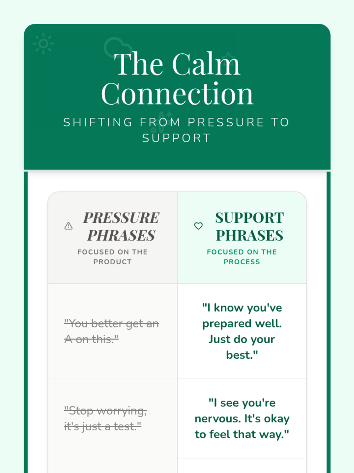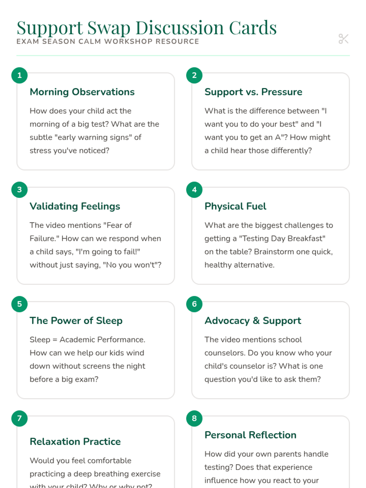 A workshop for parents and caregivers to learn strategies for supporting children through test anxiety. The lesson focuses on the parent's role in providing physical support (nutrition, sleep) and emotional support (validating feelings, reducing pressure) using insights from the 'How to Overcome Test Anxiety' video.