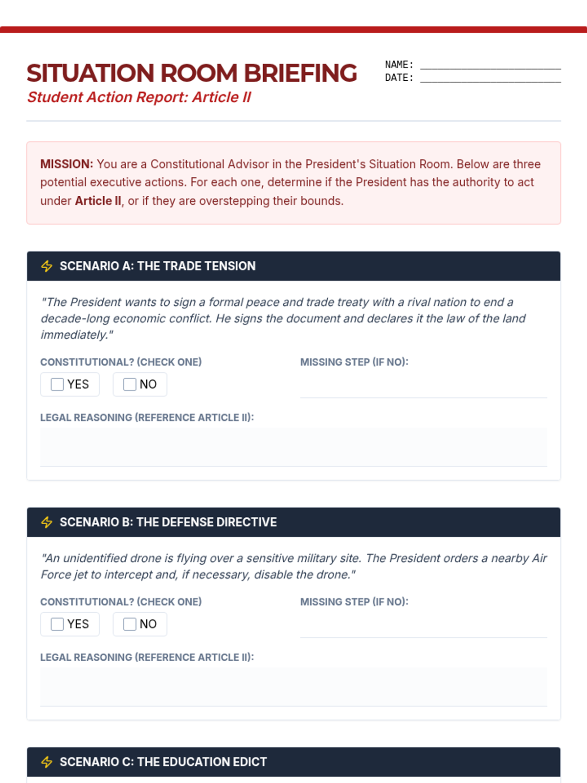 Focusing on Article II, students analyze executive authority through a 'Situation Room' scenario, evaluating presidential actions against constitutional limits.