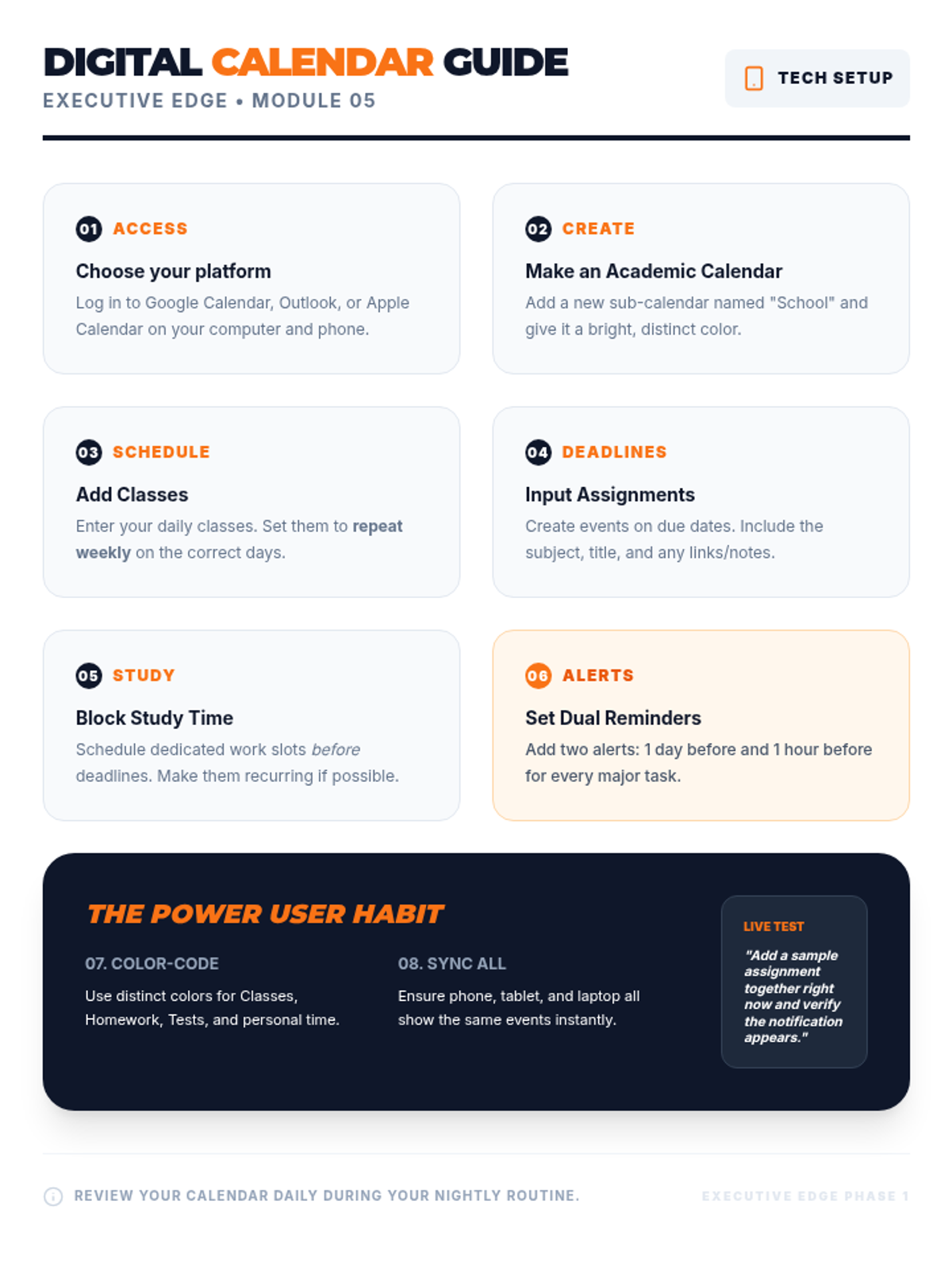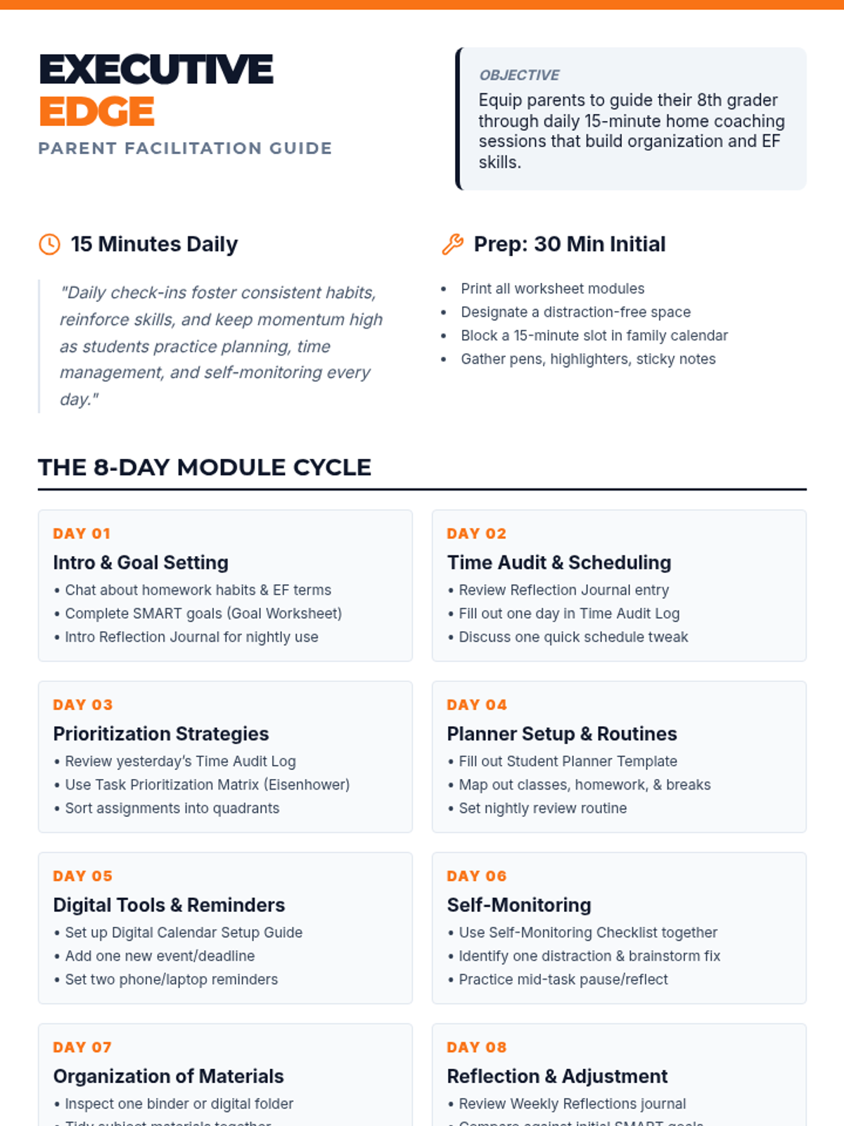 A comprehensive 8th-grade executive functioning coaching program featuring a parent-led daily routine and structured skill-building modules. This individual coaching plan focuses on time management, prioritization, and organizational habits through December 2025.