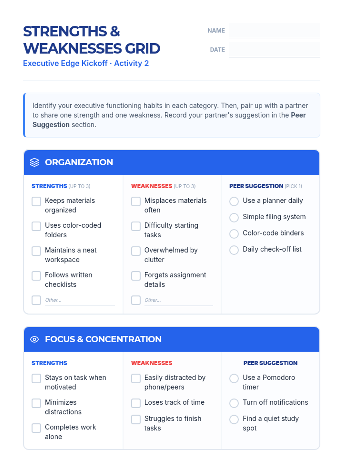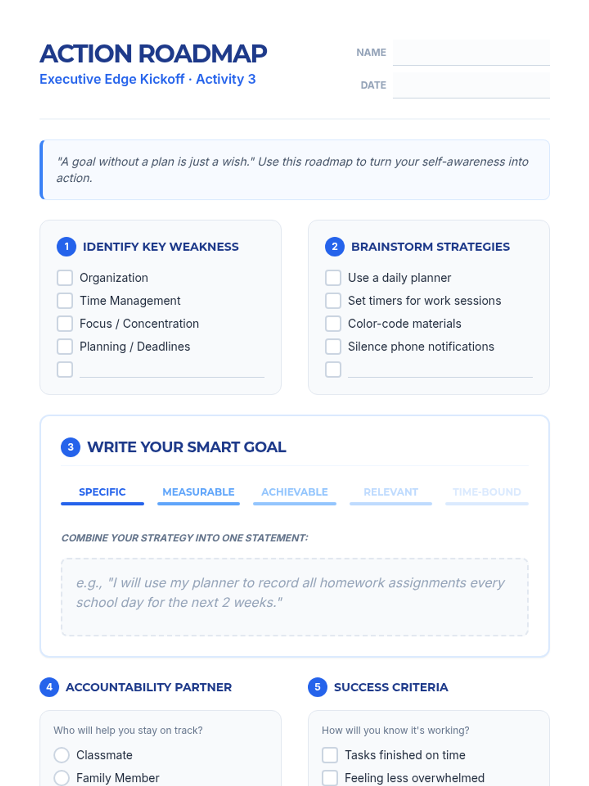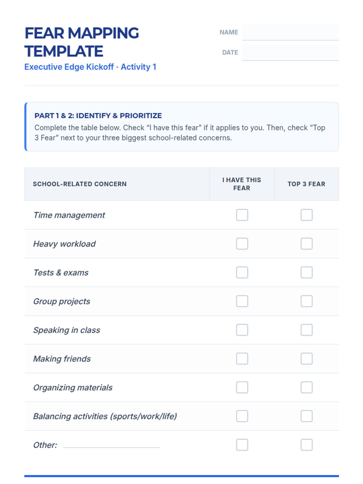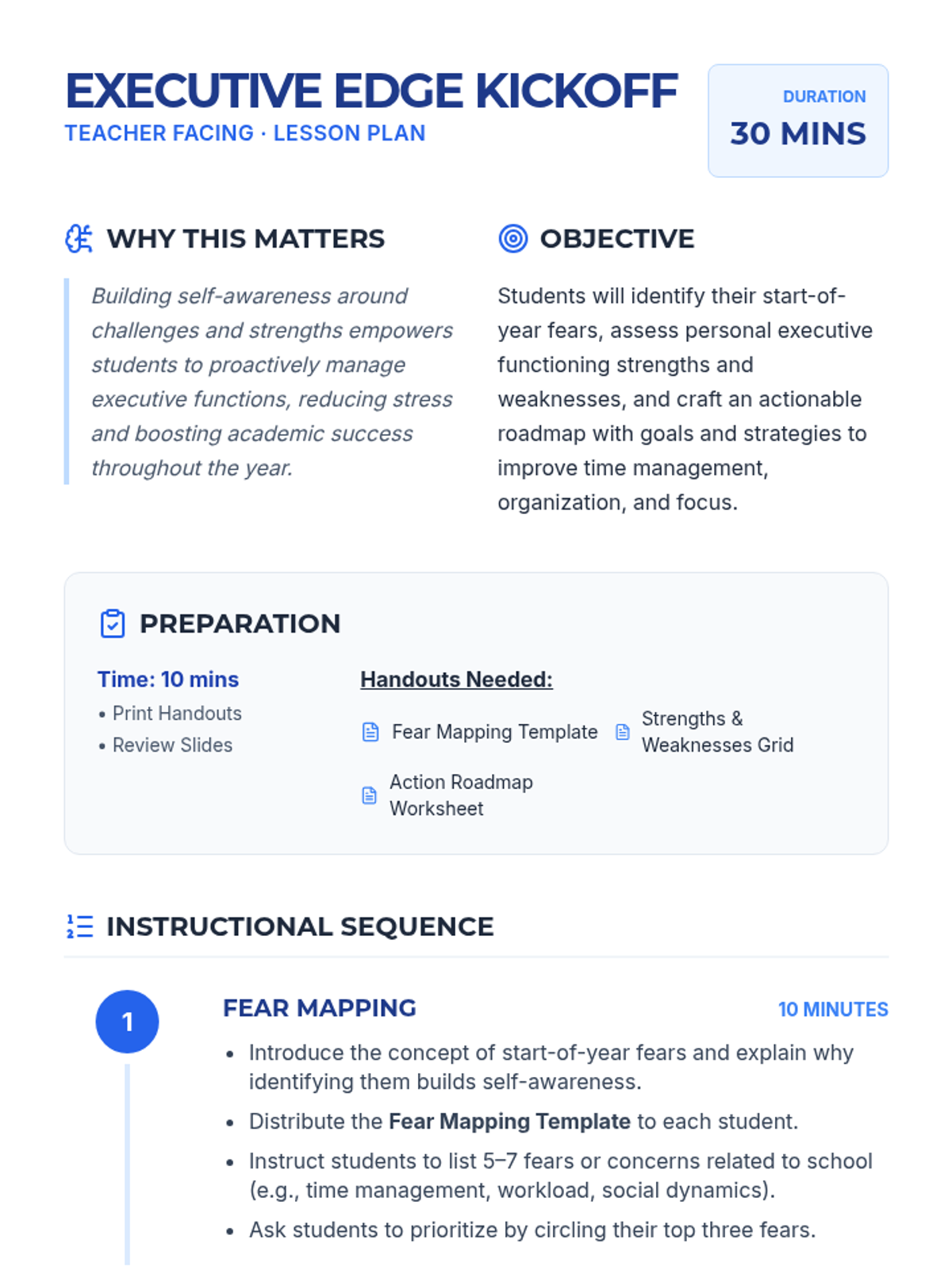 A 30-minute Tier 1 lesson for 10th graders focused on identifying start-of-year fears, assessing executive functioning skills, and creating an actionable roadmap for success.