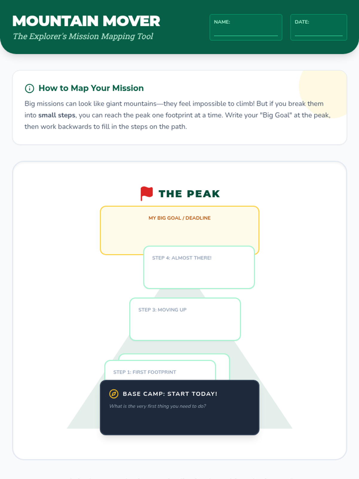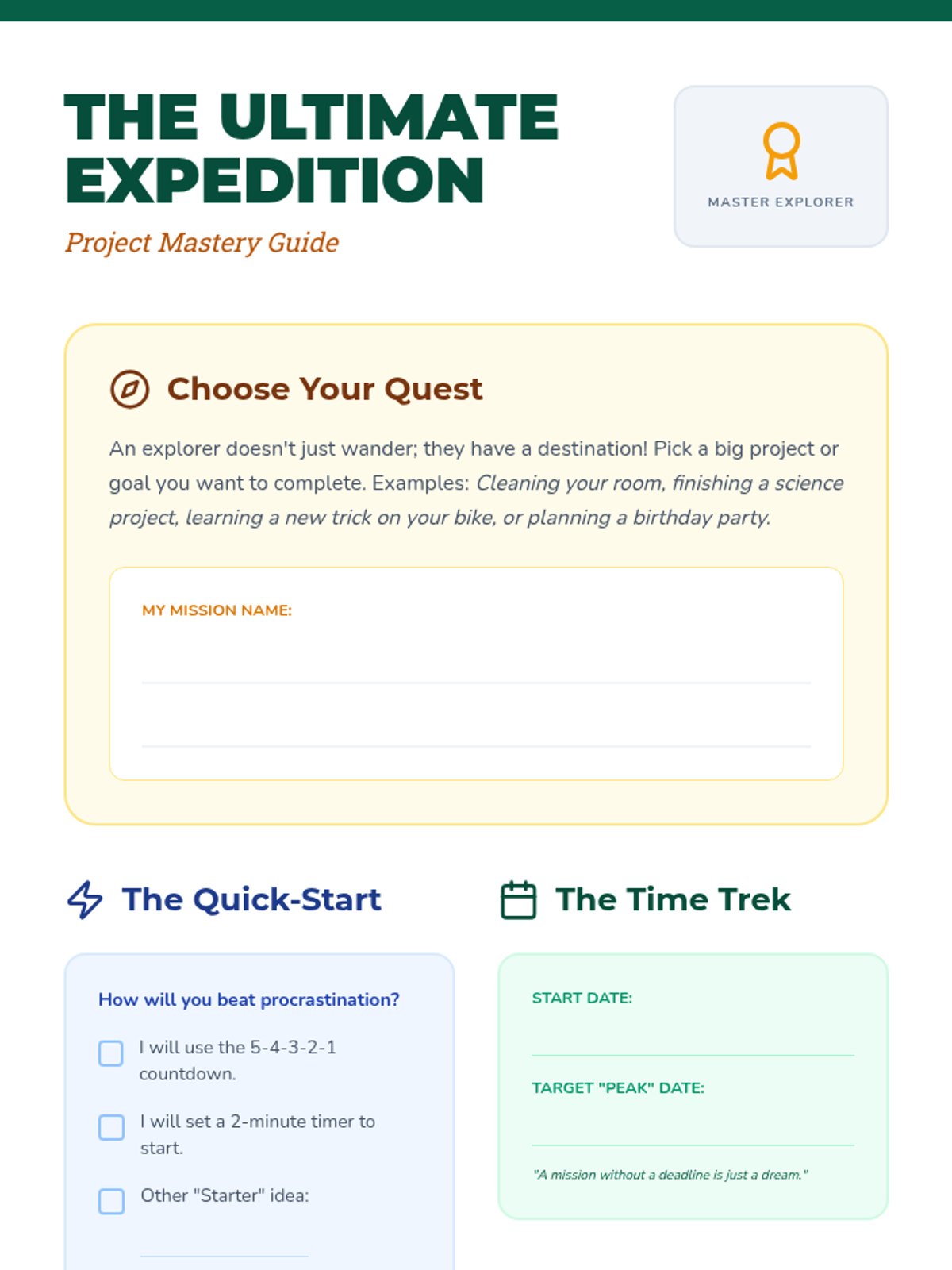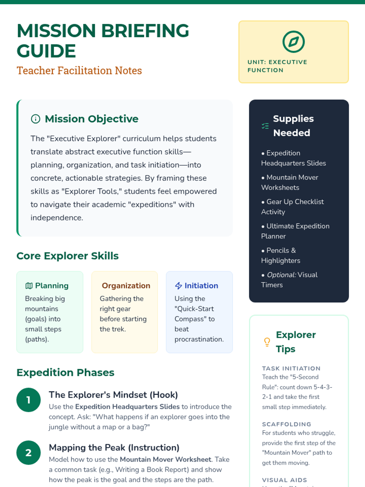 A comprehensive lesson designed to teach 3rd-5th graders essential executive function skills through an engaging explorer theme. Students will learn to plan, organize, and initiate tasks using visual tools and hands-on activities.