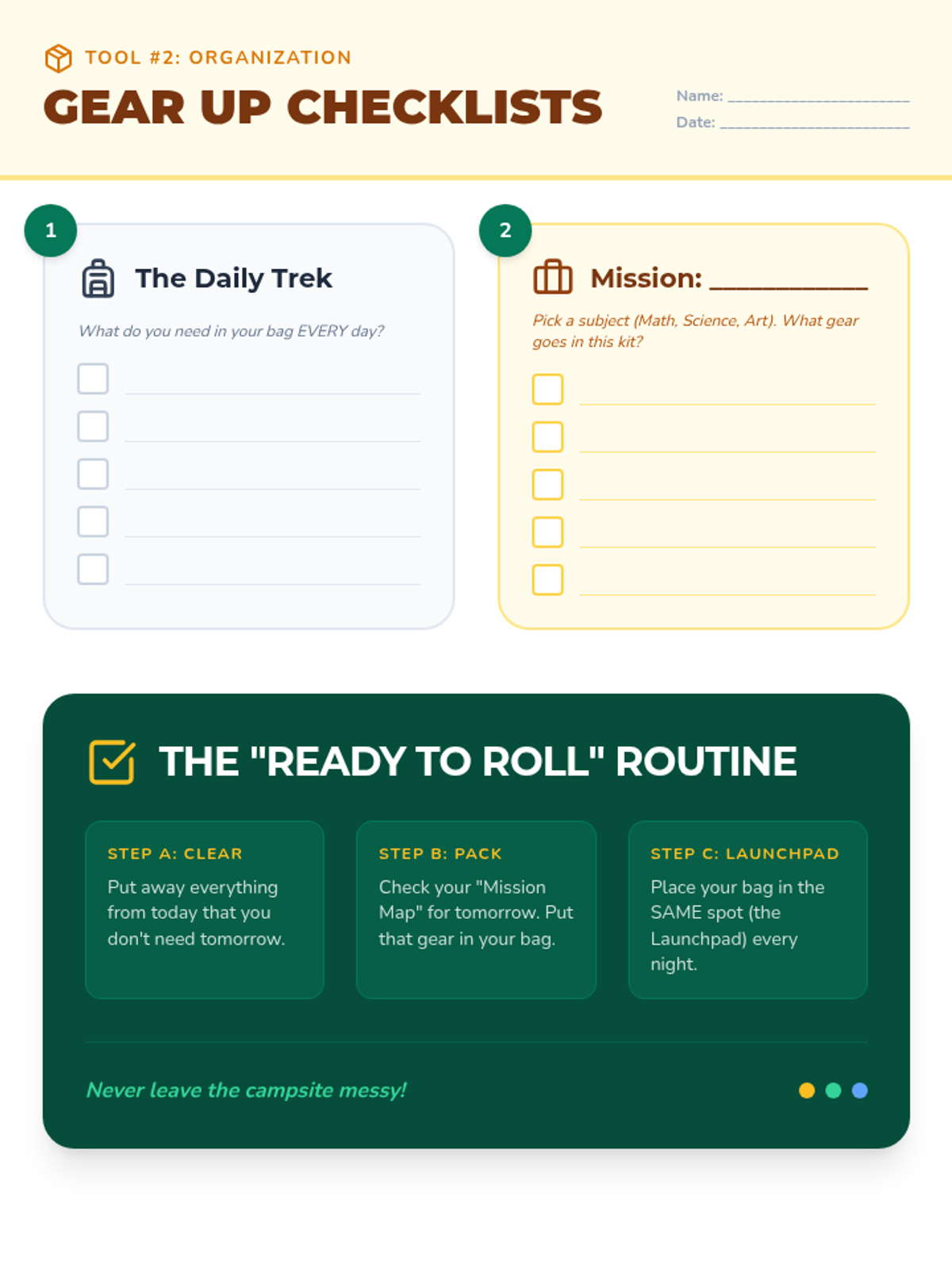 A set of tools designed to help students with ADHD improve their organization, planning, focus, and task initiation through structured self-monitoring.