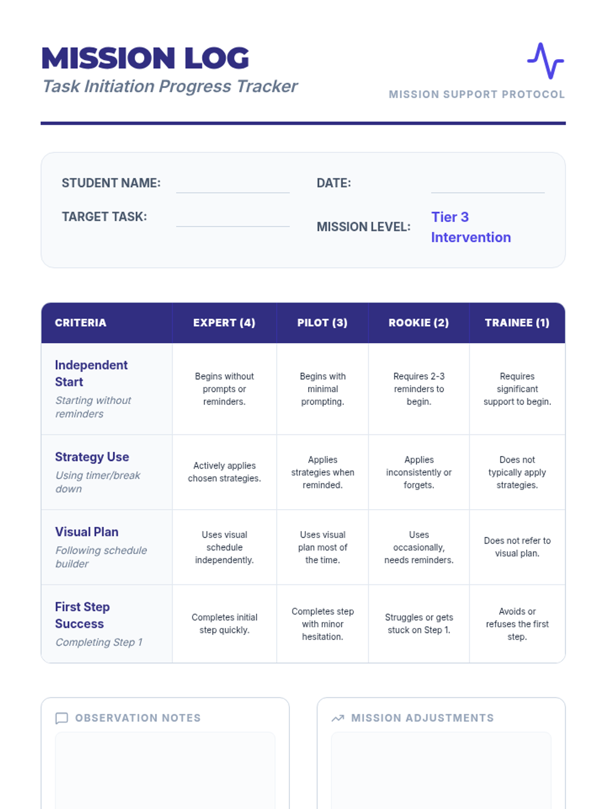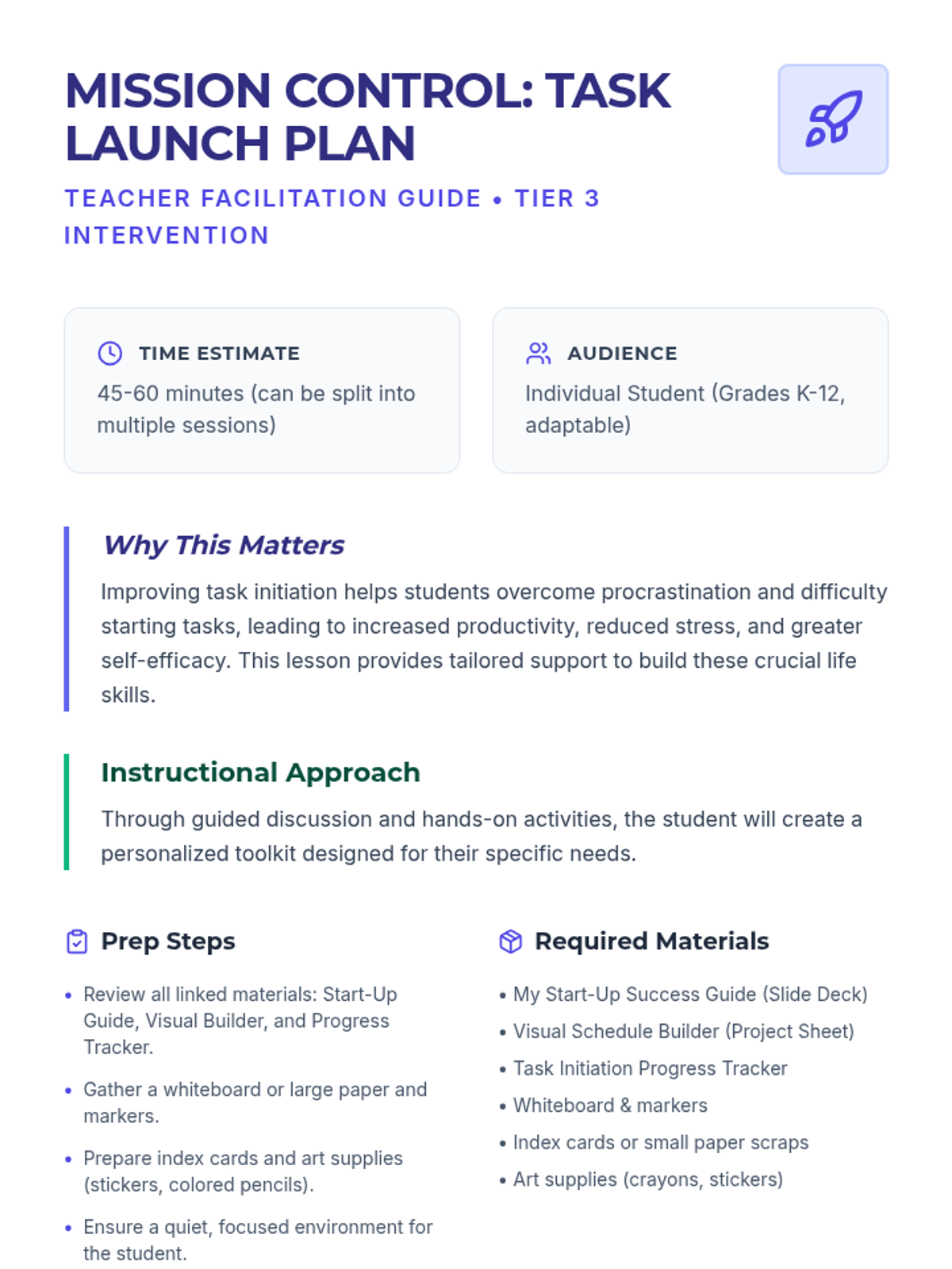 This Tier 3 intervention lesson provides individualized strategies for students struggling with task initiation. It includes a personalized launch plan, visual supports, and a progress tracker to foster independence and executive functioning skills.