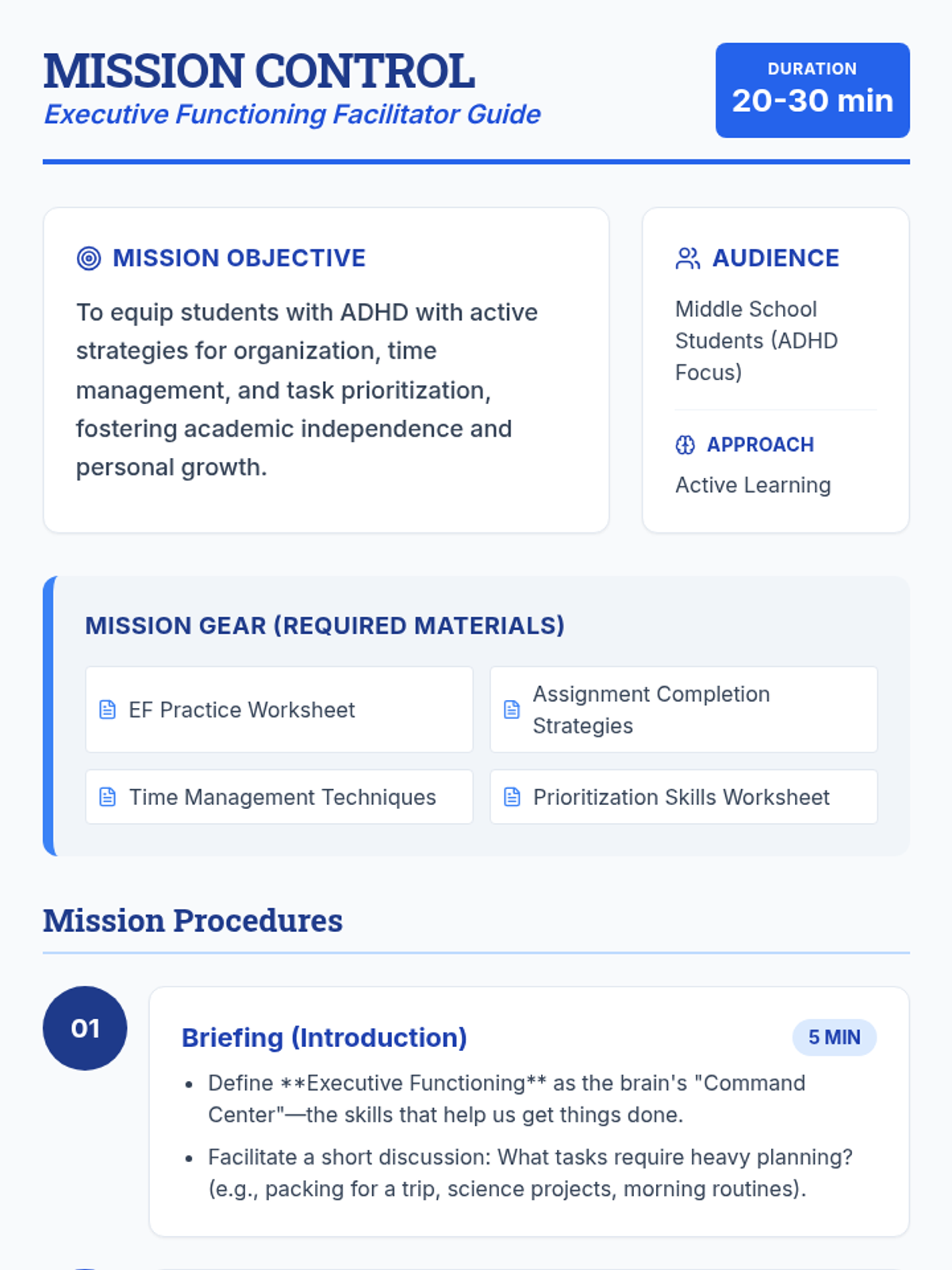 A targeted lesson designed for middle school students with ADHD to develop core executive functioning skills including organization, time management, and task prioritization through active learning.