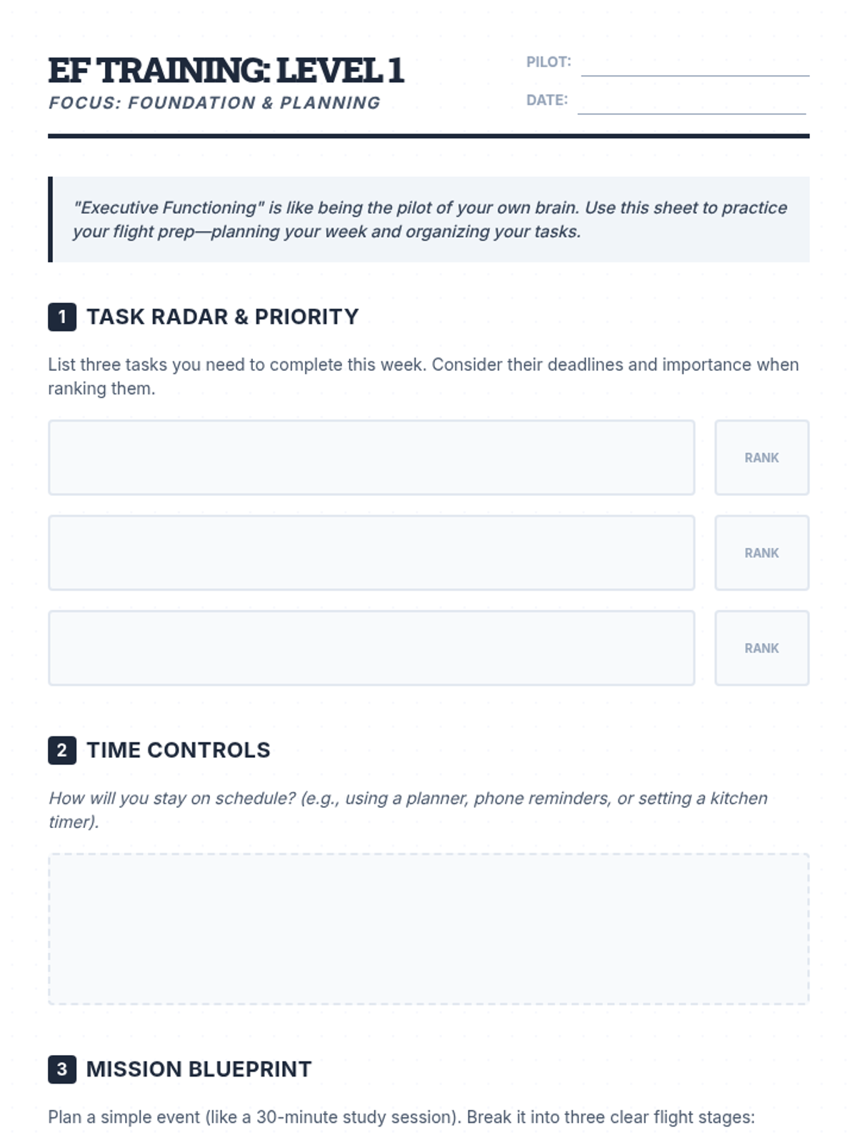 A 5-page workbook unit focused on strengthening executive functioning and planning skills for teenagers, using a 'Command Center' technical manual theme.