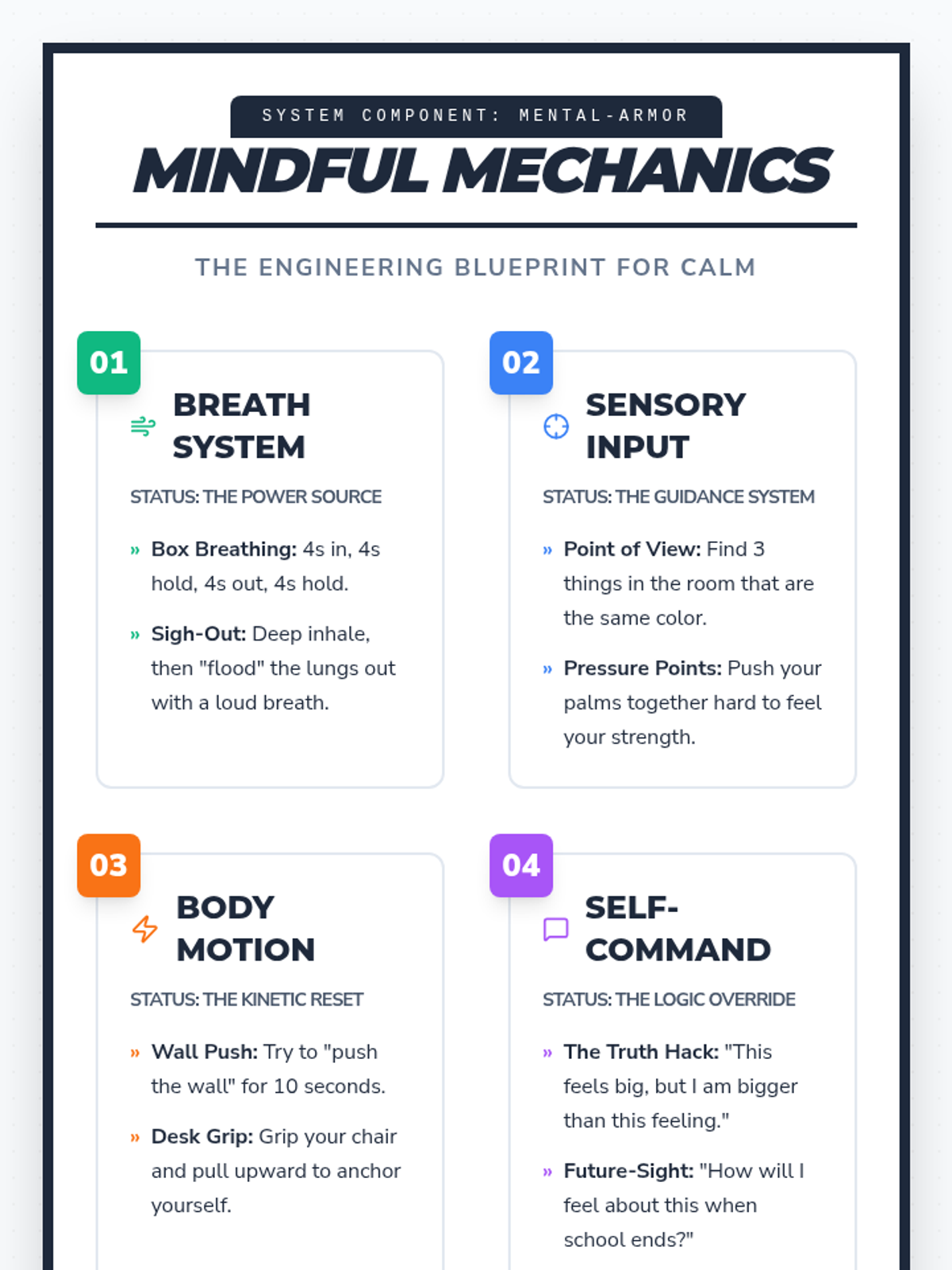 Students synthesize their learning by creating a digital coping strategy toolbox project, supported by a tactical anchor chart of mindfulness techniques.