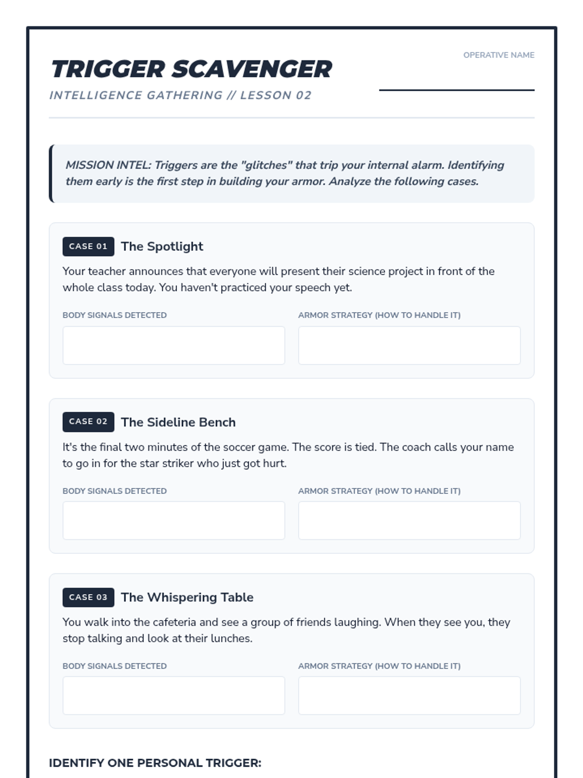 Students use detective skills to identify common triggers through scenarios and practice immediate 'quick-calm' responses.