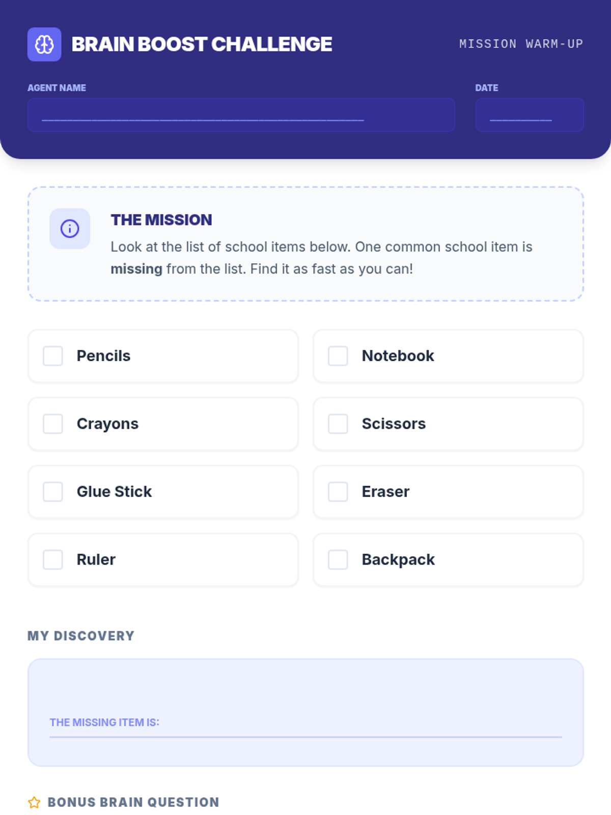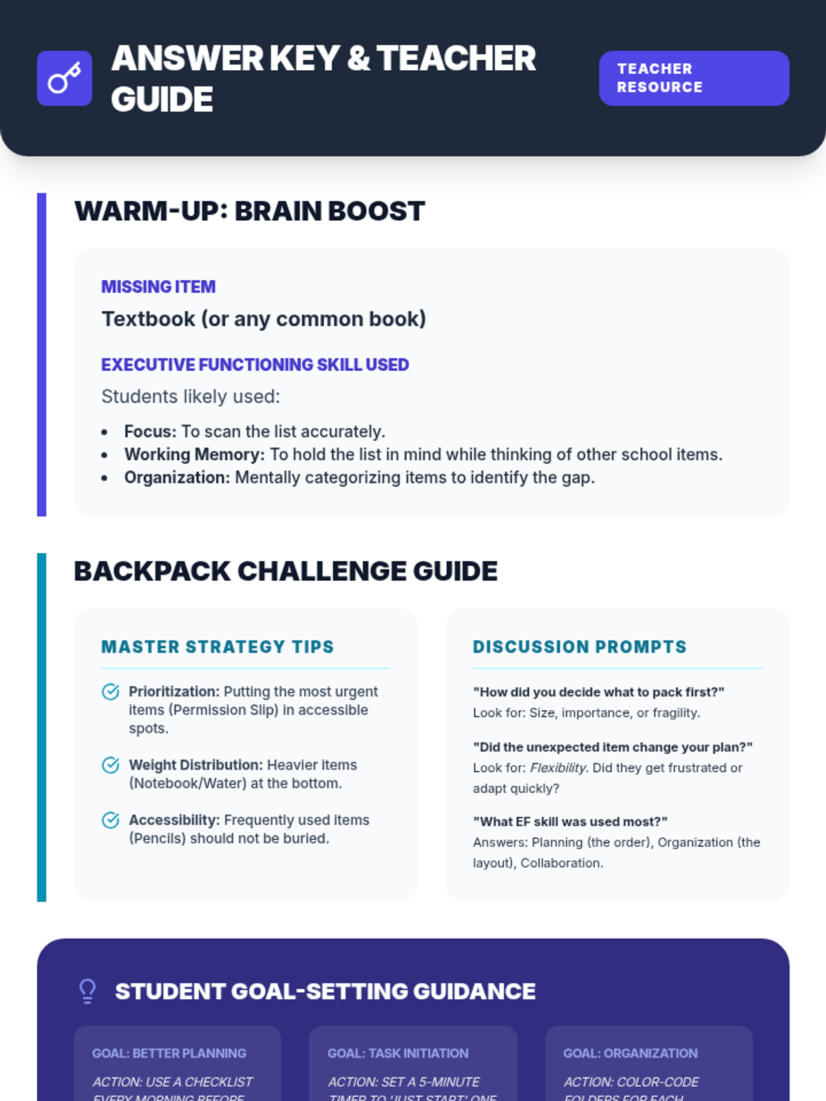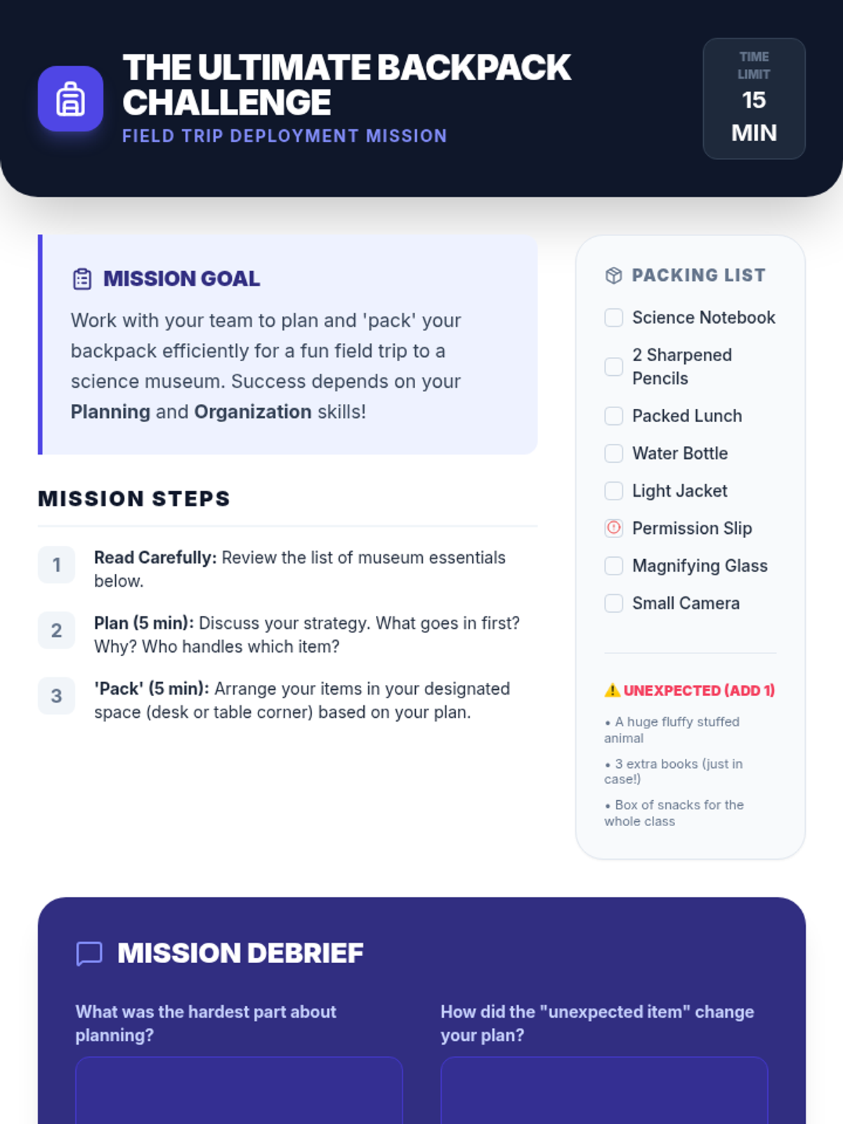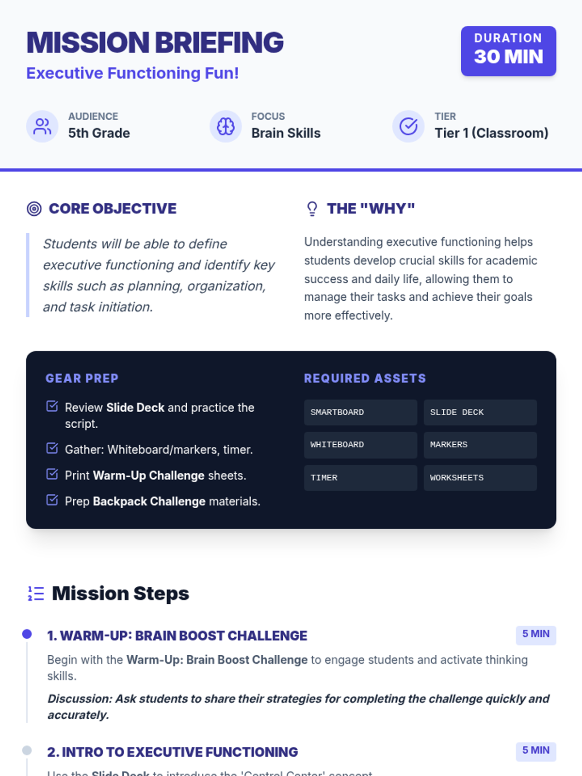 This 30-minute lesson introduces 5th graders to executive functioning skills like organization, planning, and task initiation through a mission-themed 'Brain Command Center' aesthetic. Students engage in the Ultimate Backpack Challenge to apply these skills in a practical, collaborative scenario.