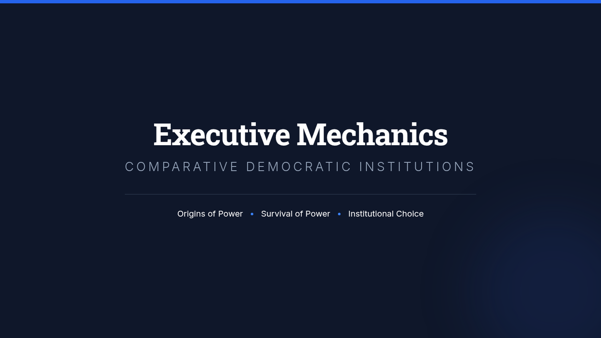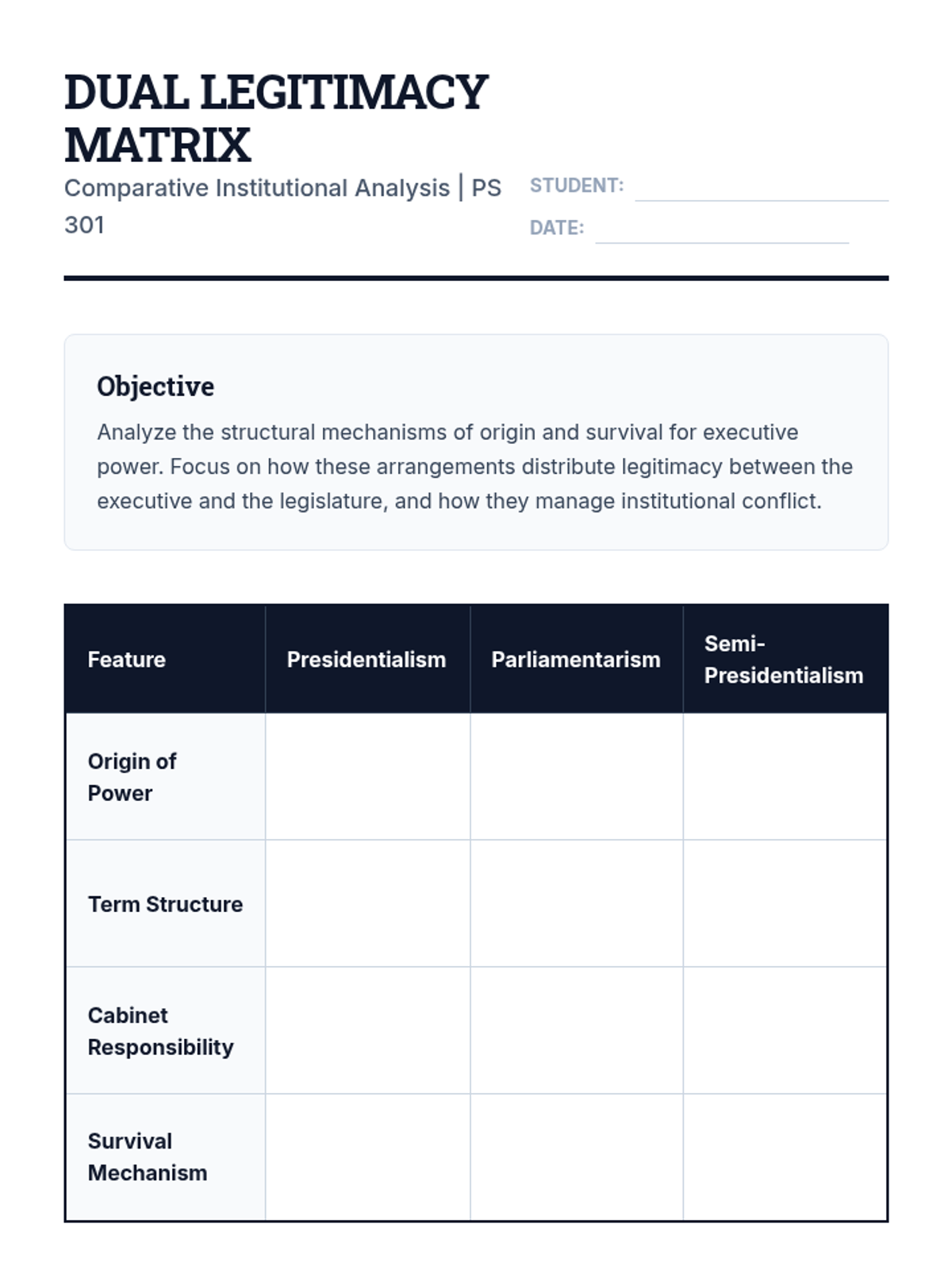 Analyze the mechanisms of origin and survival for executive power, comparing parliamentary, presidential, and semi-presidential systems. Focuses on concepts like dual legitimacy, confidence votes, and the potential for gridlock.