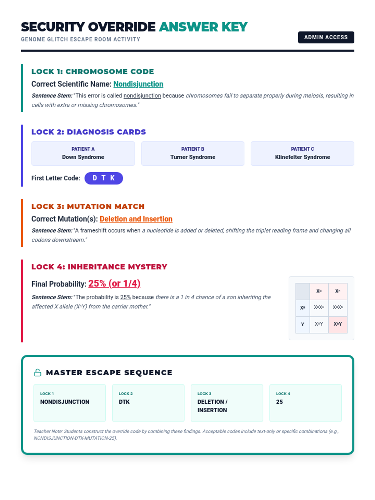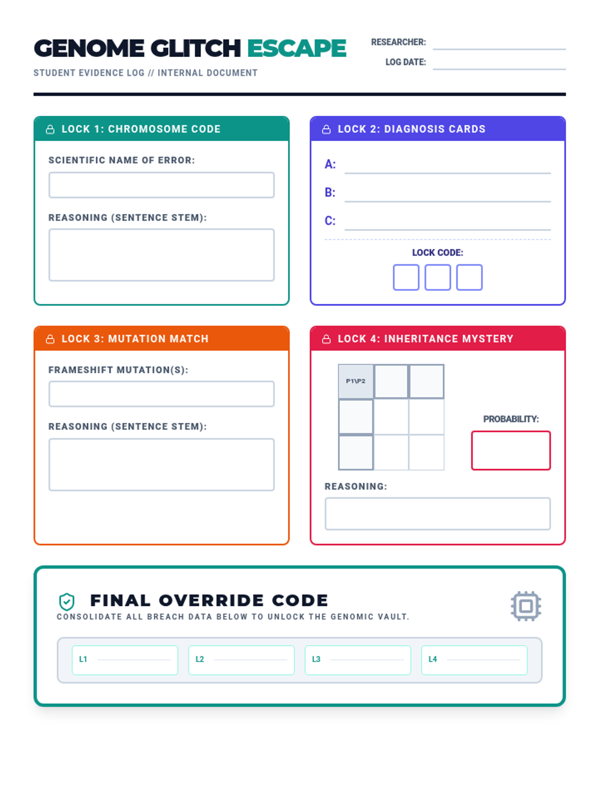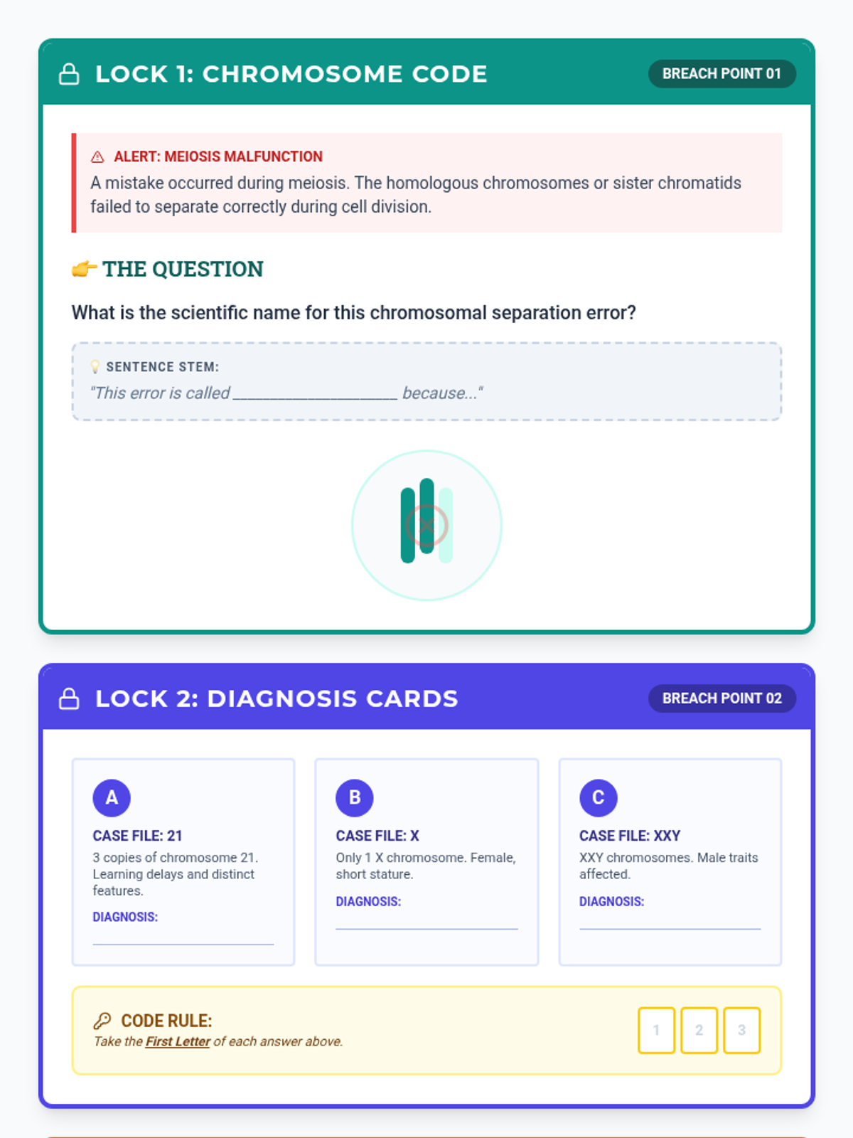 An immersive genetics escape room activity where students solve puzzles related to chromosomal errors, mutations, and inheritance patterns to 'unlock' a breached genomic system.