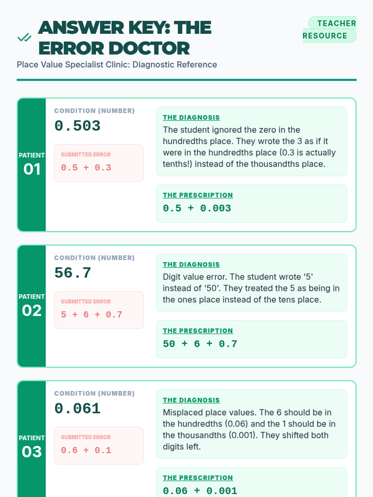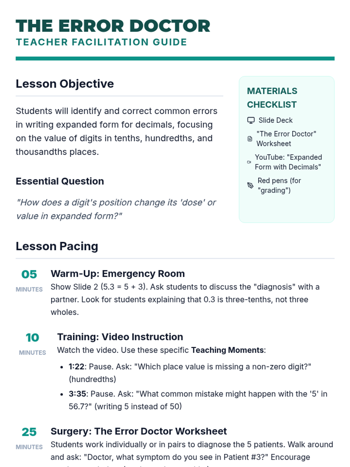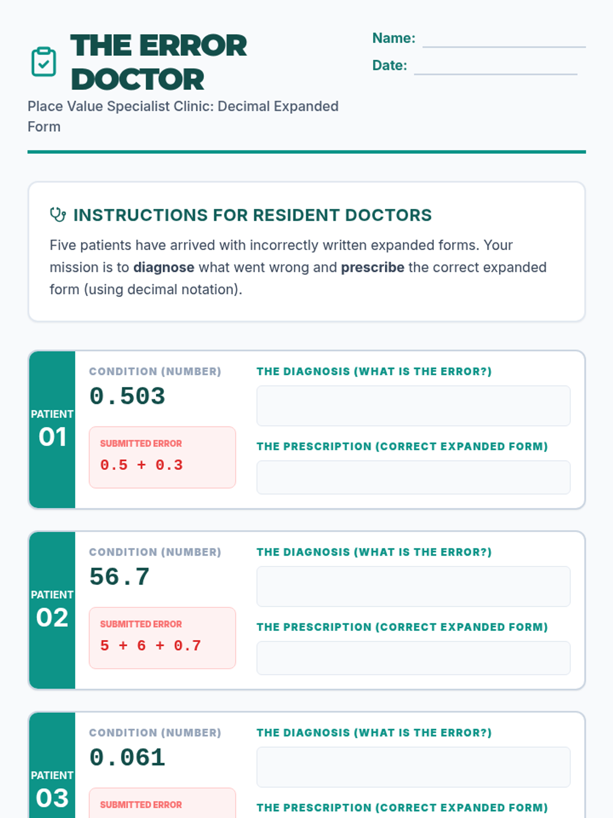 Students become 'Error Doctors' to diagnose and correct common misconceptions in decimal expanded form, focusing on place value accuracy and the role of zeros.