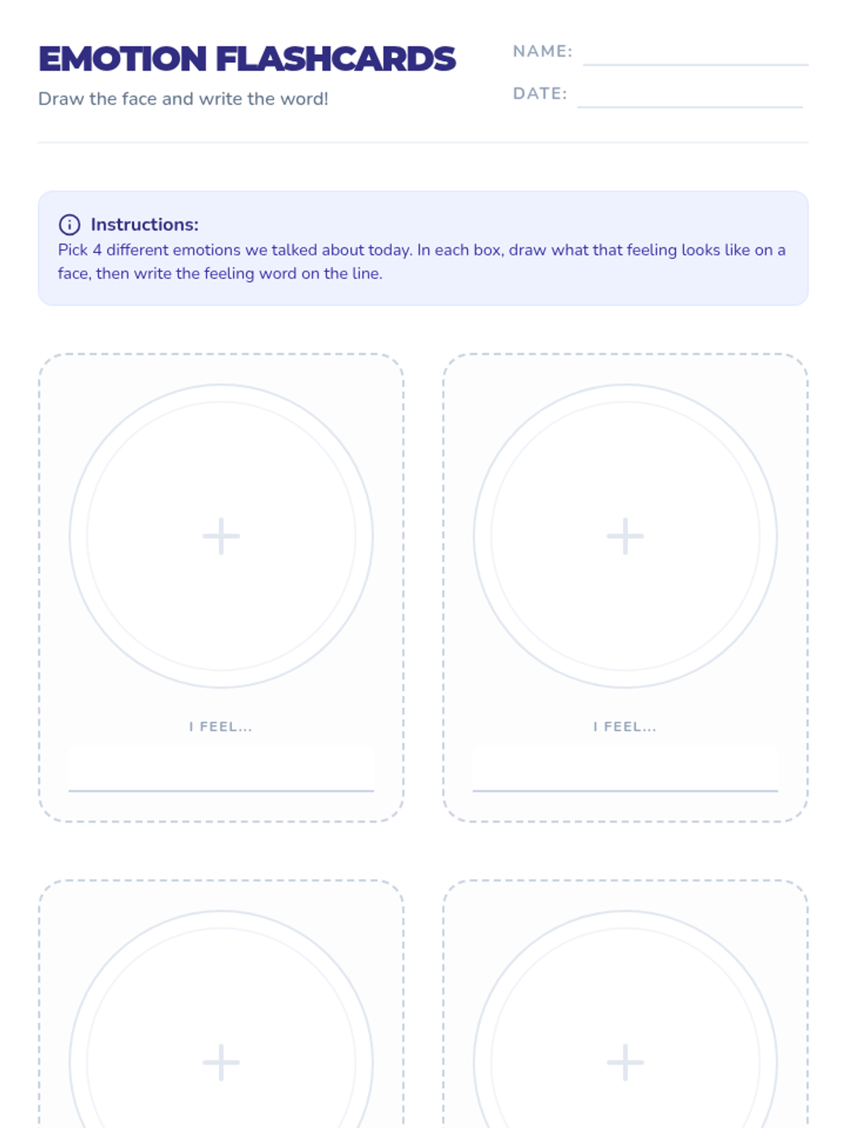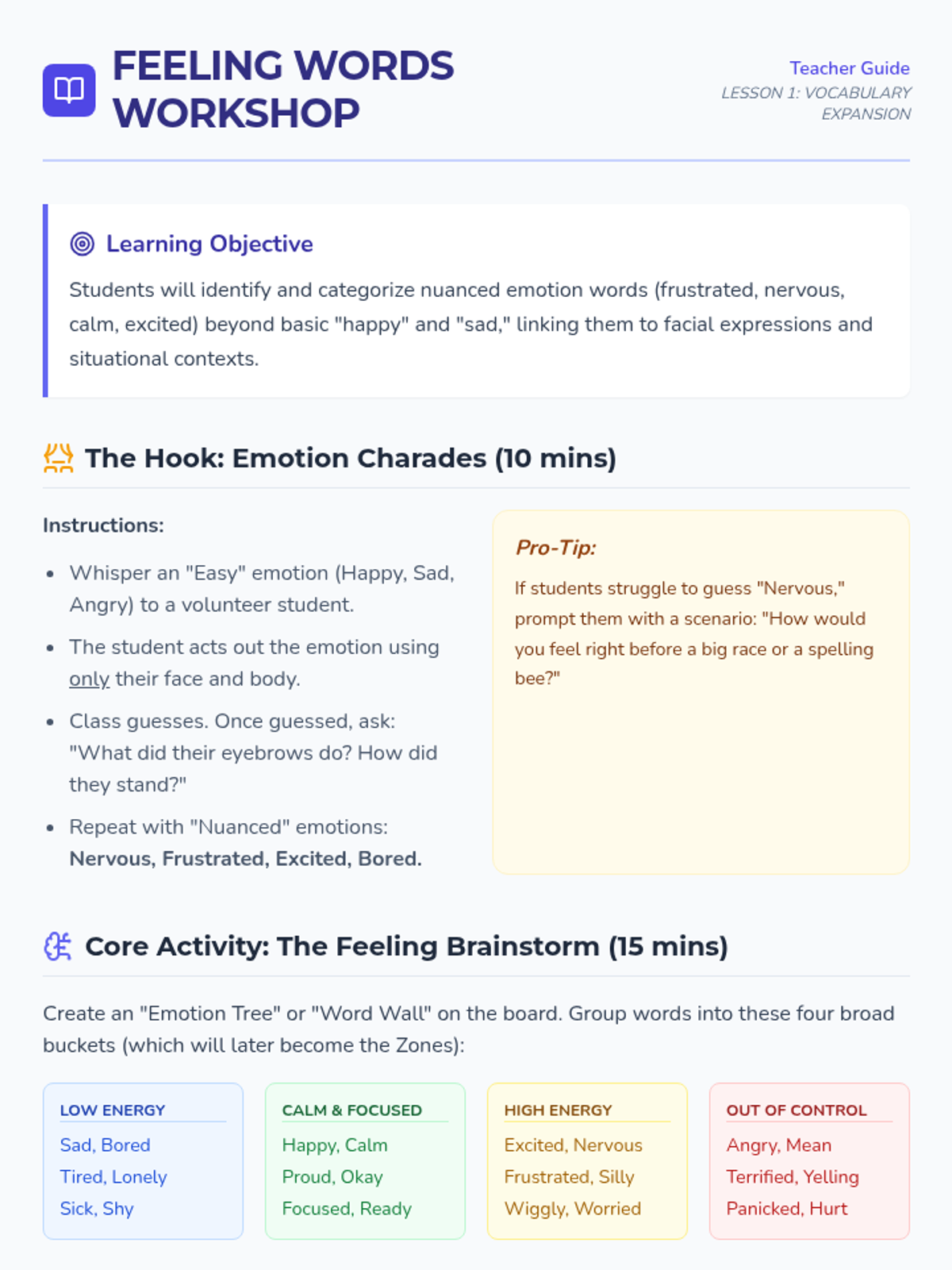Students participate in a workshop to brainstorm and categorize feeling words, moving beyond basic emotions to more nuanced terms like 'frustrated,' 'excited,' and 'nervous.' They create personal emotion flashcards that link words to facial expressions.