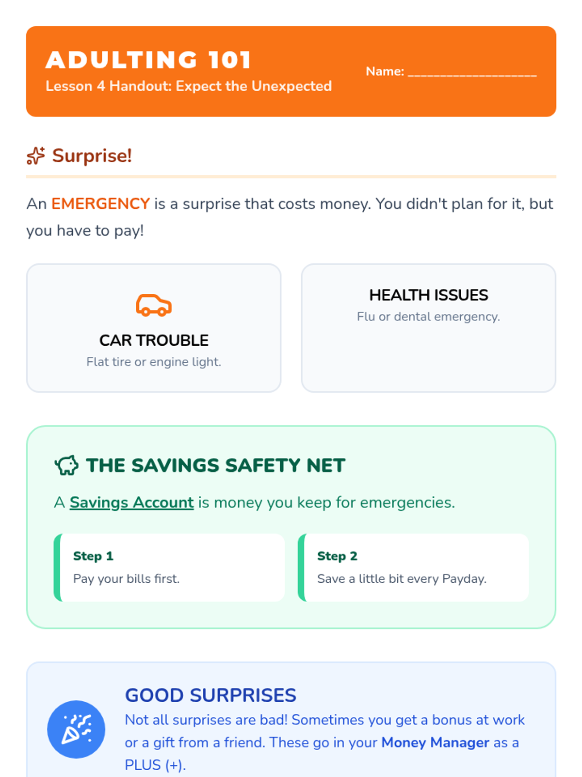 Introducing random life events and emergencies to teach students about the importance of savings and adaptability.