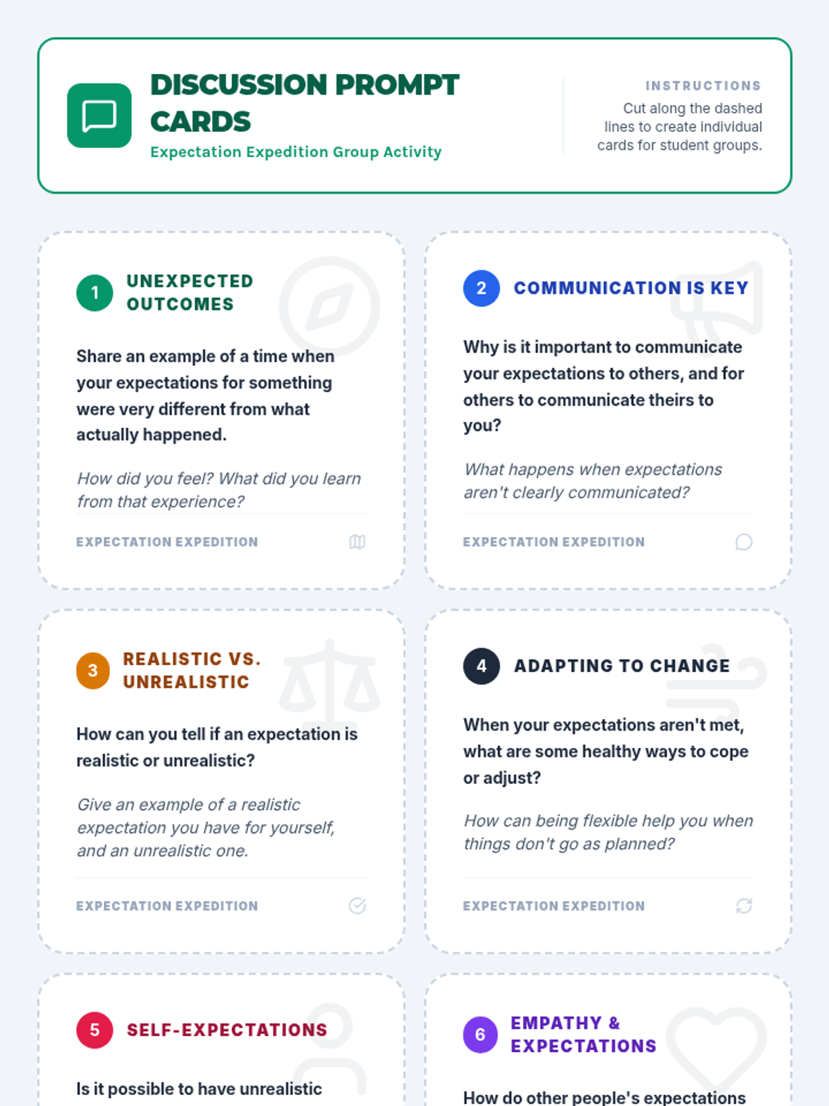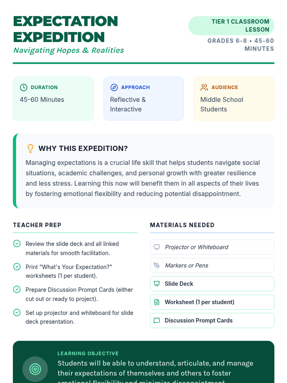 A 45-60 minute lesson for middle schoolers on identifying, articulating, and managing expectations to build emotional resilience and reduce disappointment.