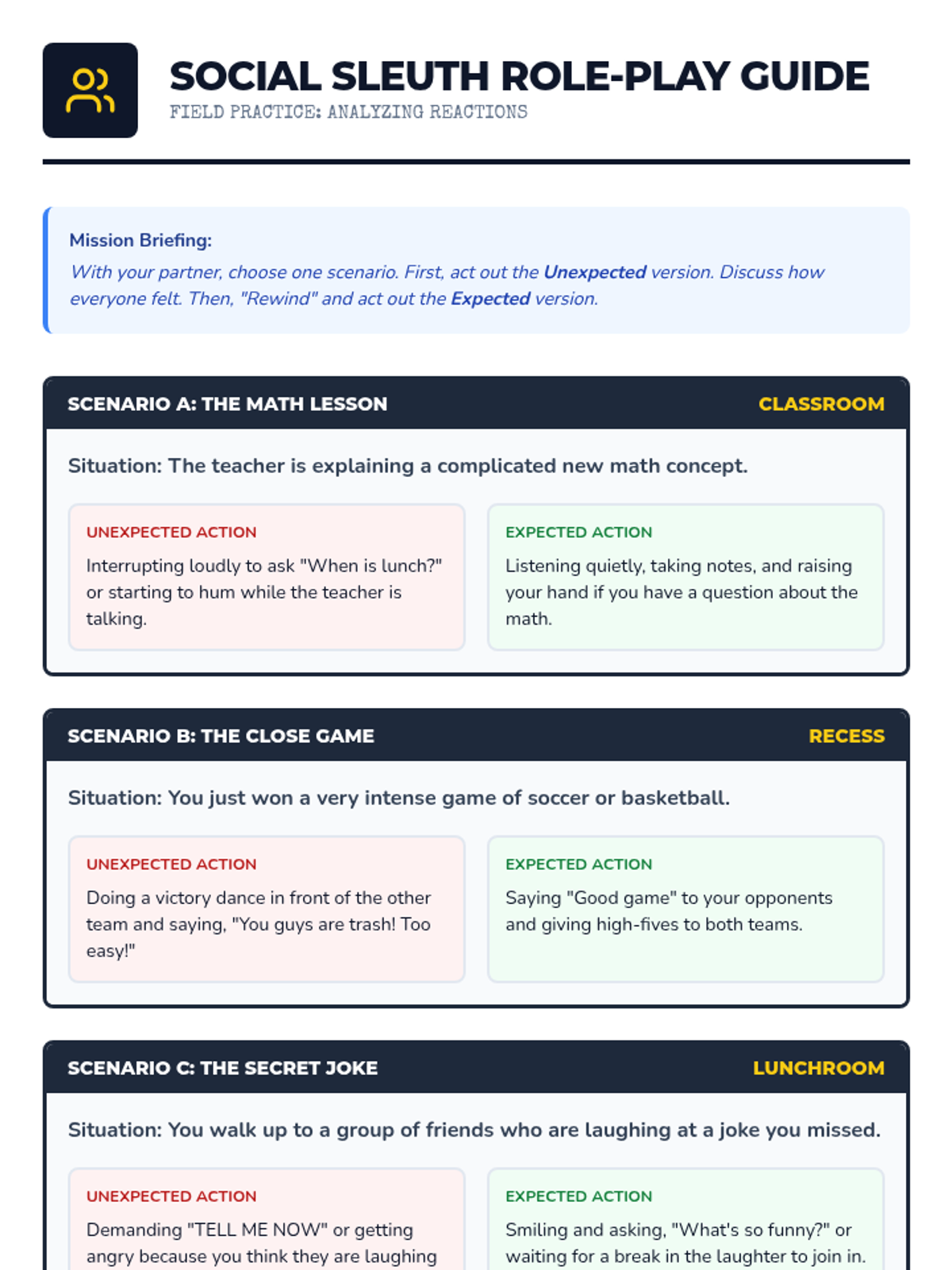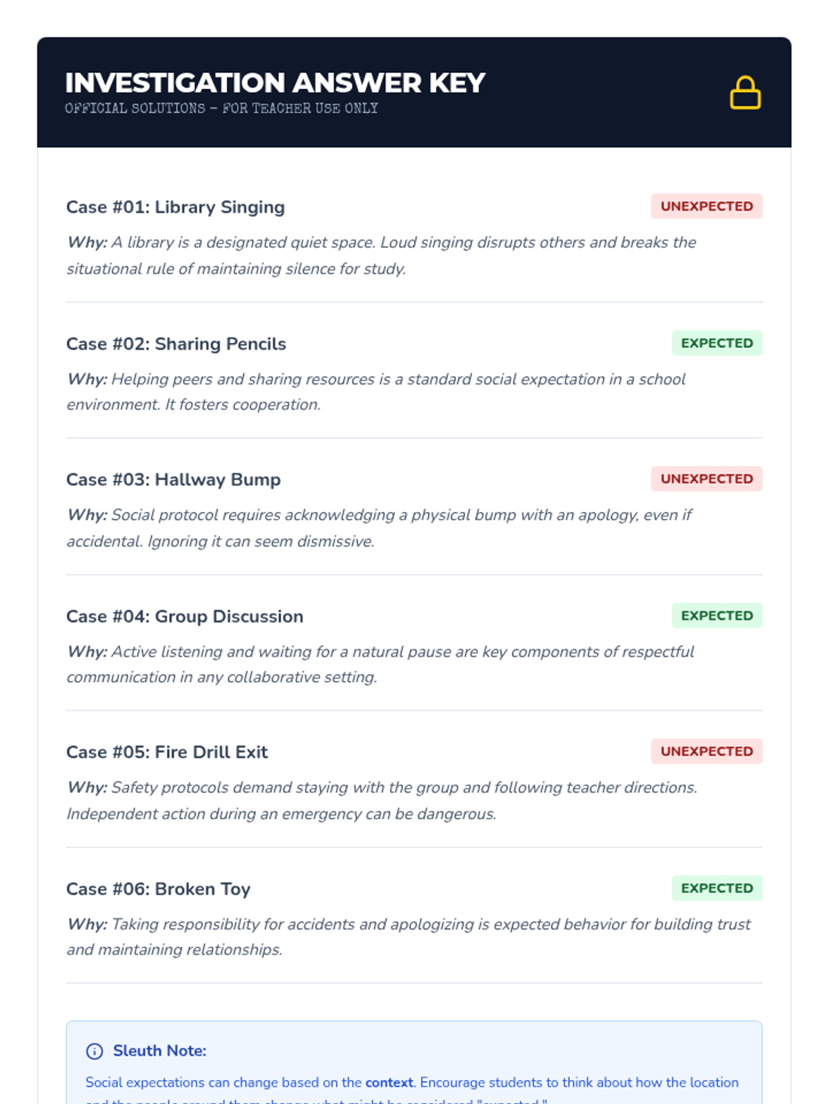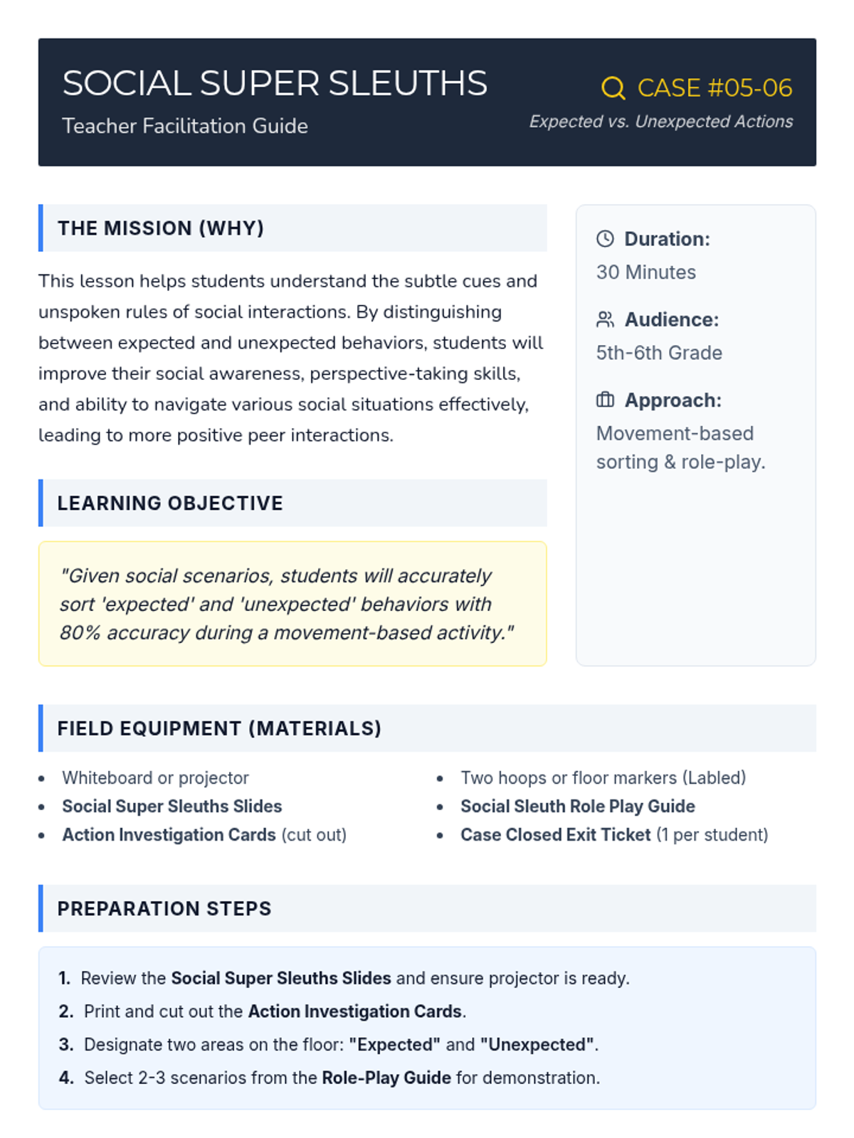 A 30-minute social-emotional learning lesson for 5th-6th graders focused on identifying and understanding expected versus unexpected social behaviors to improve social awareness and perspective-taking.