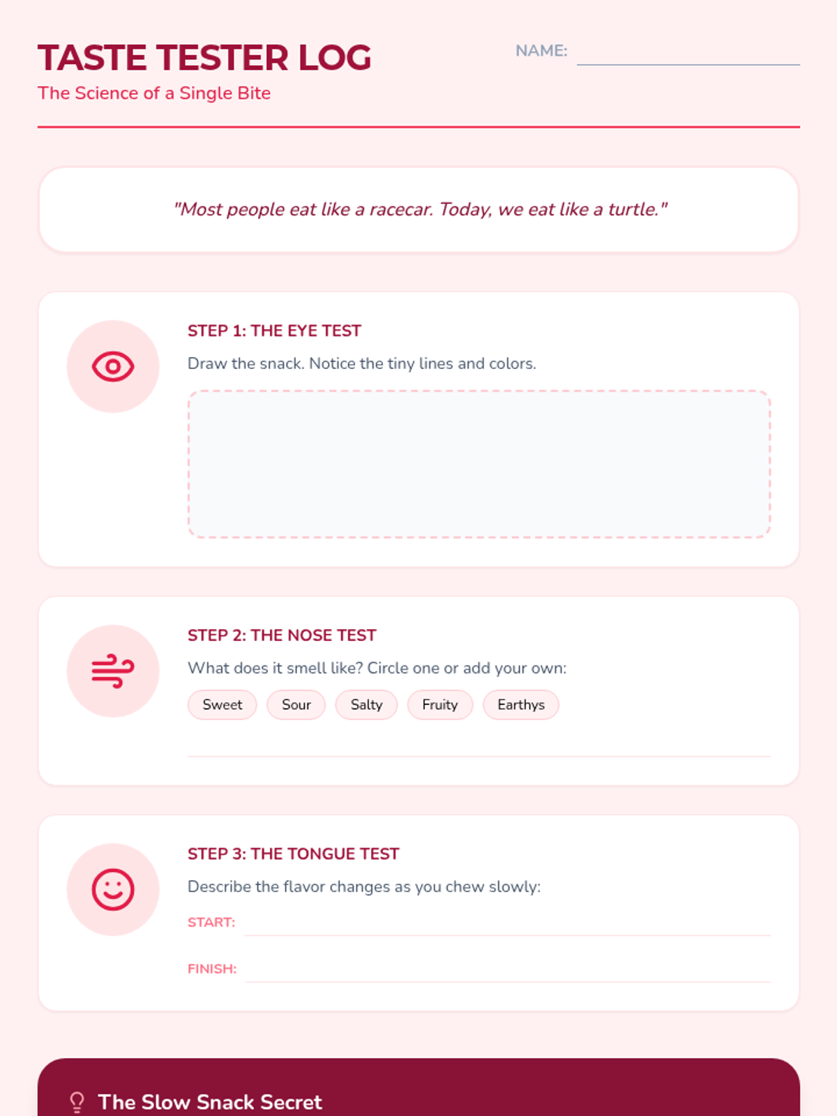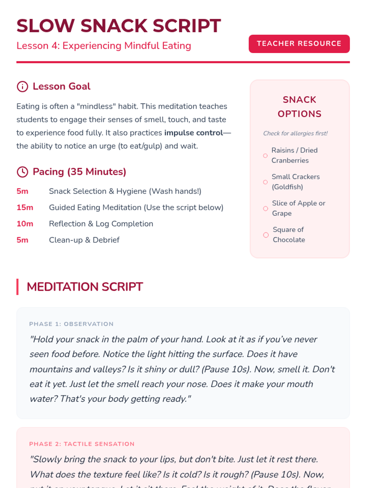 Students use a piece of fruit or a cracker to practice a slow, guided eating meditation. They notice smell, texture, and flavor changes, learning how slowing down enhances awareness.